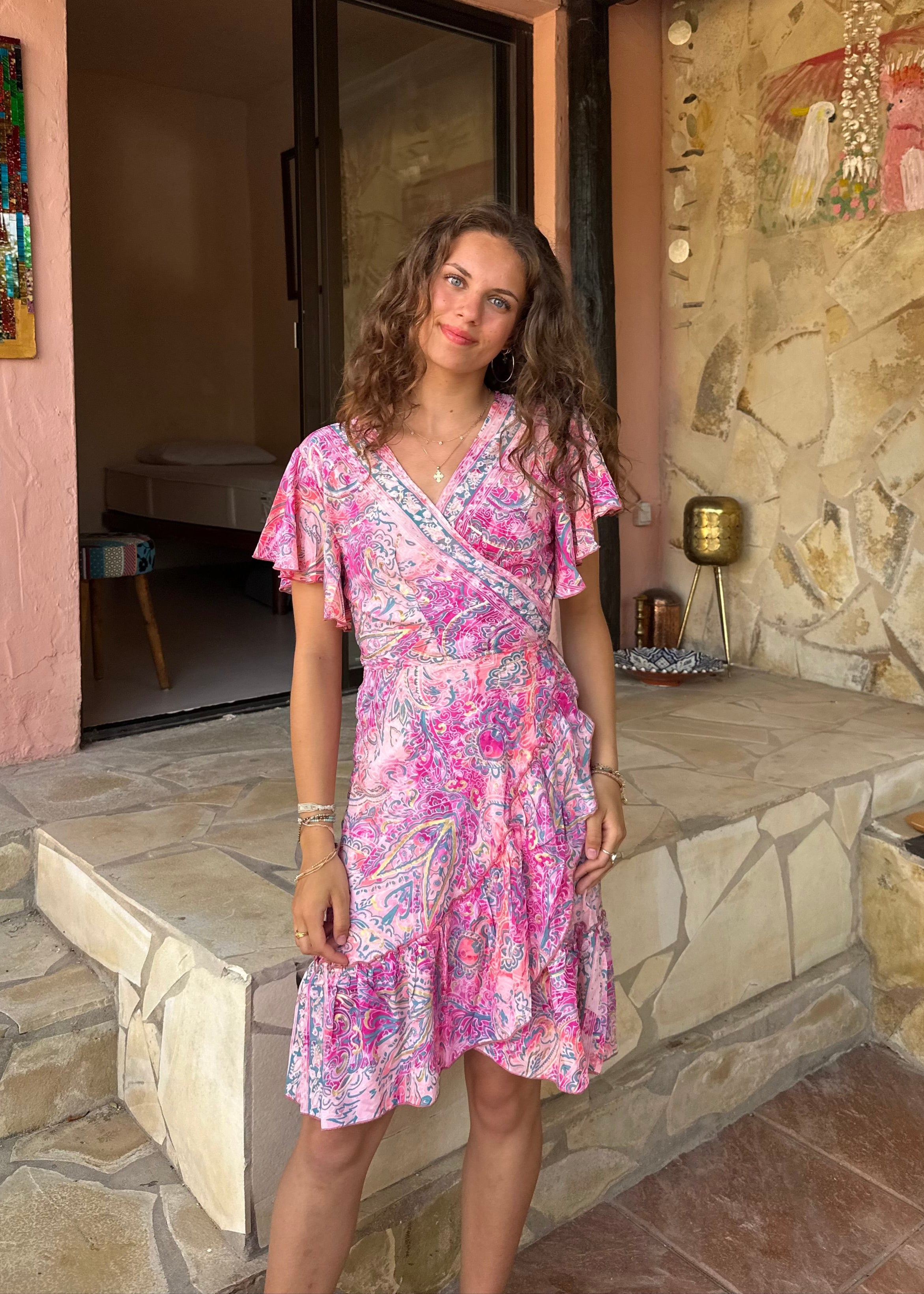 Short Wrap Dress Rosa (Gold Foil) - Pink / Yellow