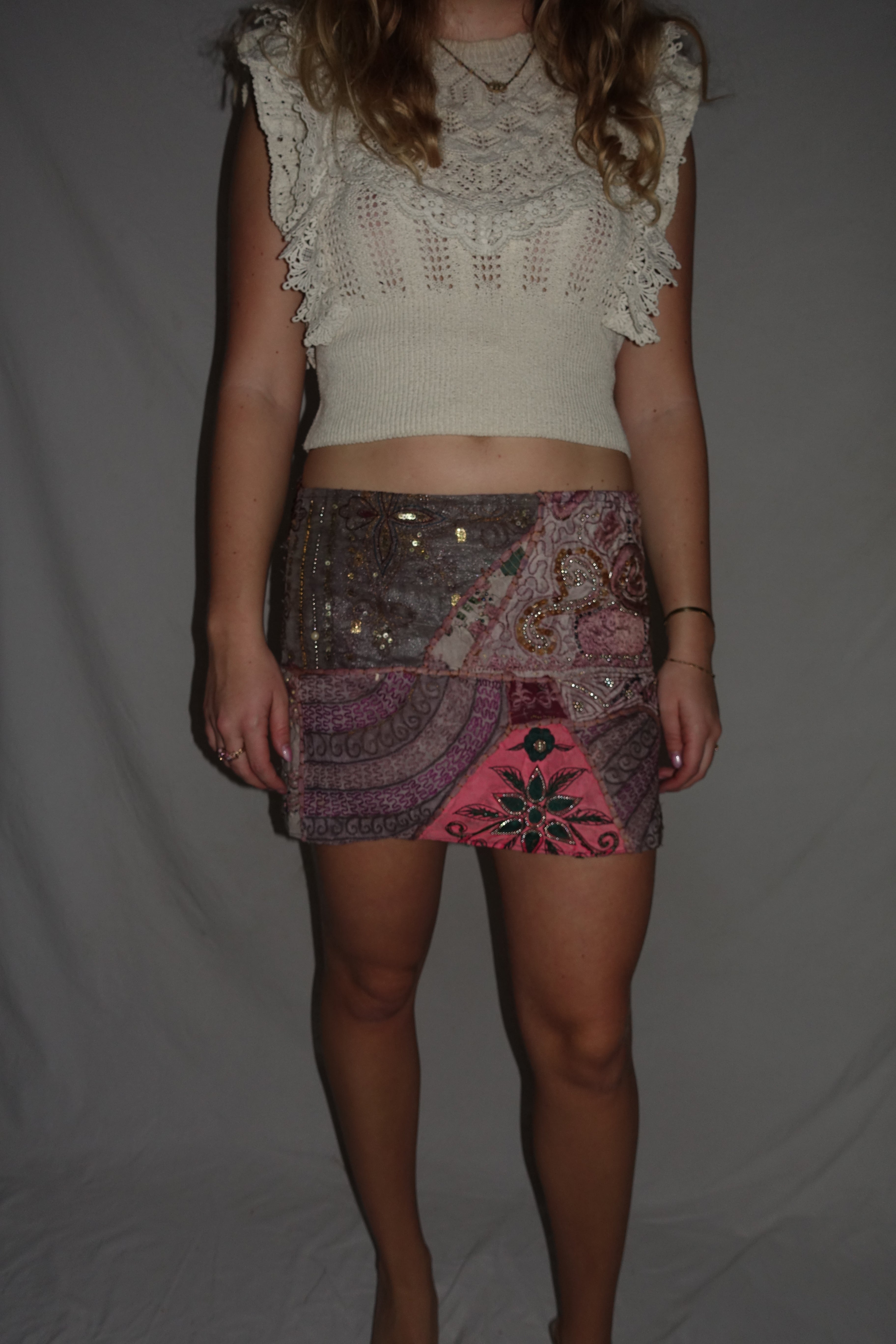 Vintage Sari Beaded Patchwork Bohemian Skirt- Rose (XS-S)
