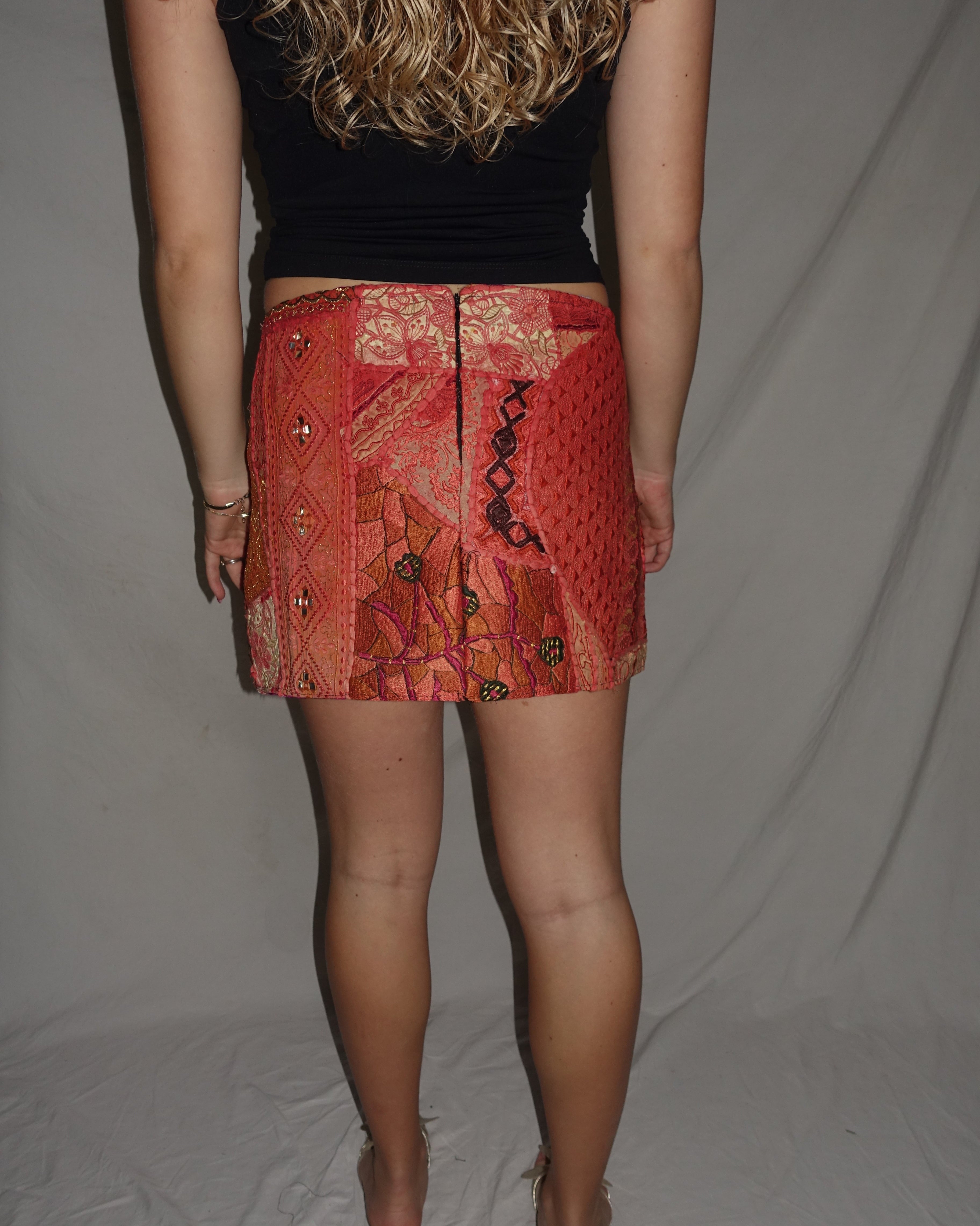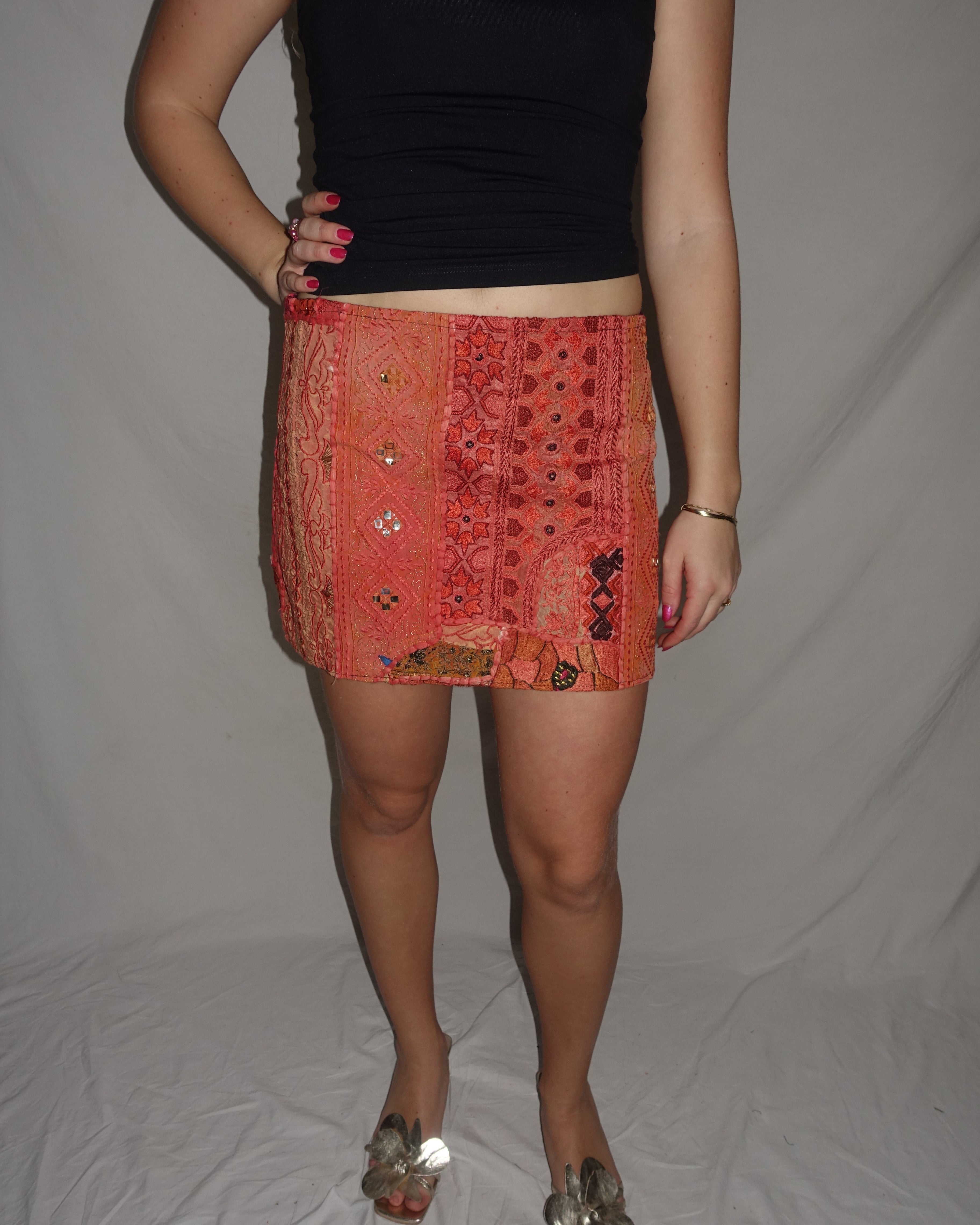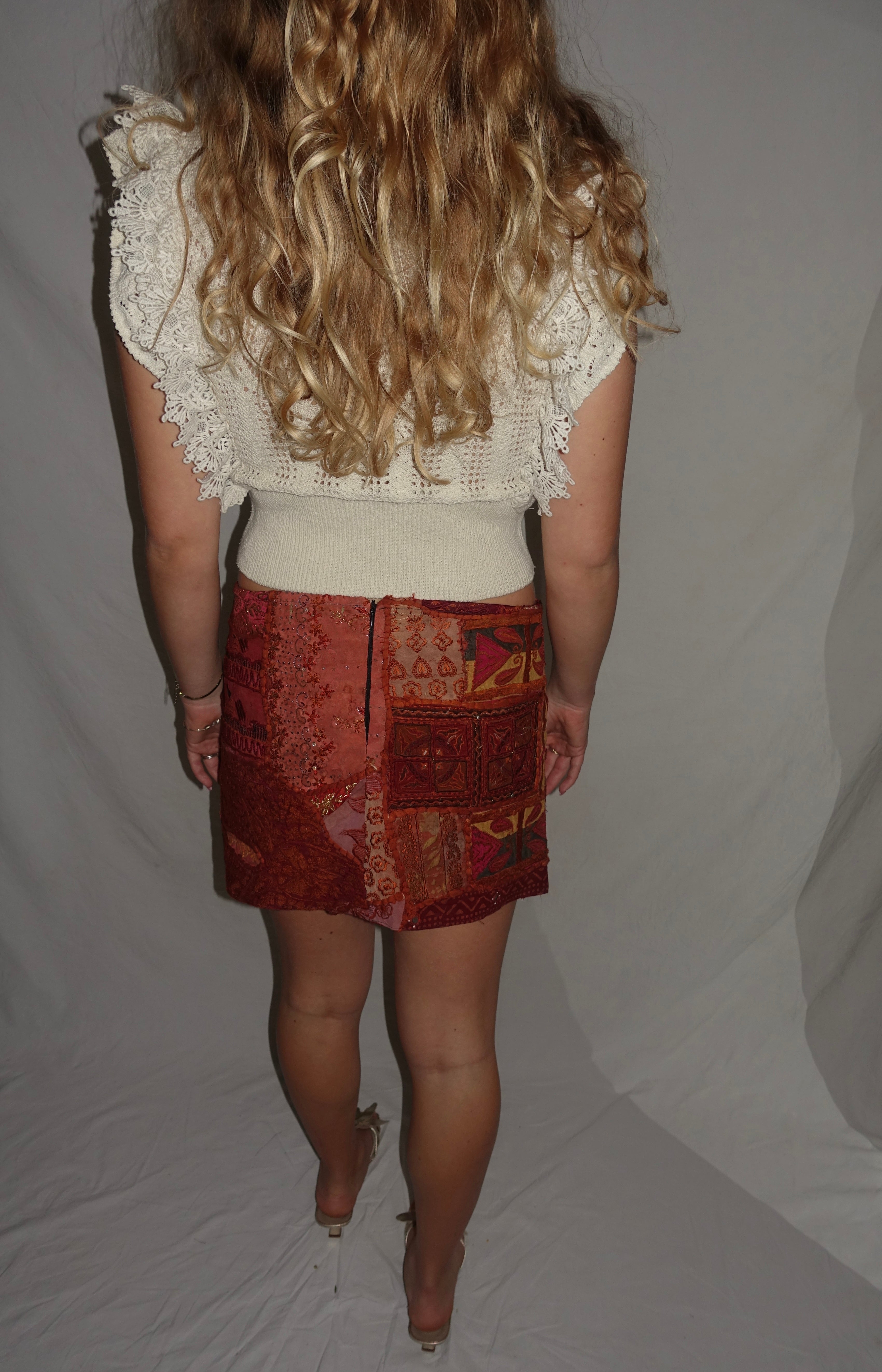 Vintage Sari Beaded Patchwork Bohemian Skirt - Reddish/Orange (XS-S)