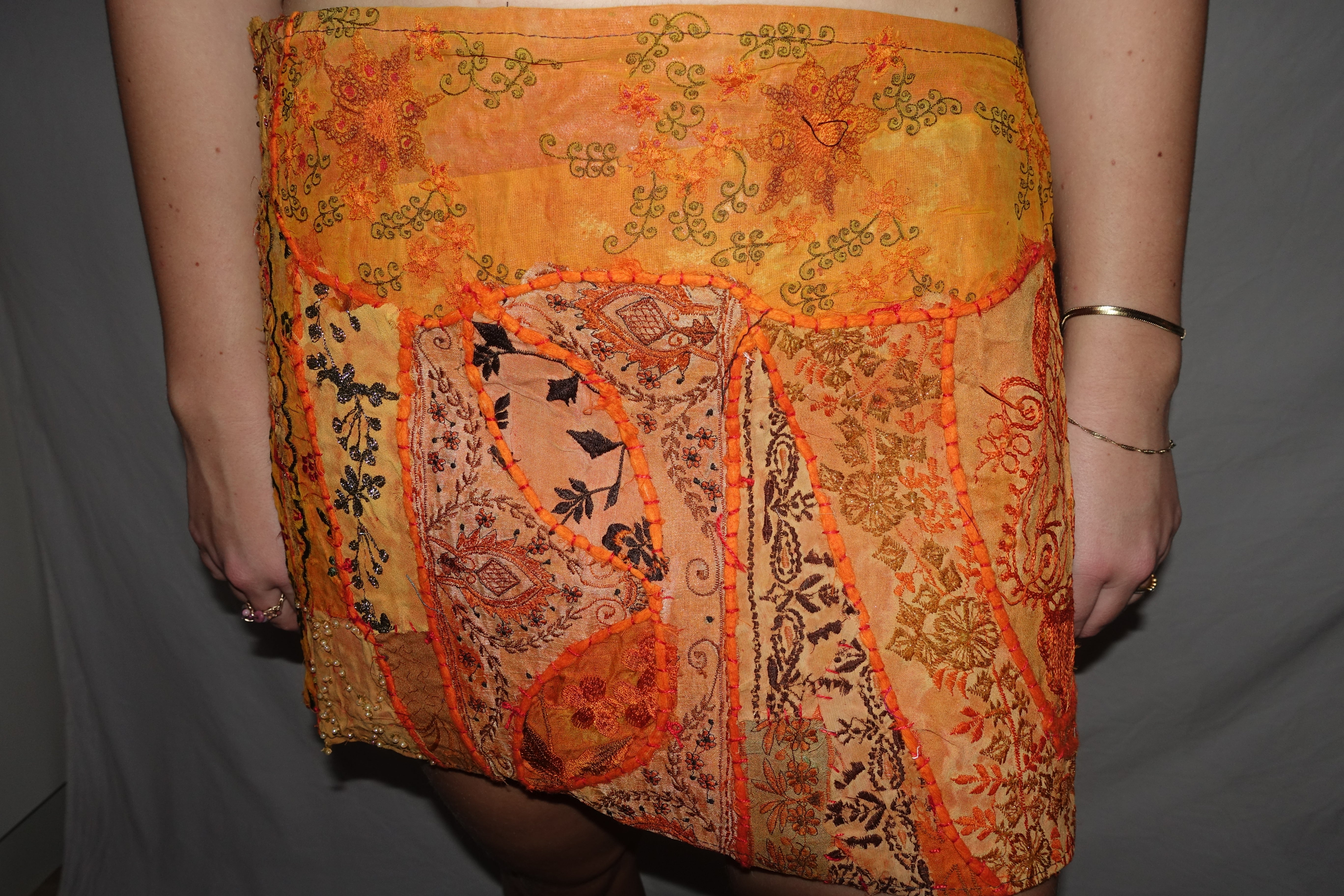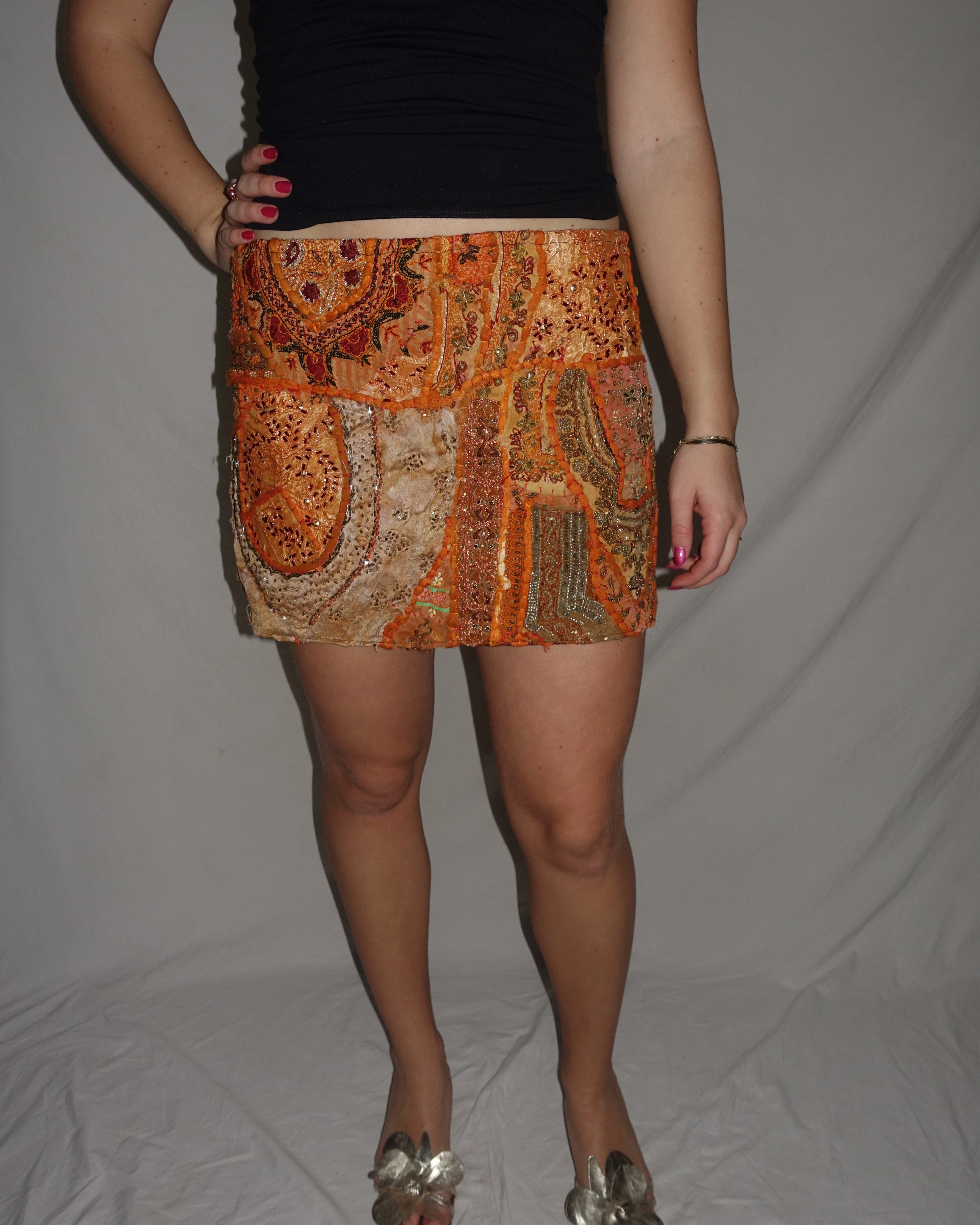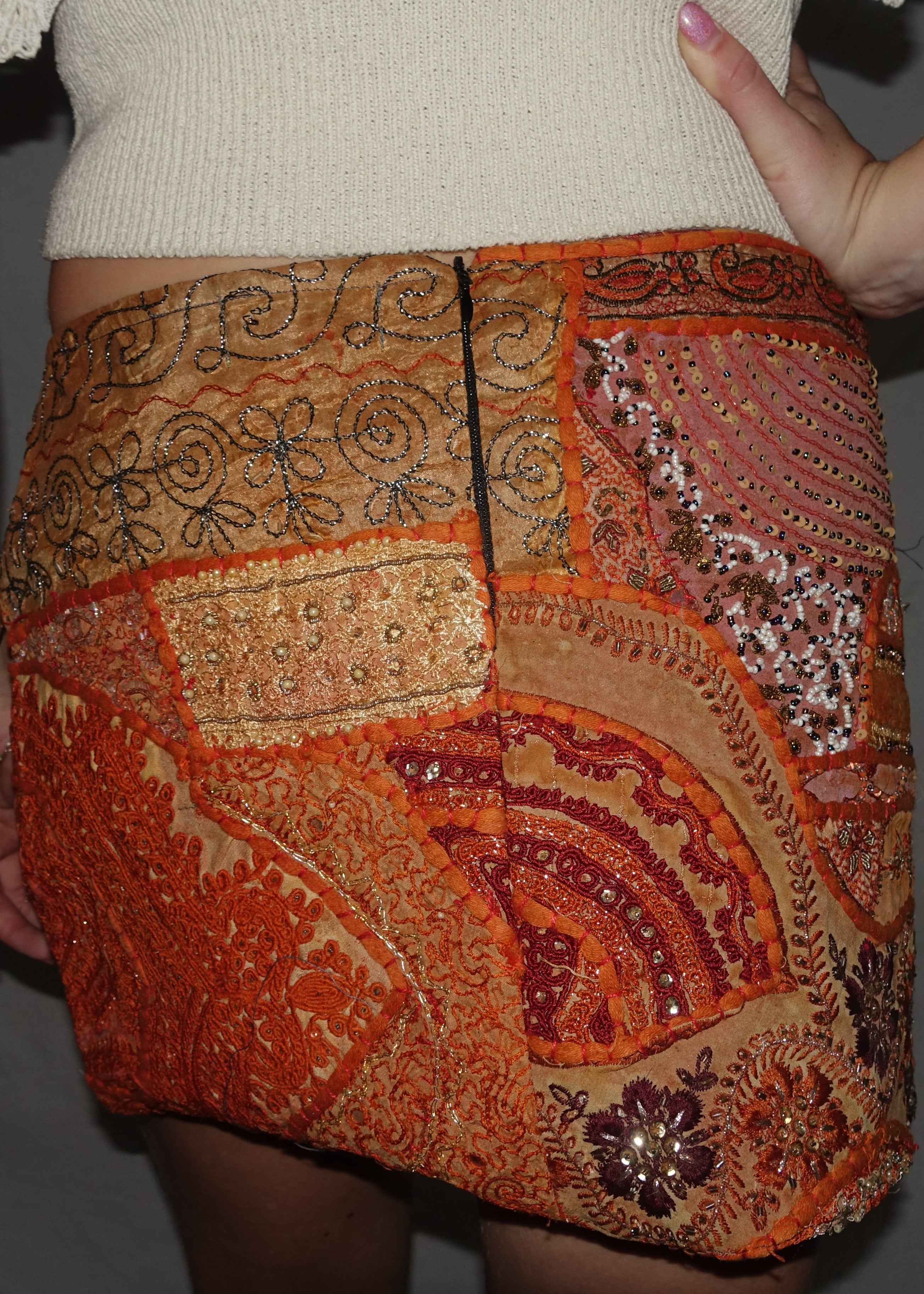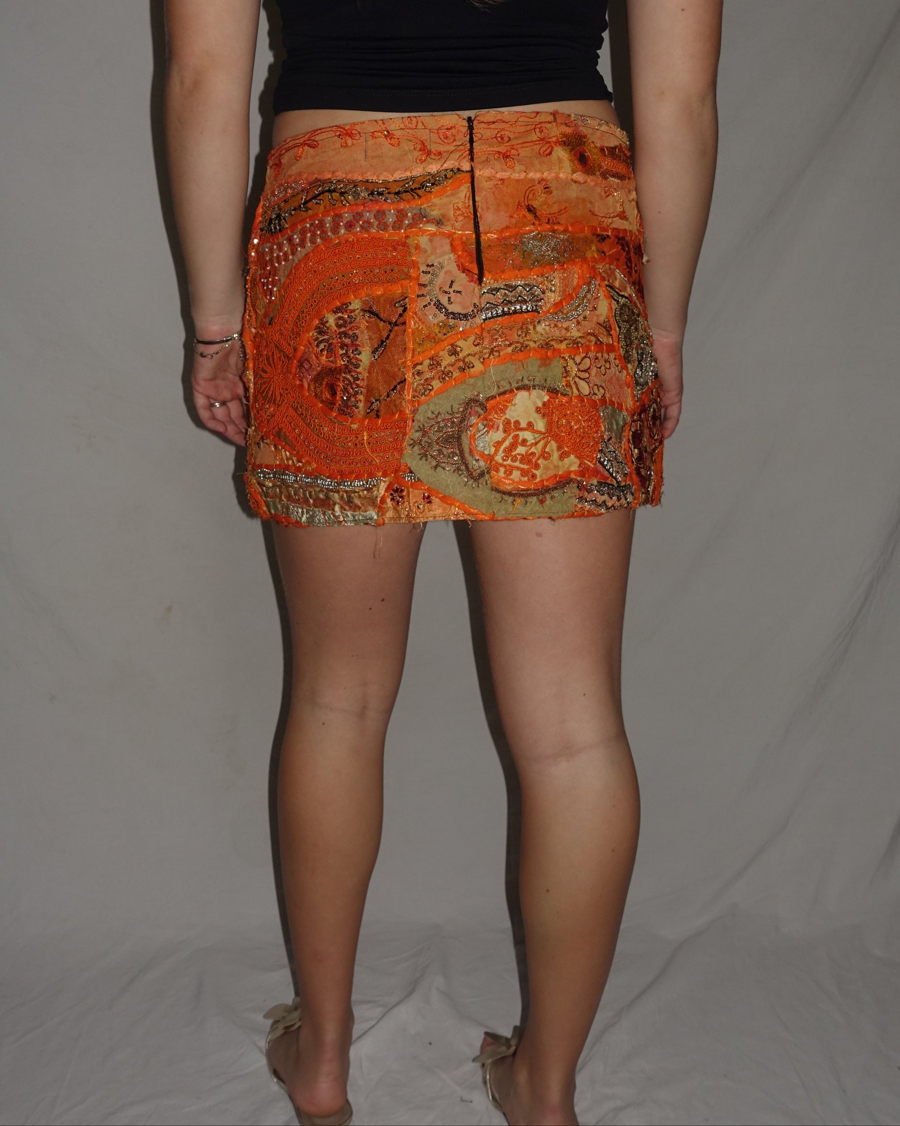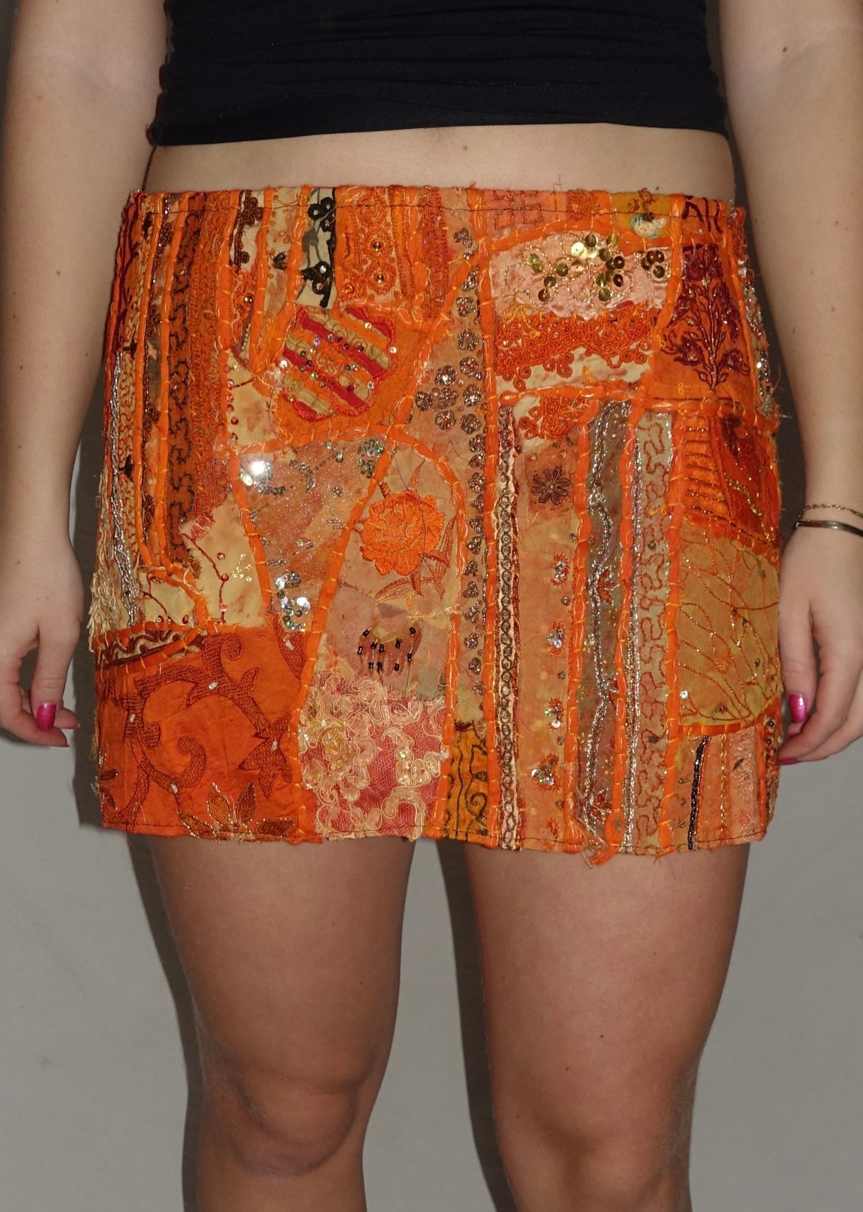Vintage Sari Beaded Patchwork Bohemian Skirt - Orange (XS-S)