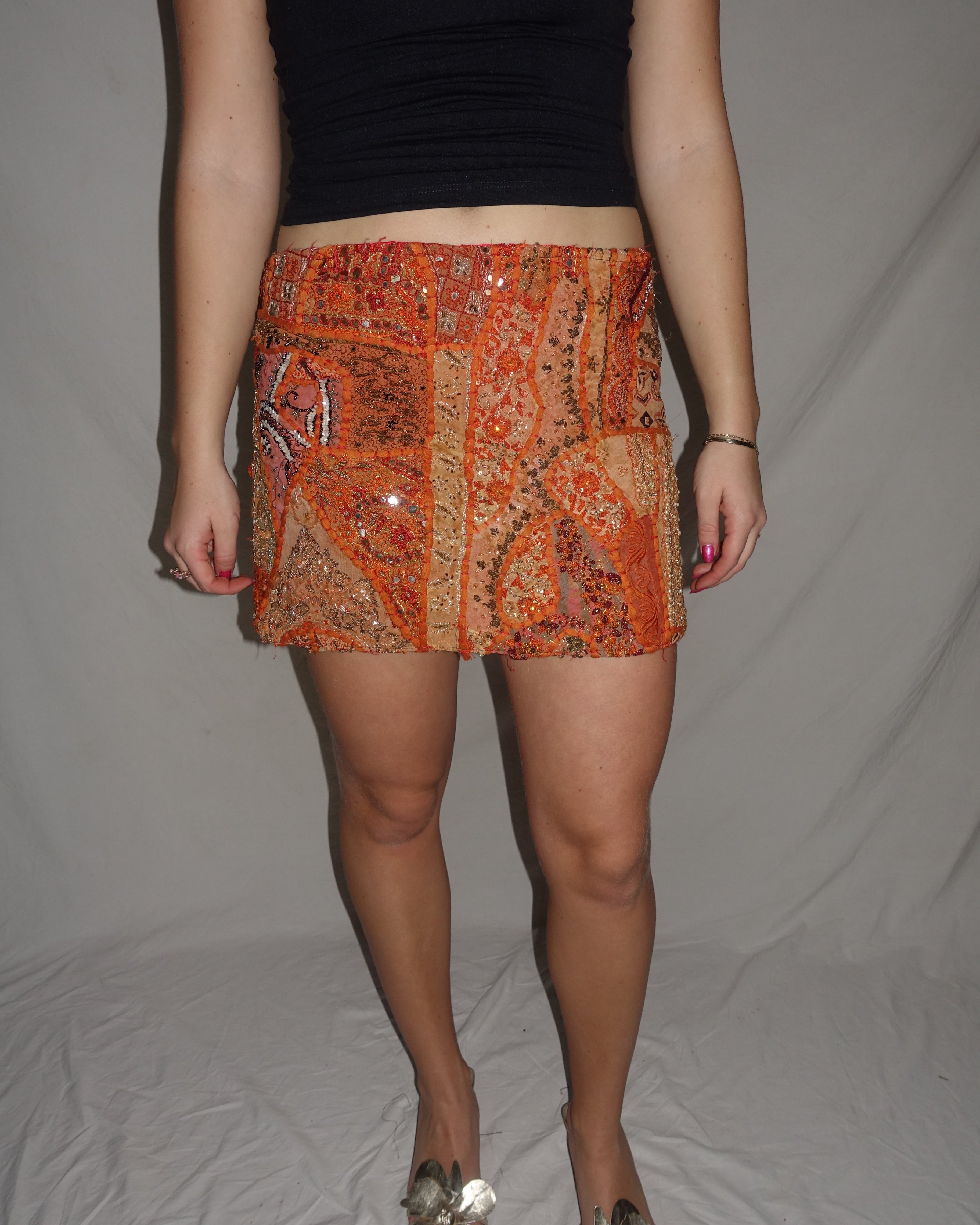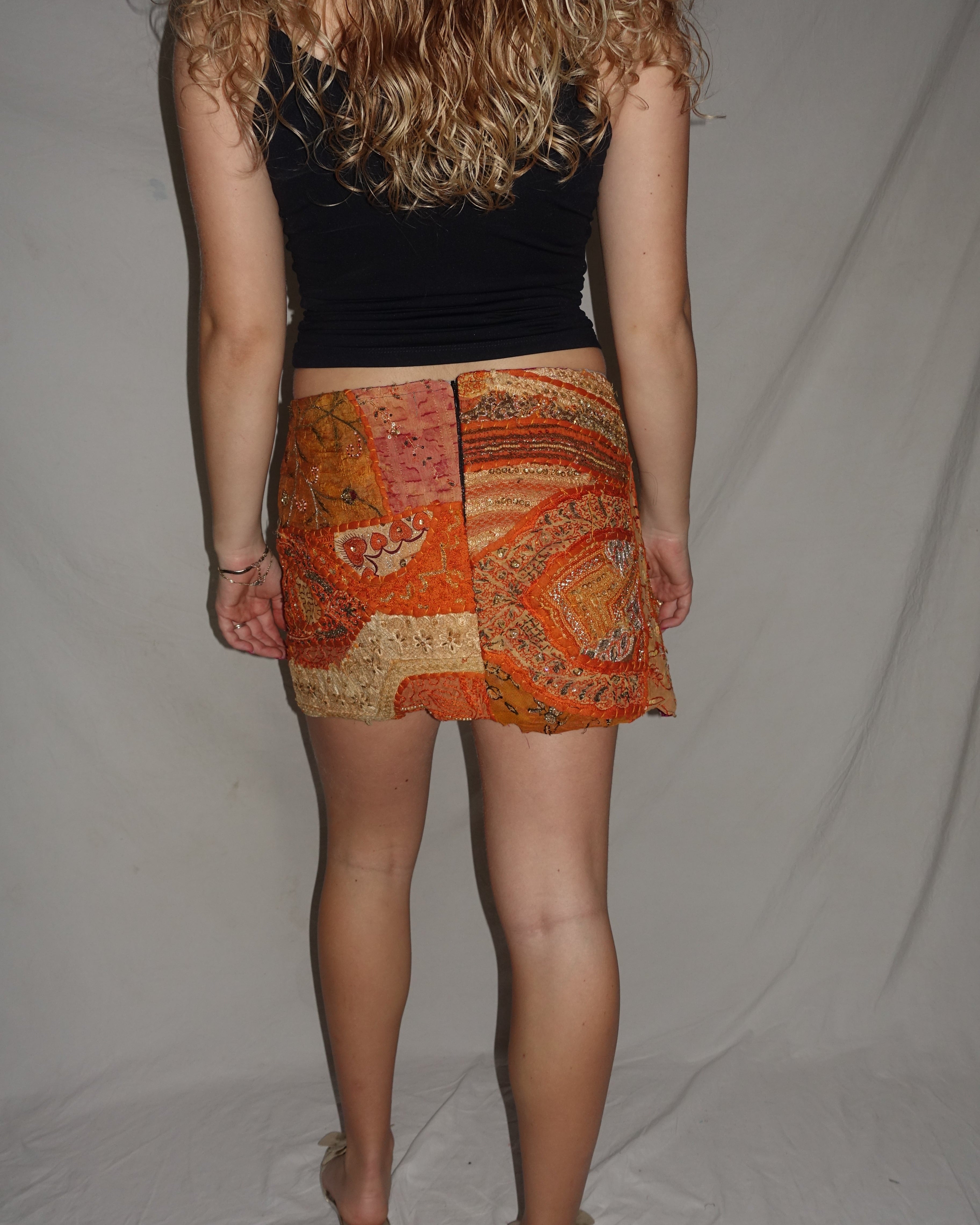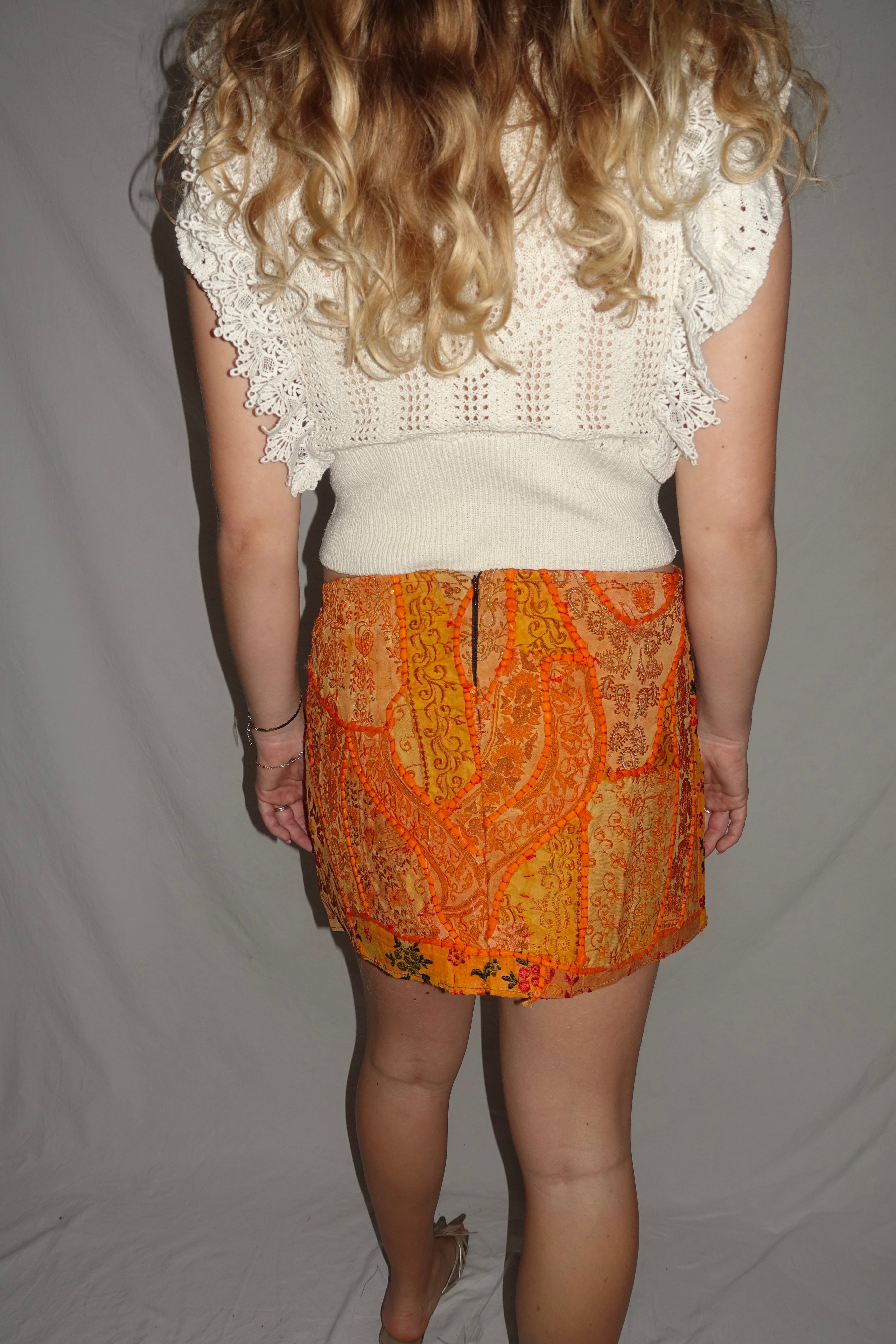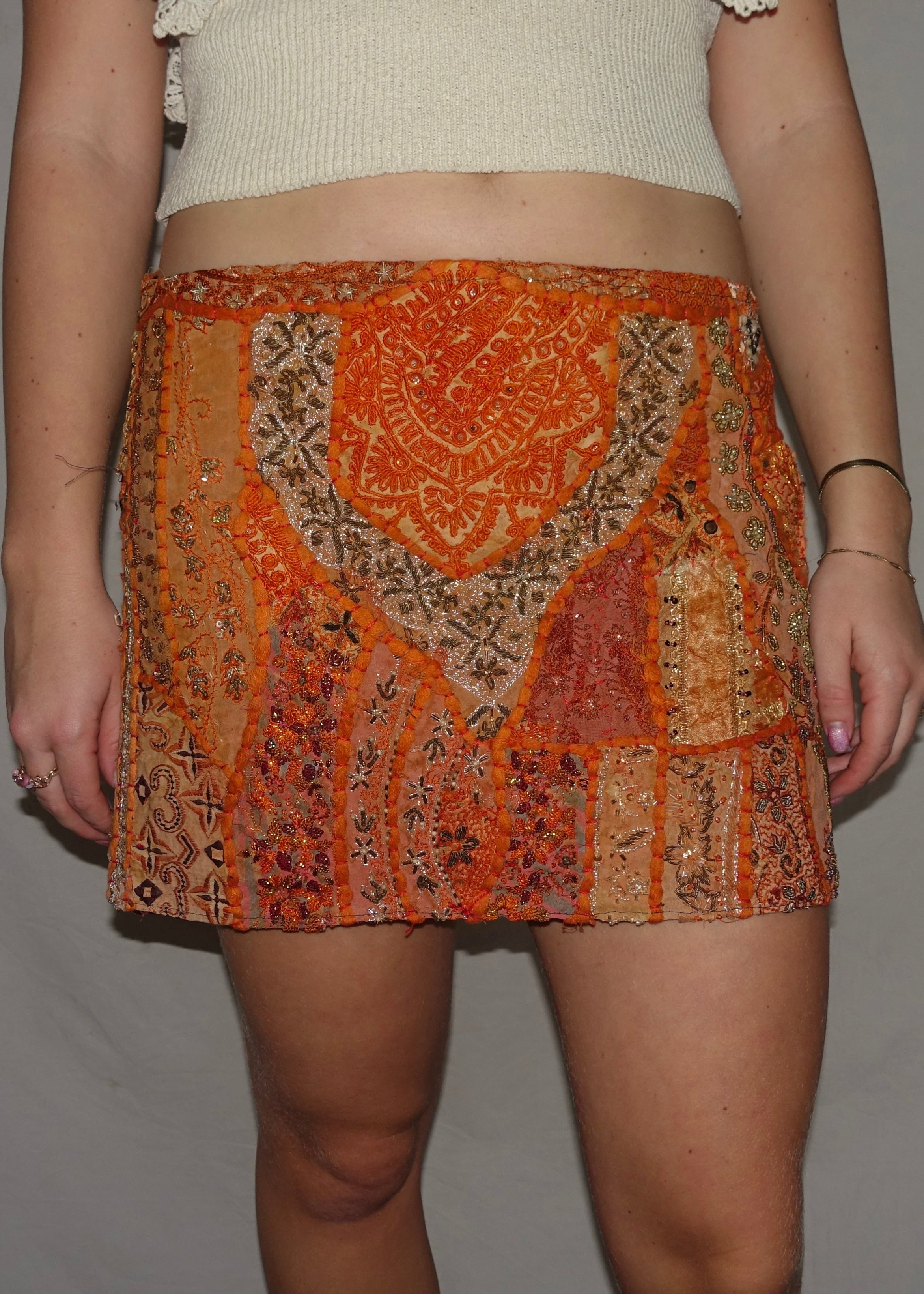 Vintage Sari Beaded Patchwork Bohemian Skirt - Orange (XS-S)