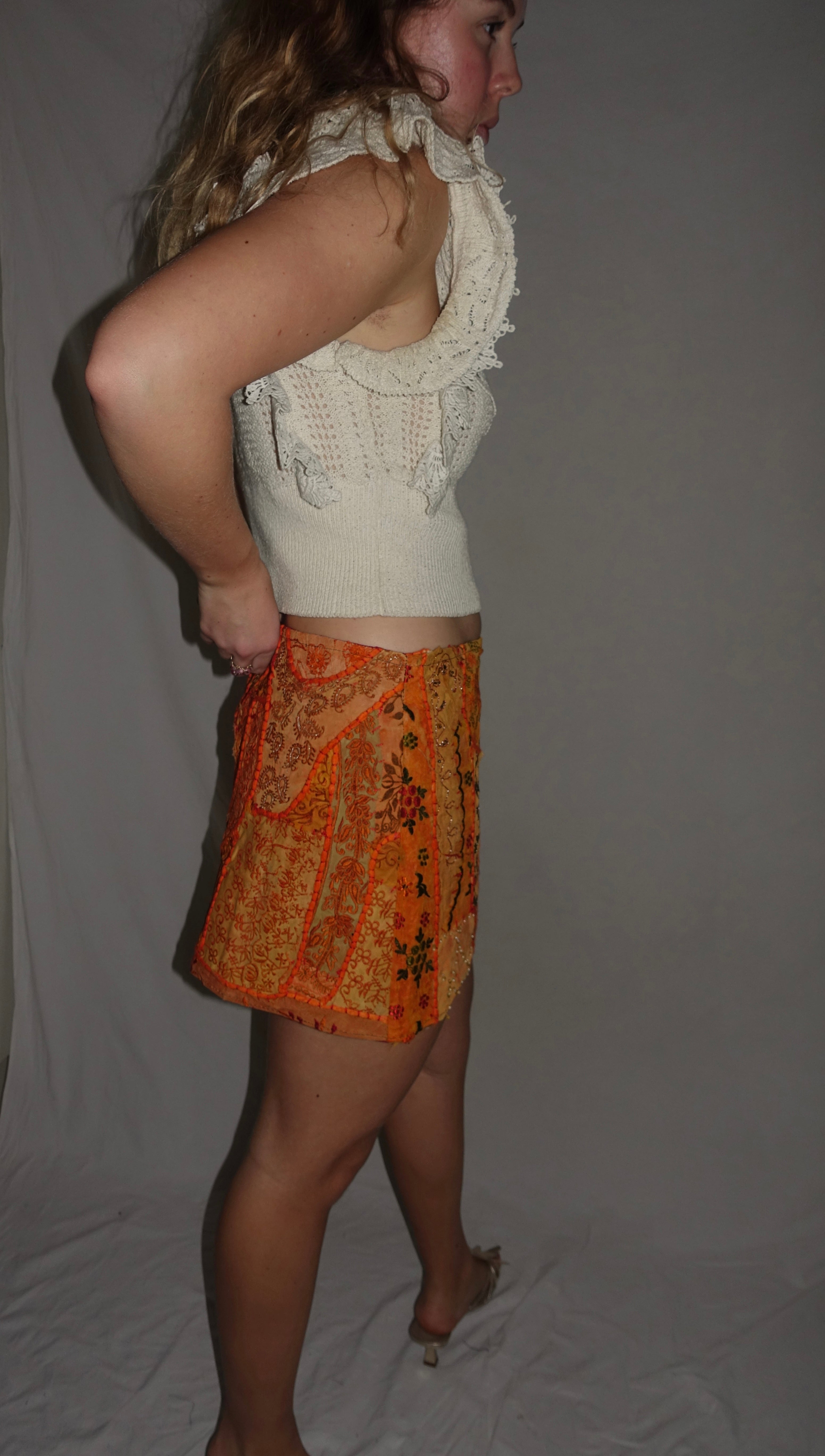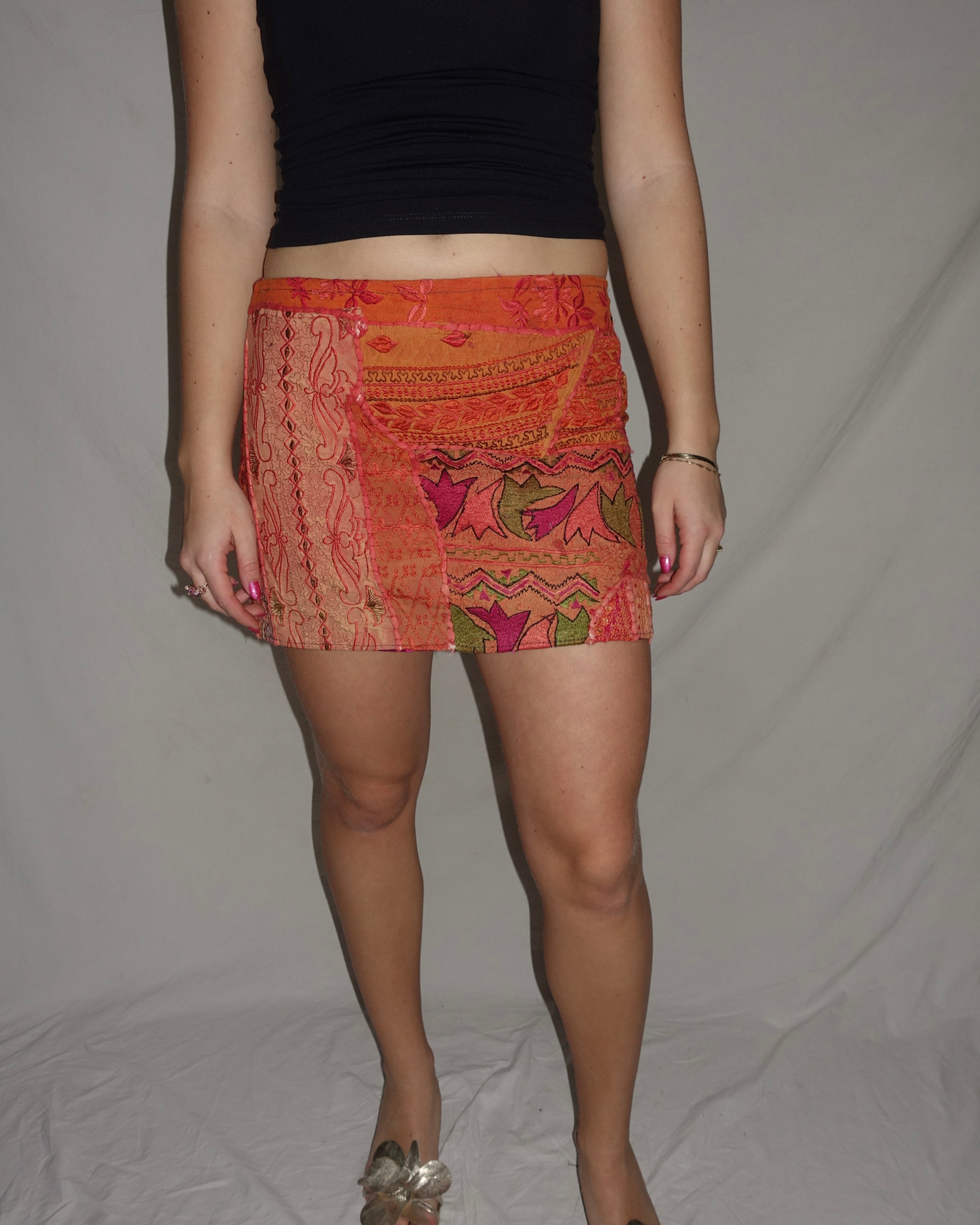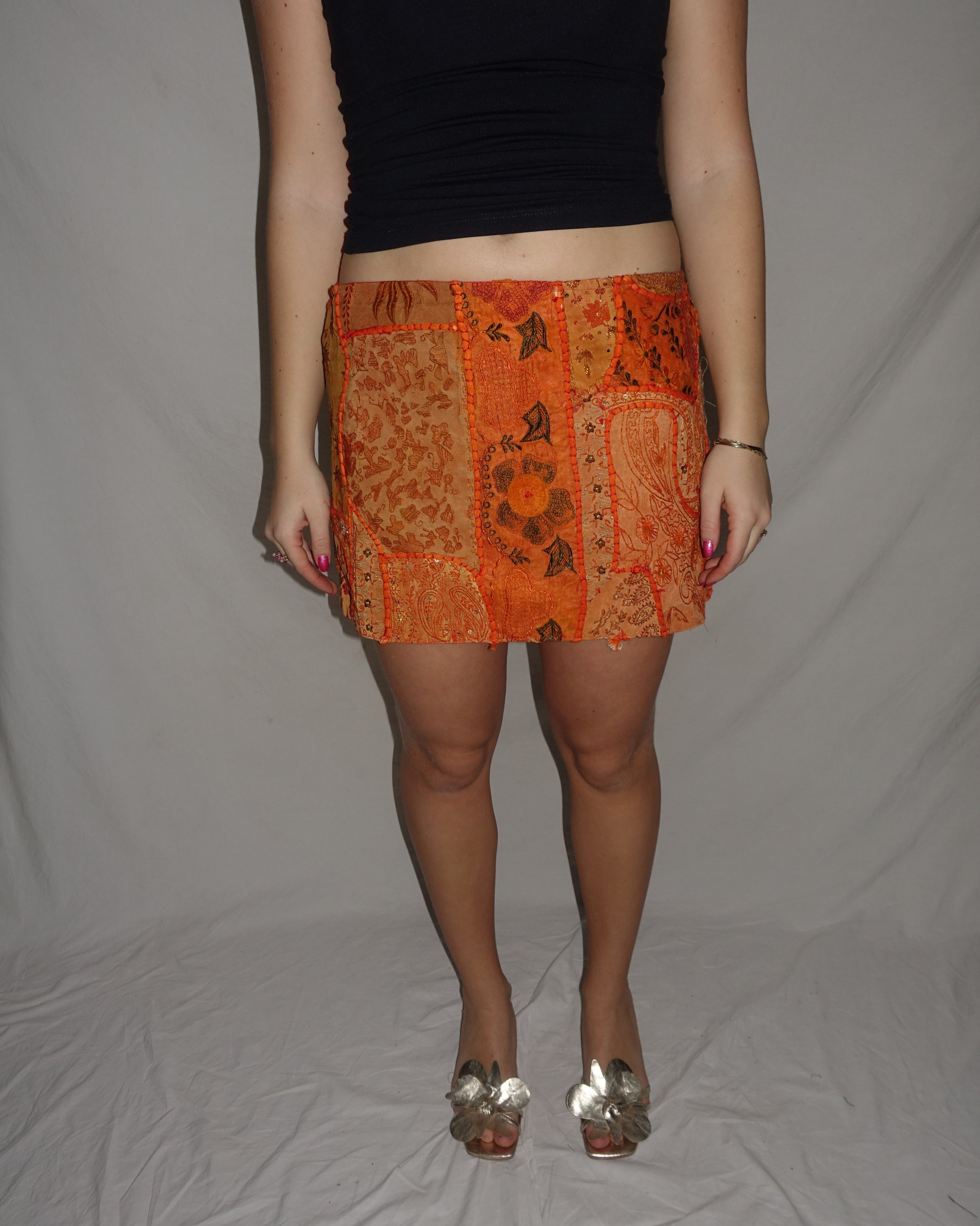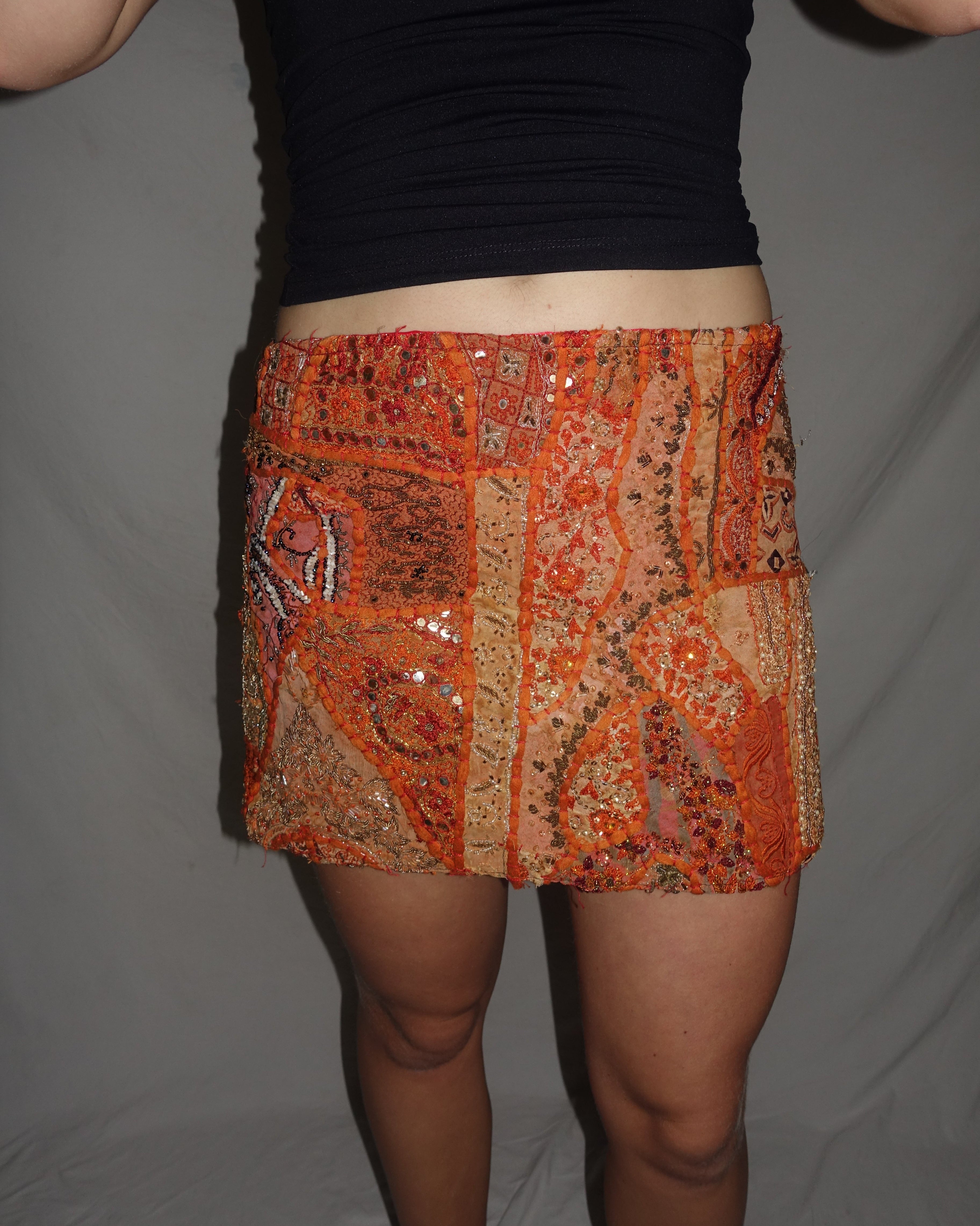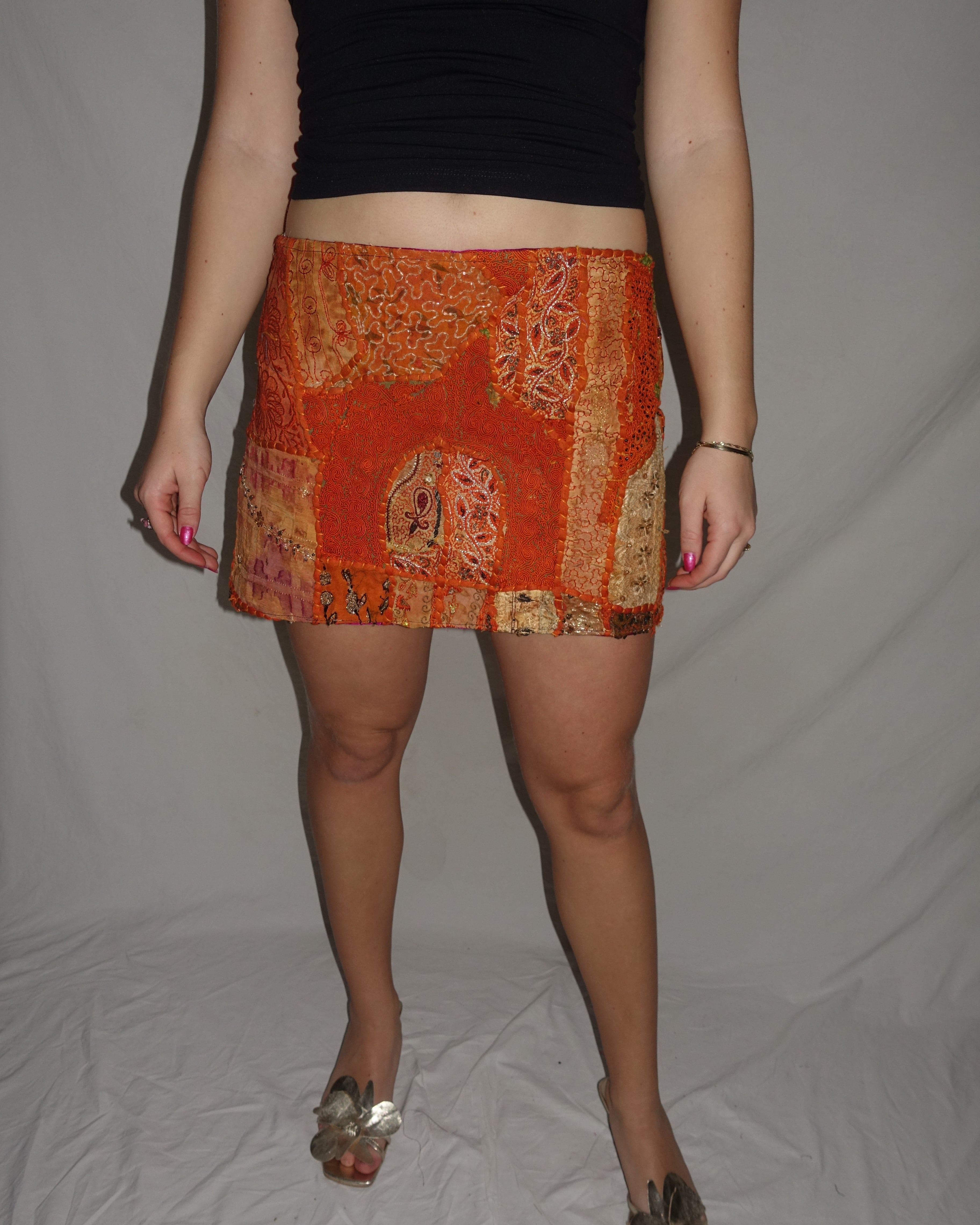 Vintage Sari Beaded Patchwork Bohemian Skirt - Orange (XS-S)
