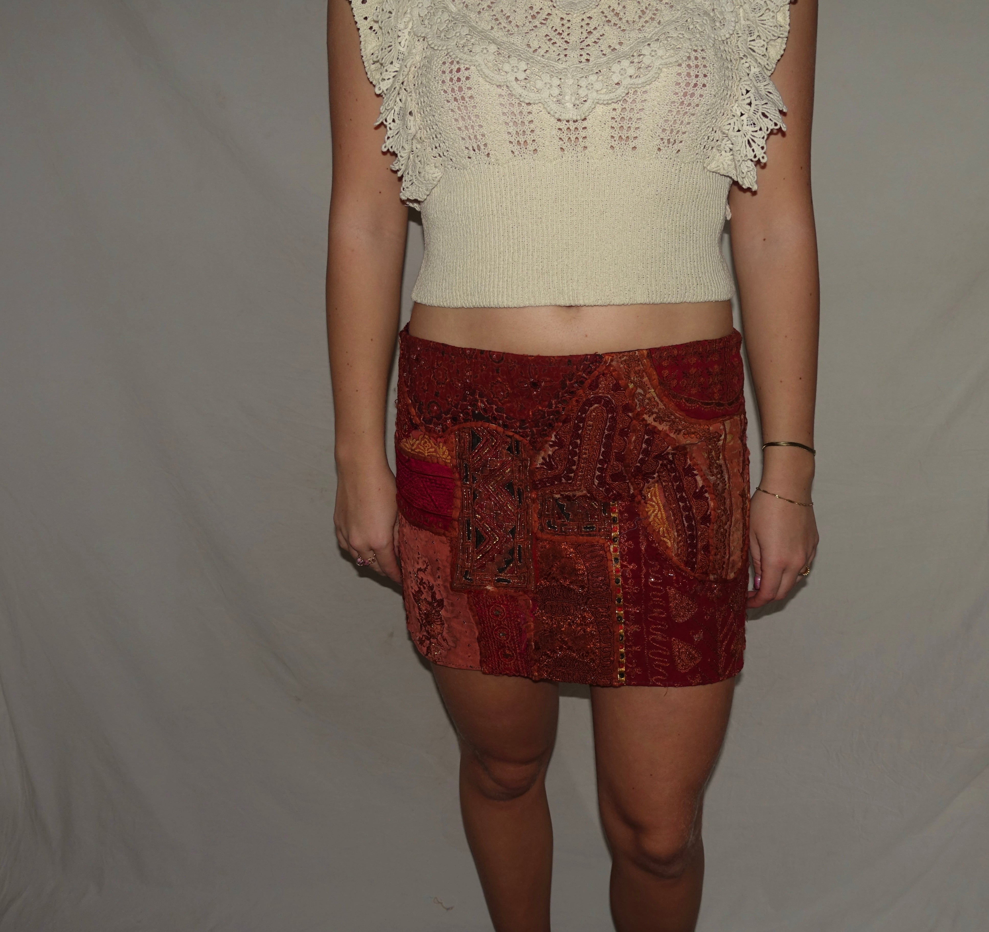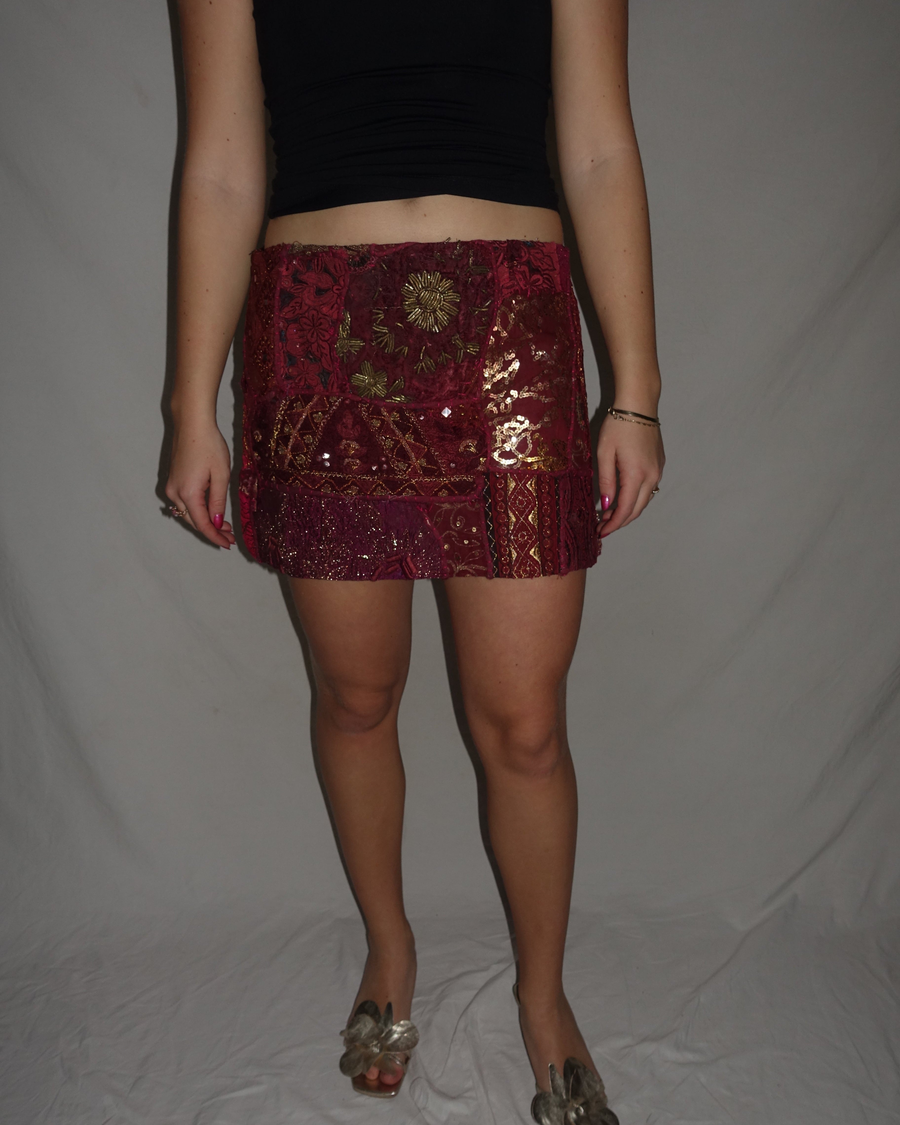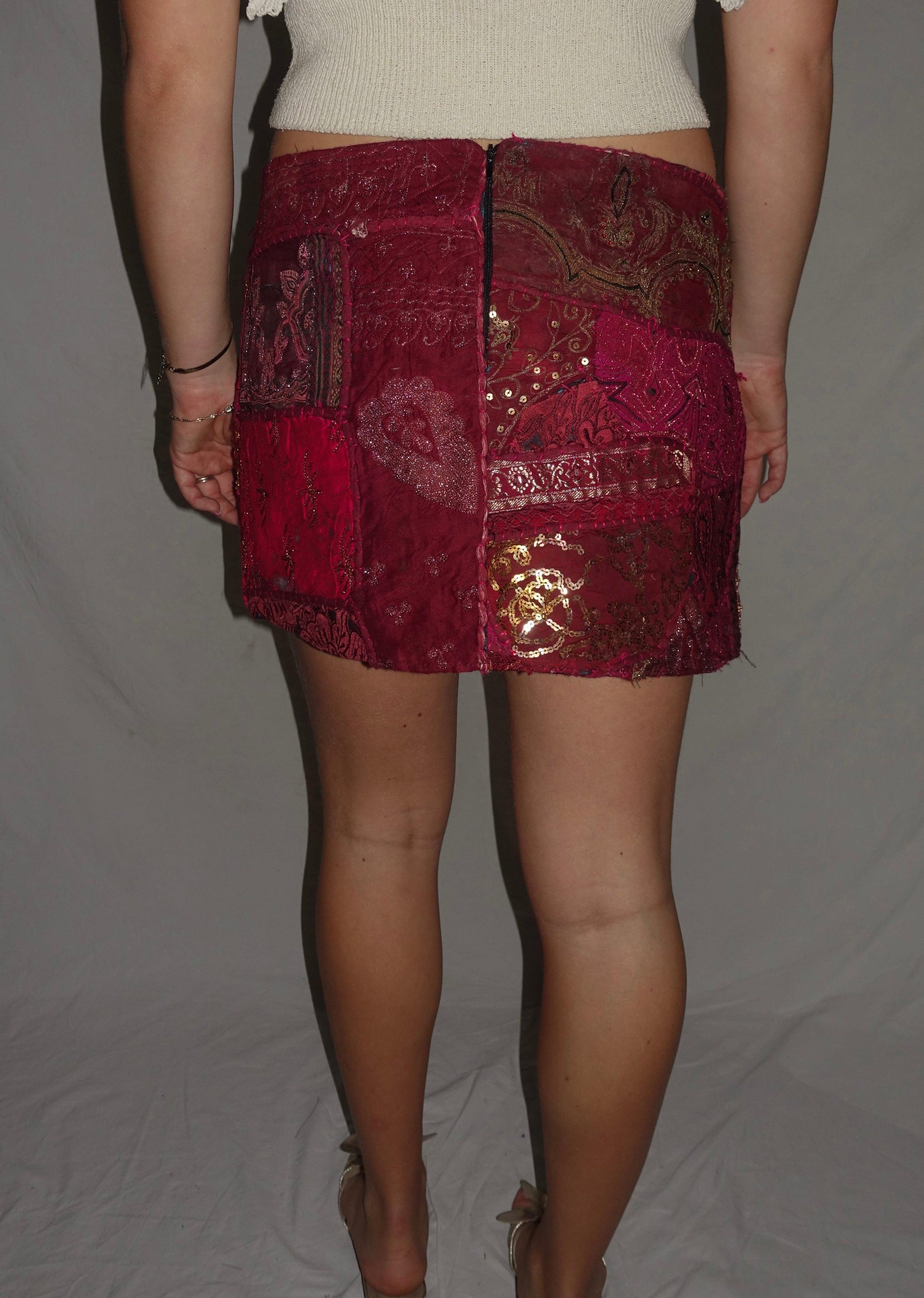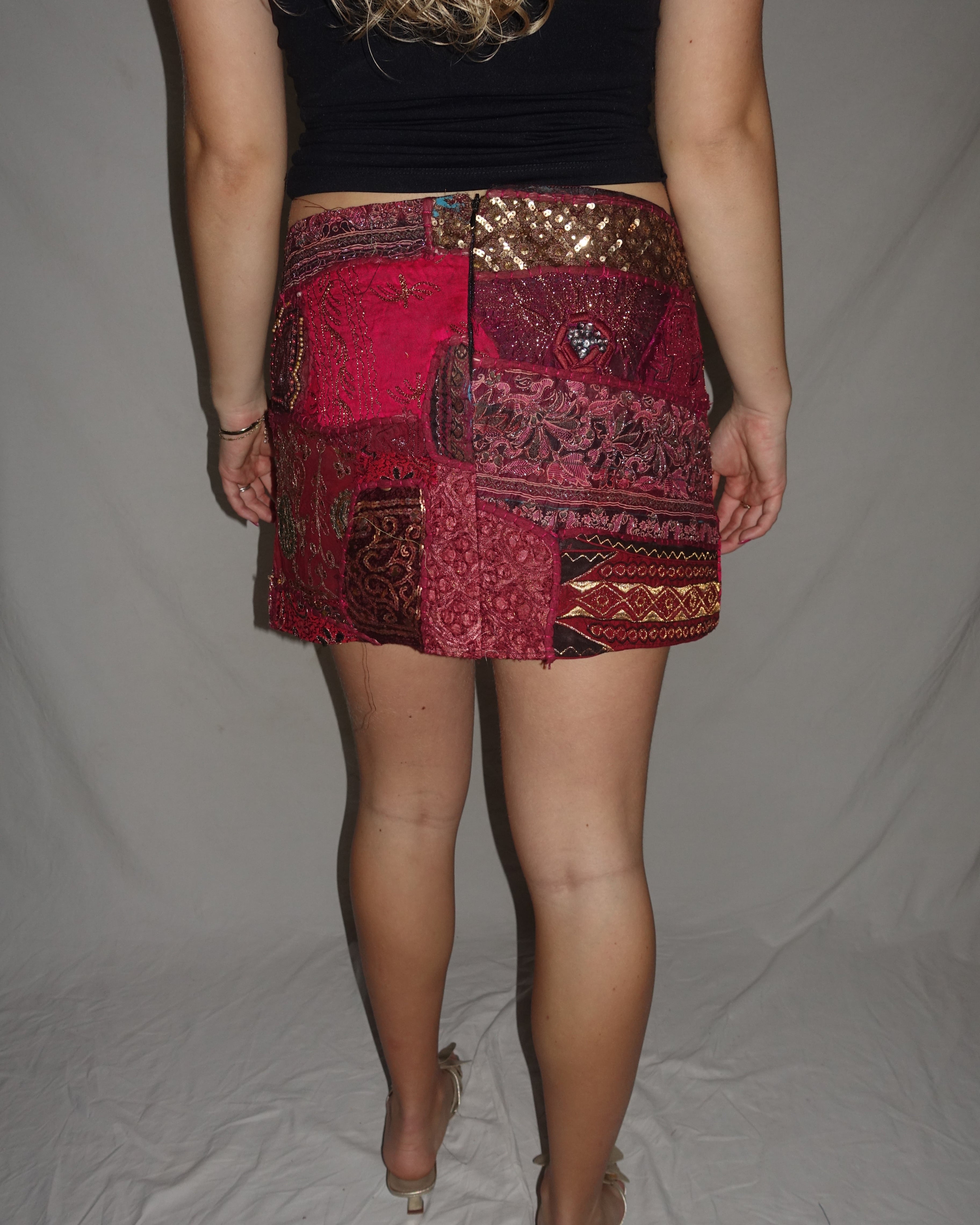 Vintage Sari Beaded Patchwork Bohemian Skirt - Reddish (XS-S)