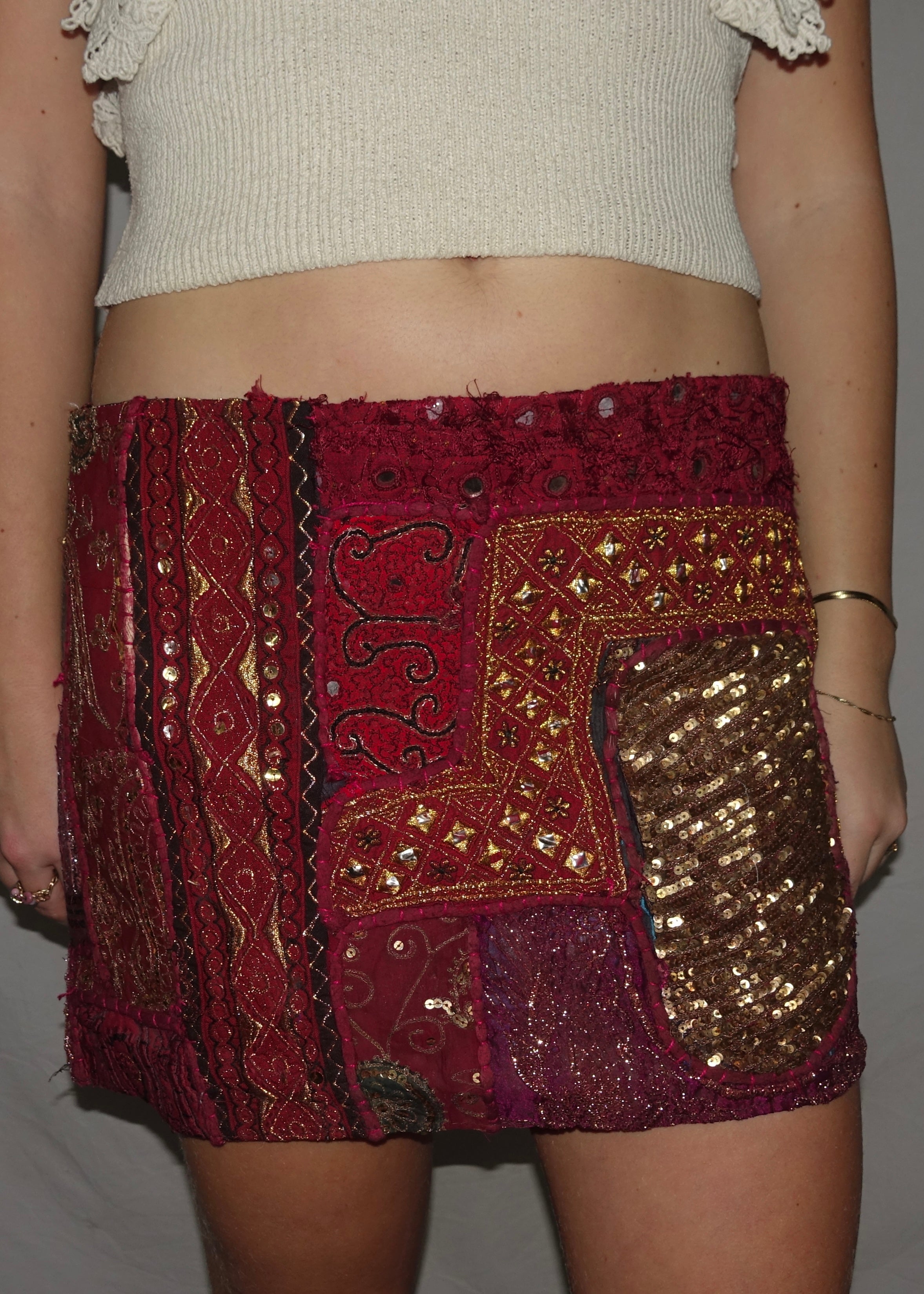 Vintage Sari Beaded Patchwork Bohemian Skirt - Red (XS-S)