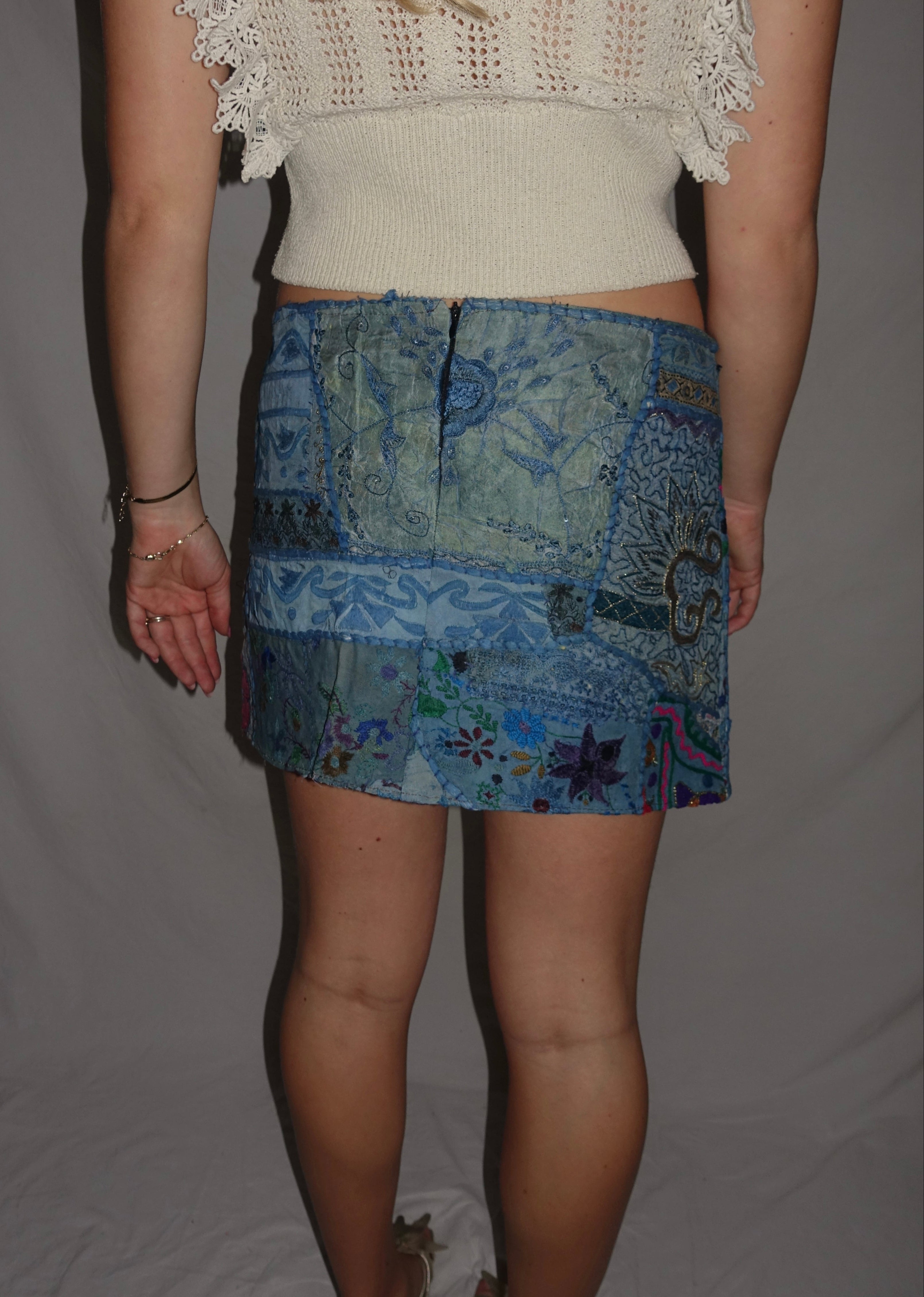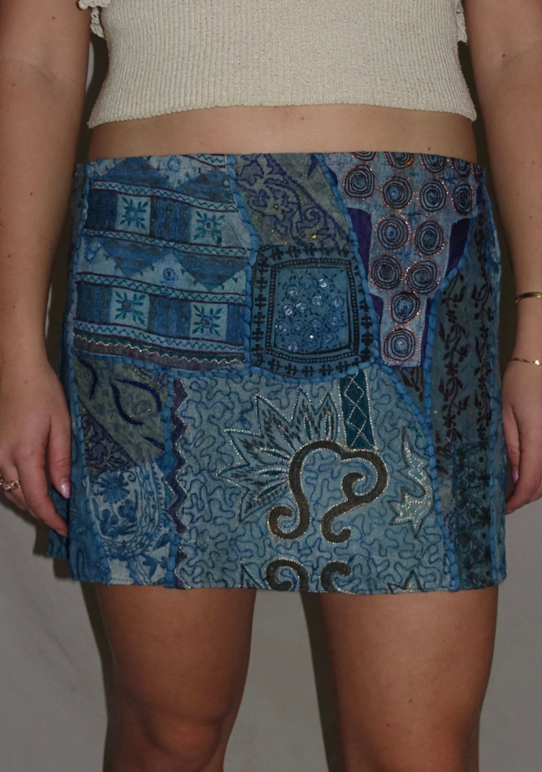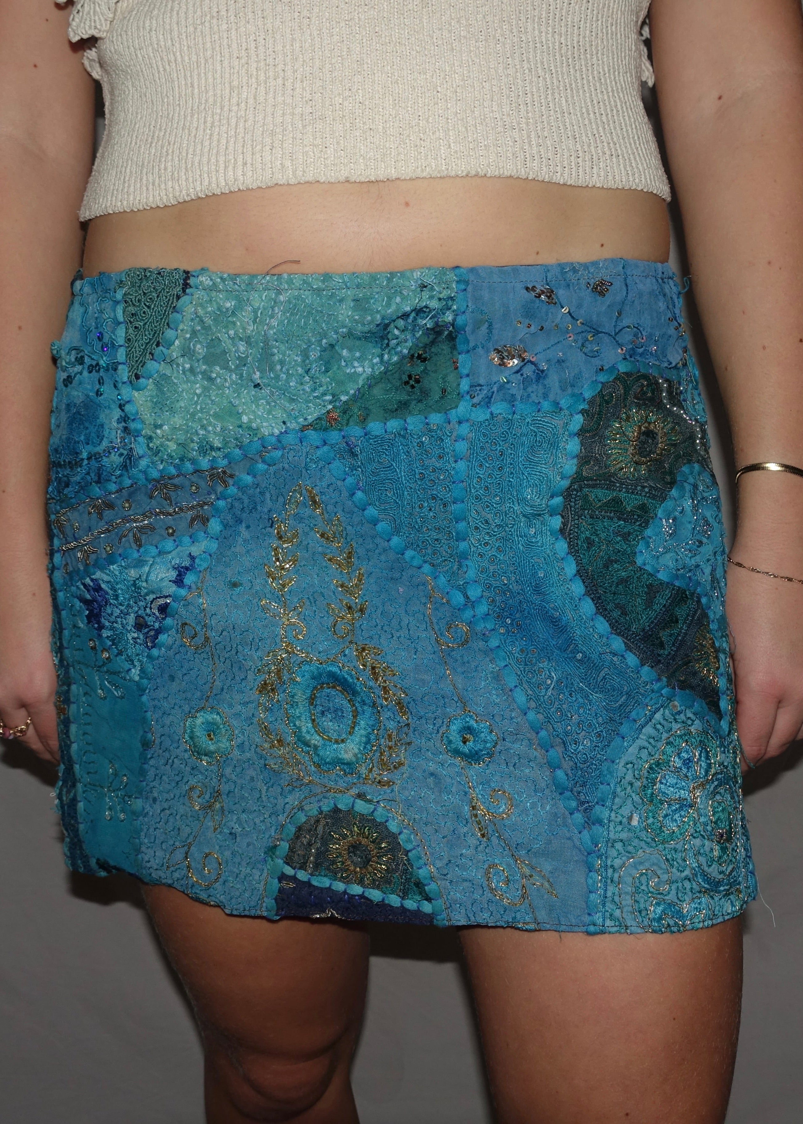 Vintage Sari Beaded Patchwork Bohemian Skirt - Blue (XS-S)