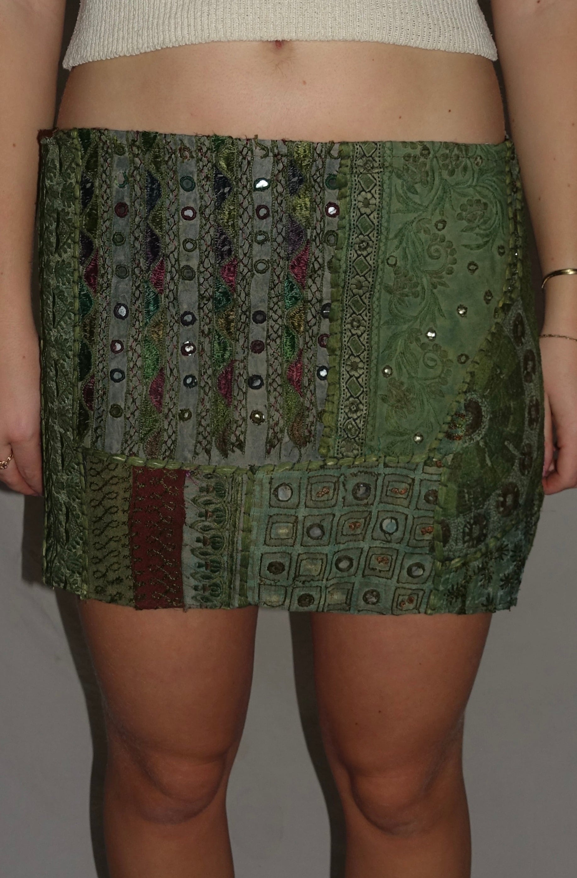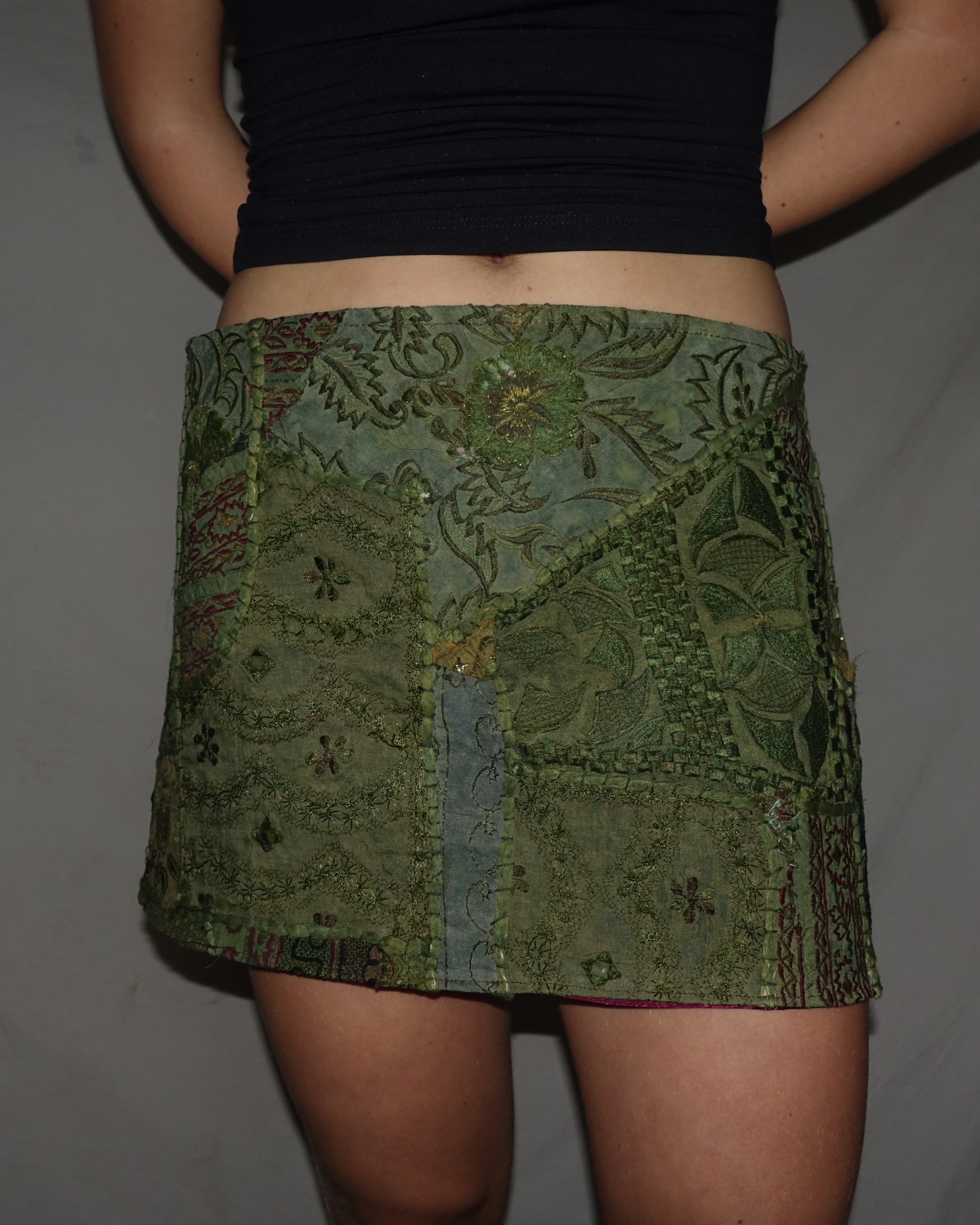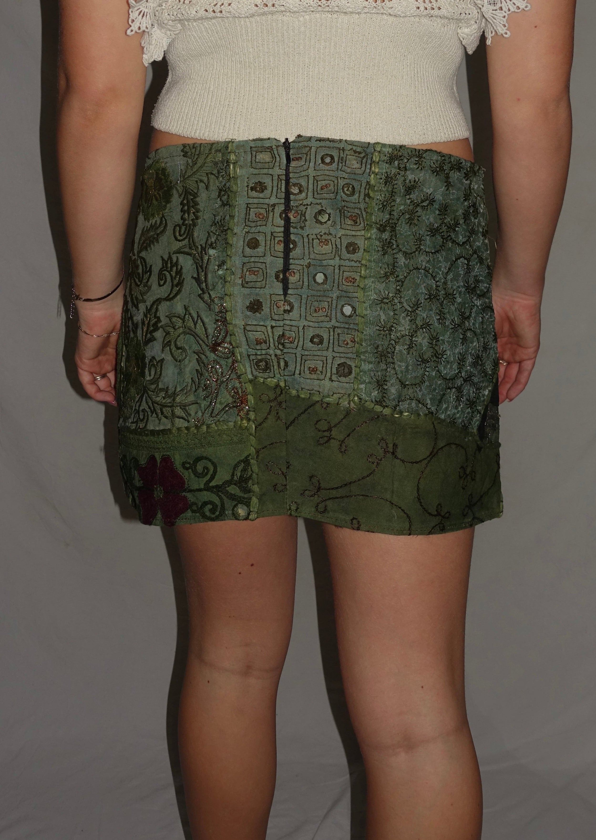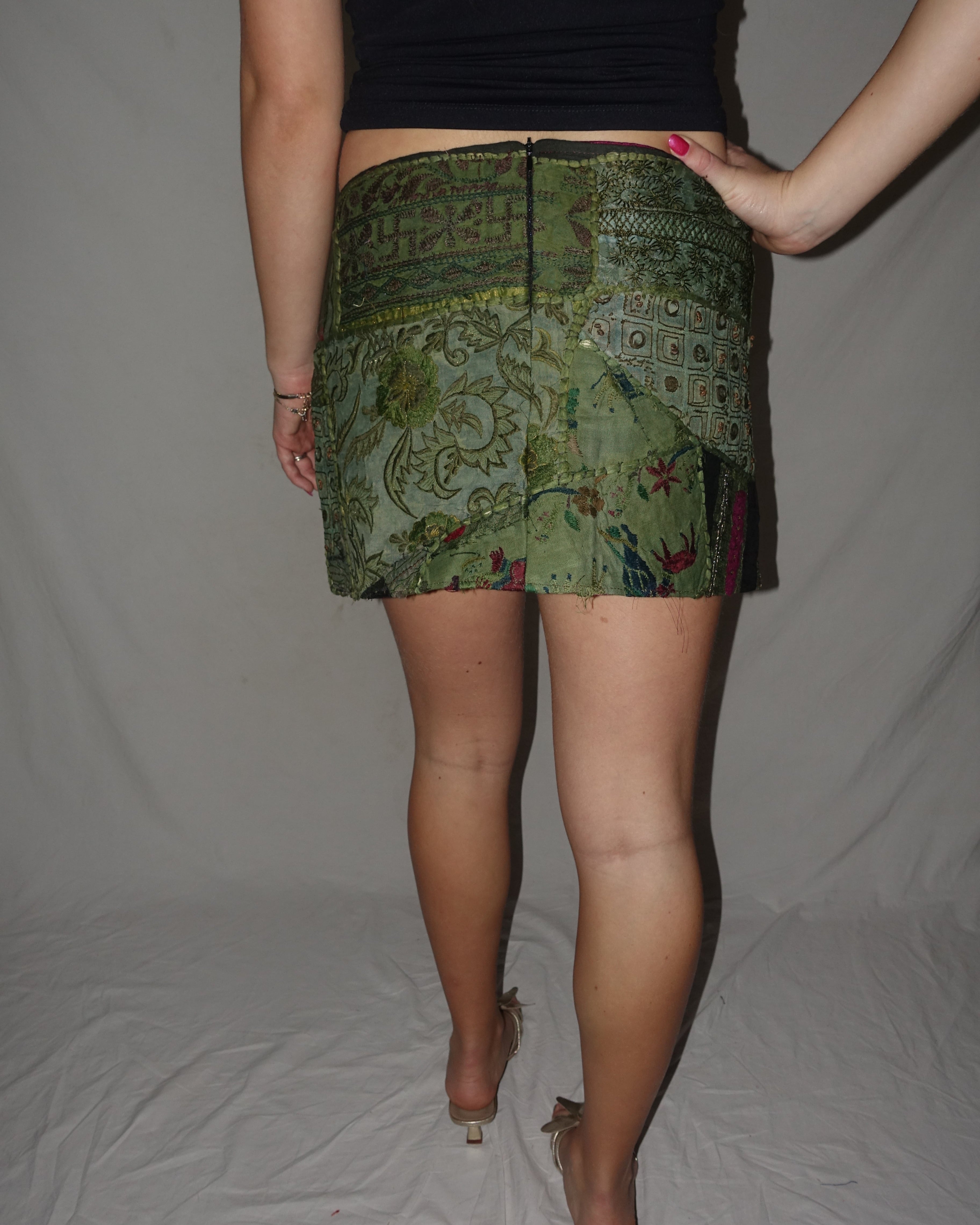Vintage Sari Beaded Patchwork Bohemian Skirt - Army Green (XS-S)