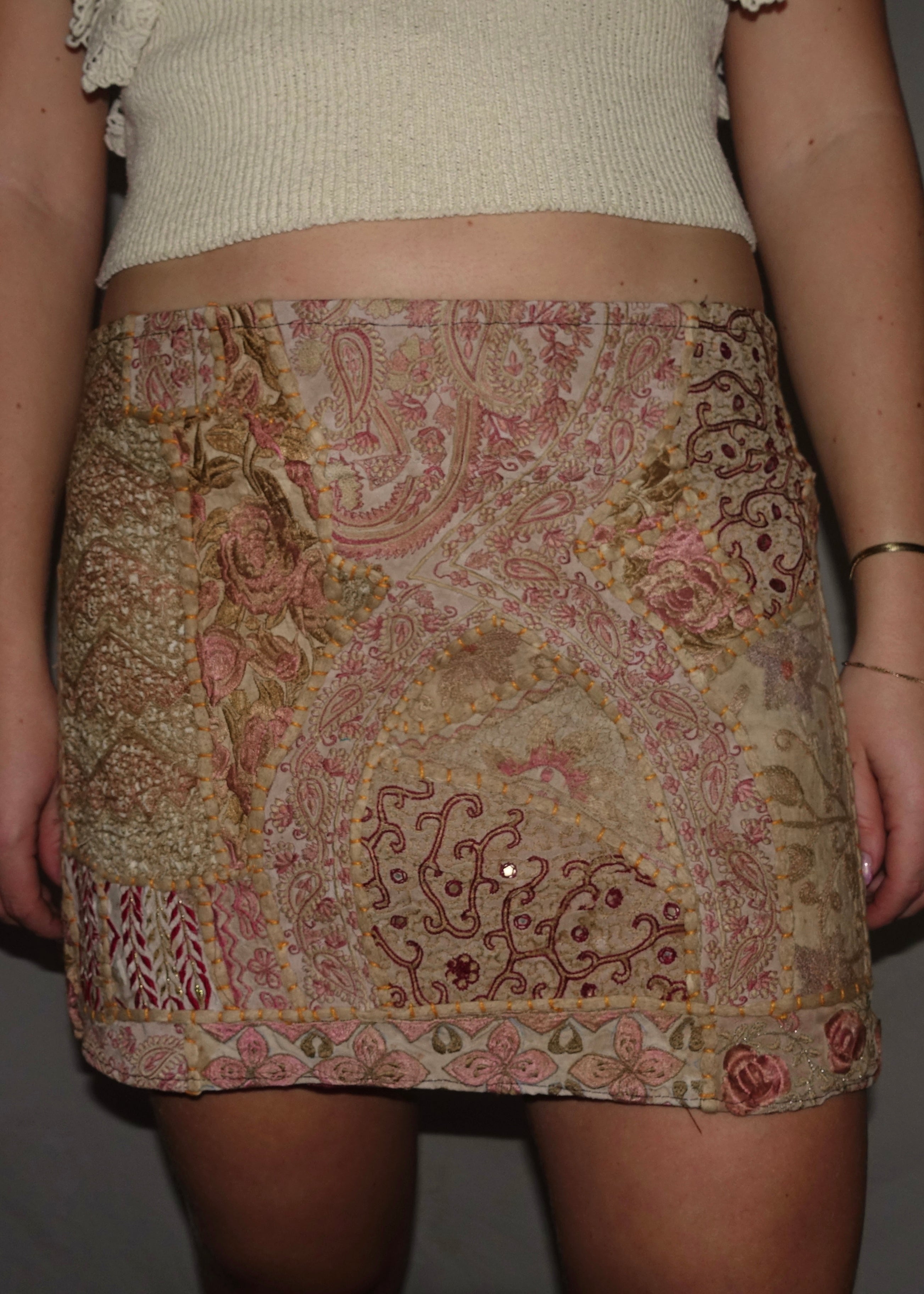 Vintage Sari Beaded Patchwork Bohemian Skirt - Creme Gold (XS-S)
