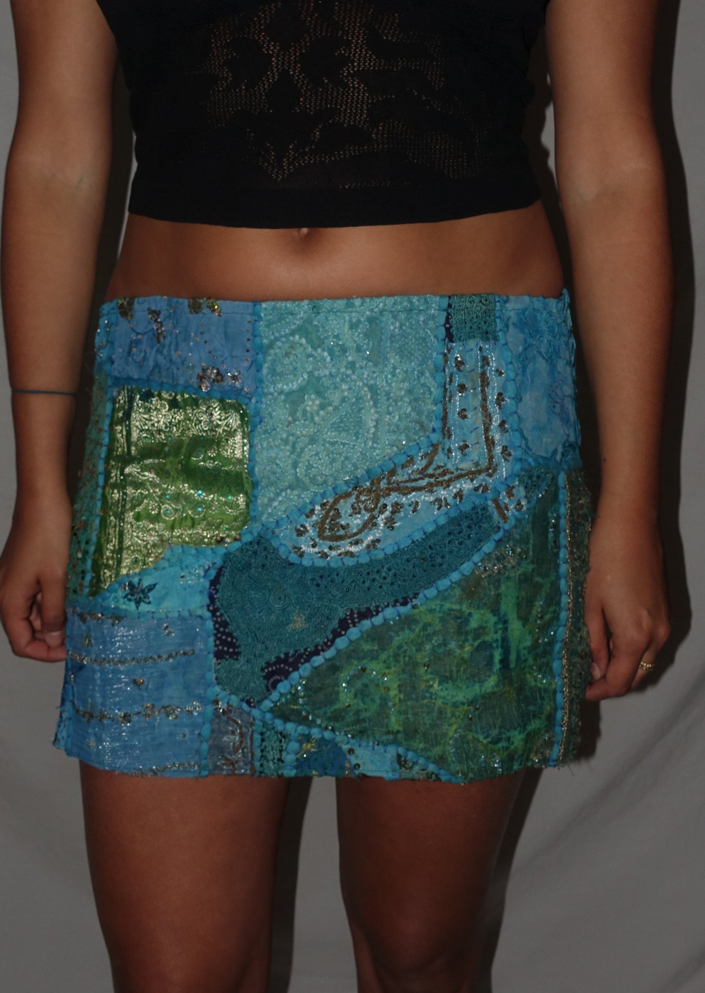 Vintage Sari Beaded Patchwork Bohemian Skirt - Blue/Green (M-L)