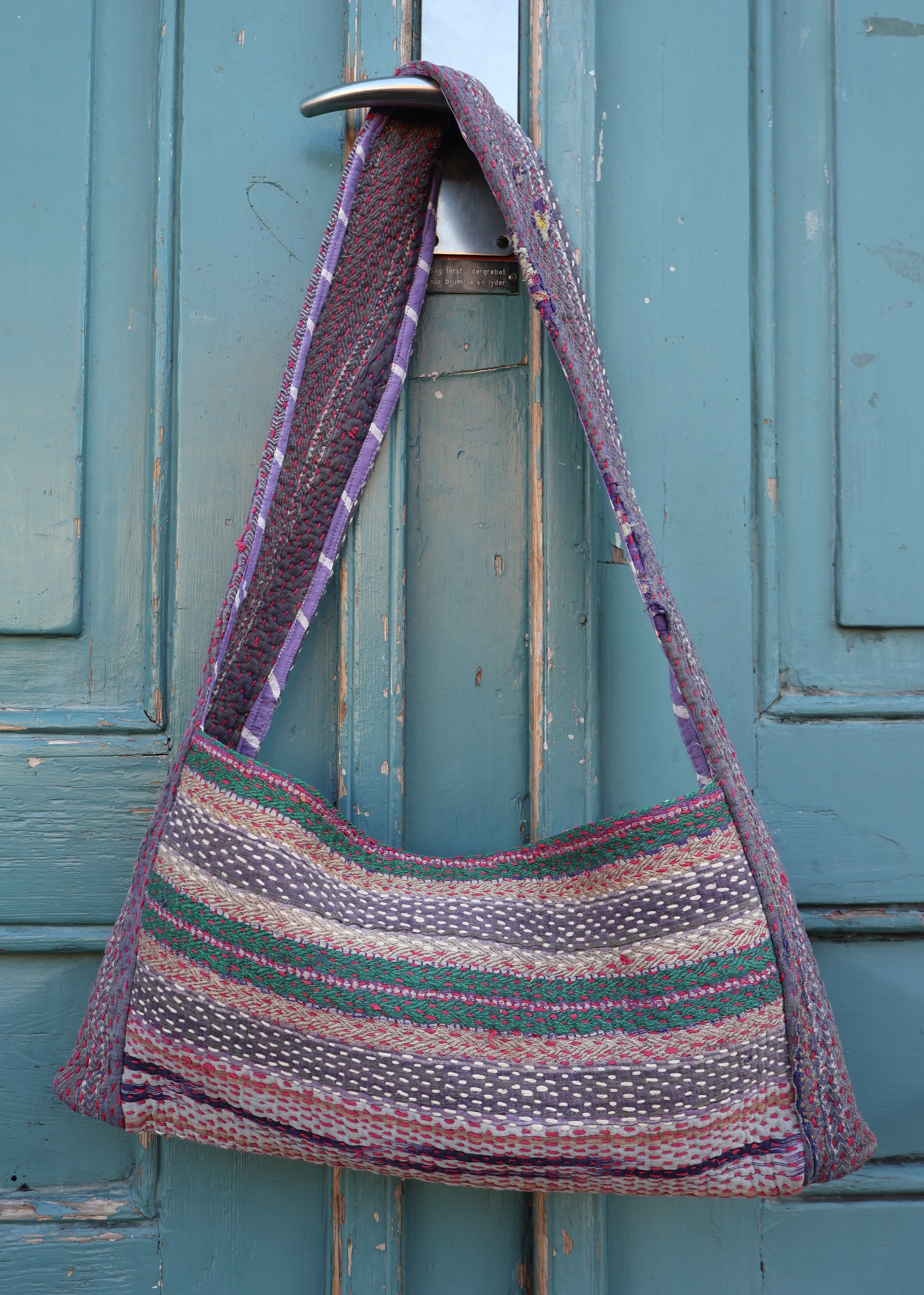 Designed for busy days and made with meaning, this crossbody bag is upcycled from vintage Indian Kantha blankets—so every single one is truly one of a kind. The soft, hand-stitched textile gives it that effortless bohemian look, while the roomy shape makes it seriously practical.