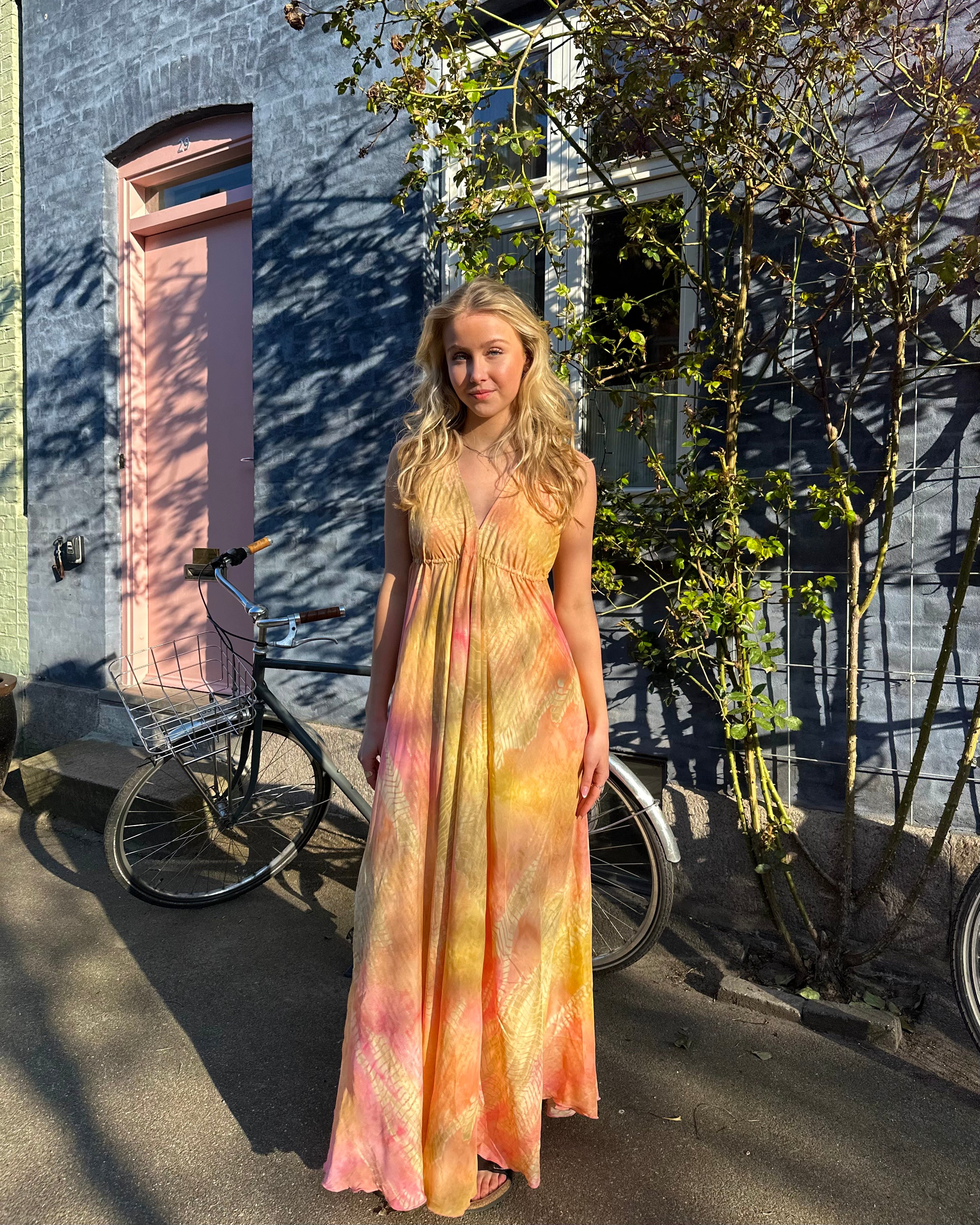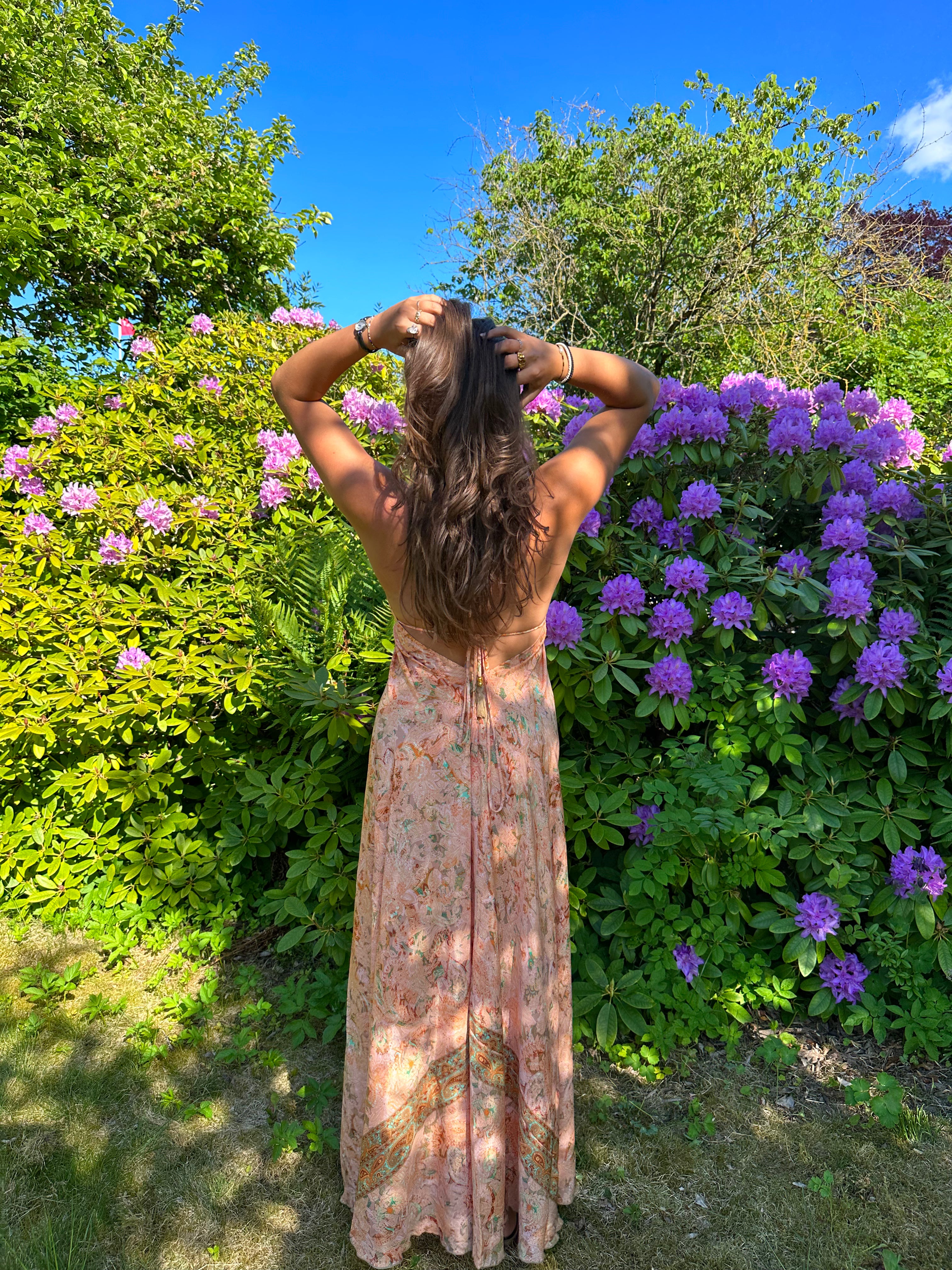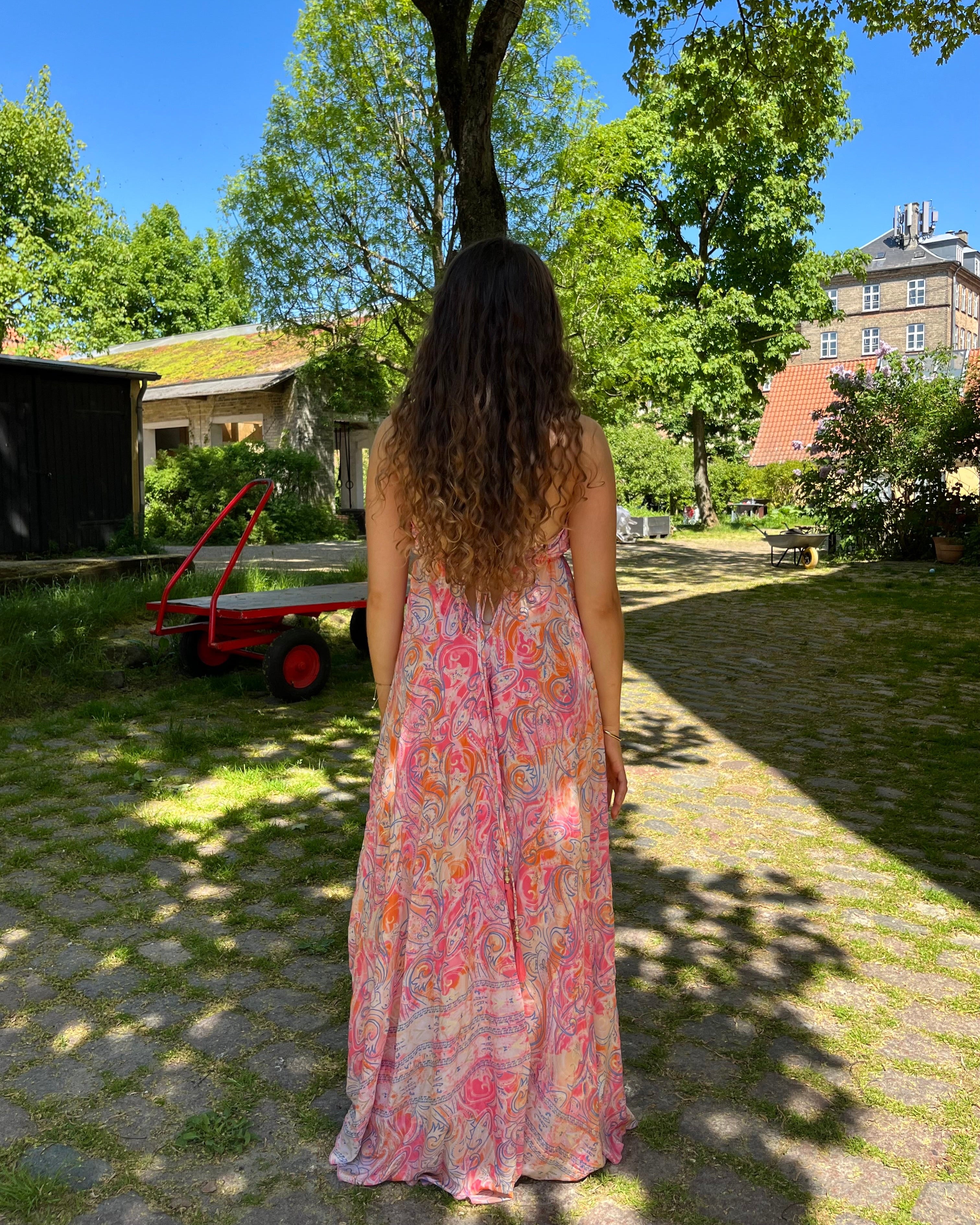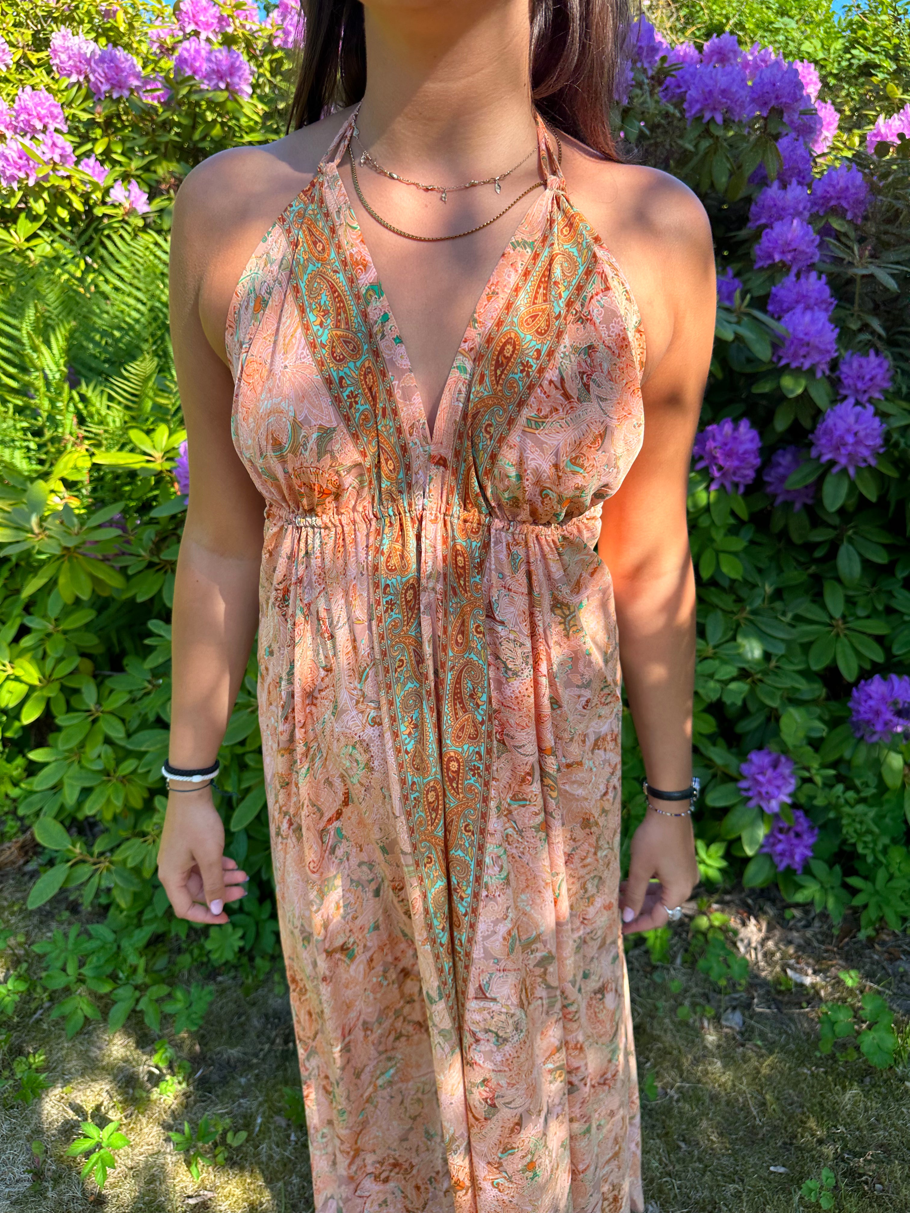 Long Gold Rosa Ibiza Dress - Orange + Pink