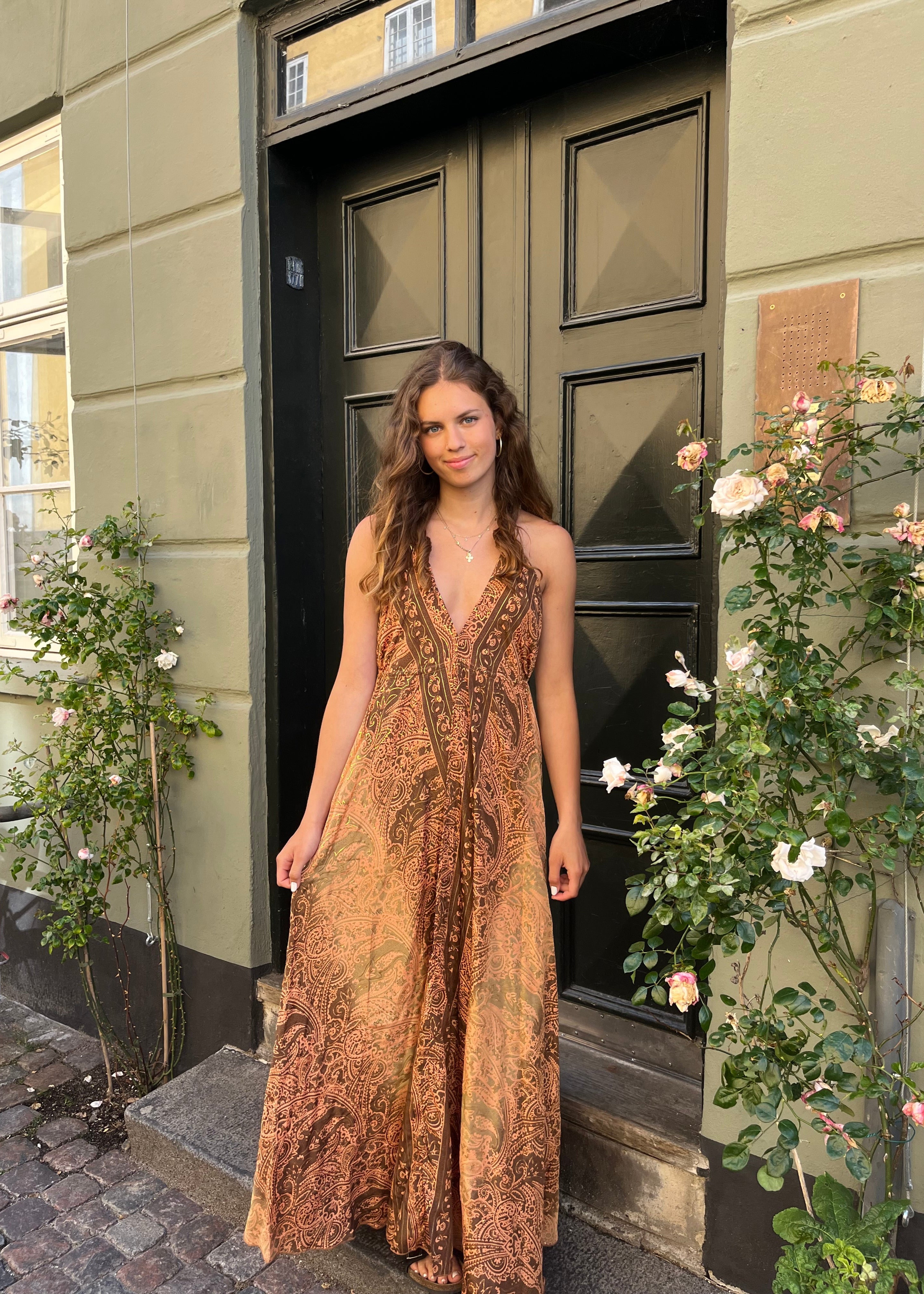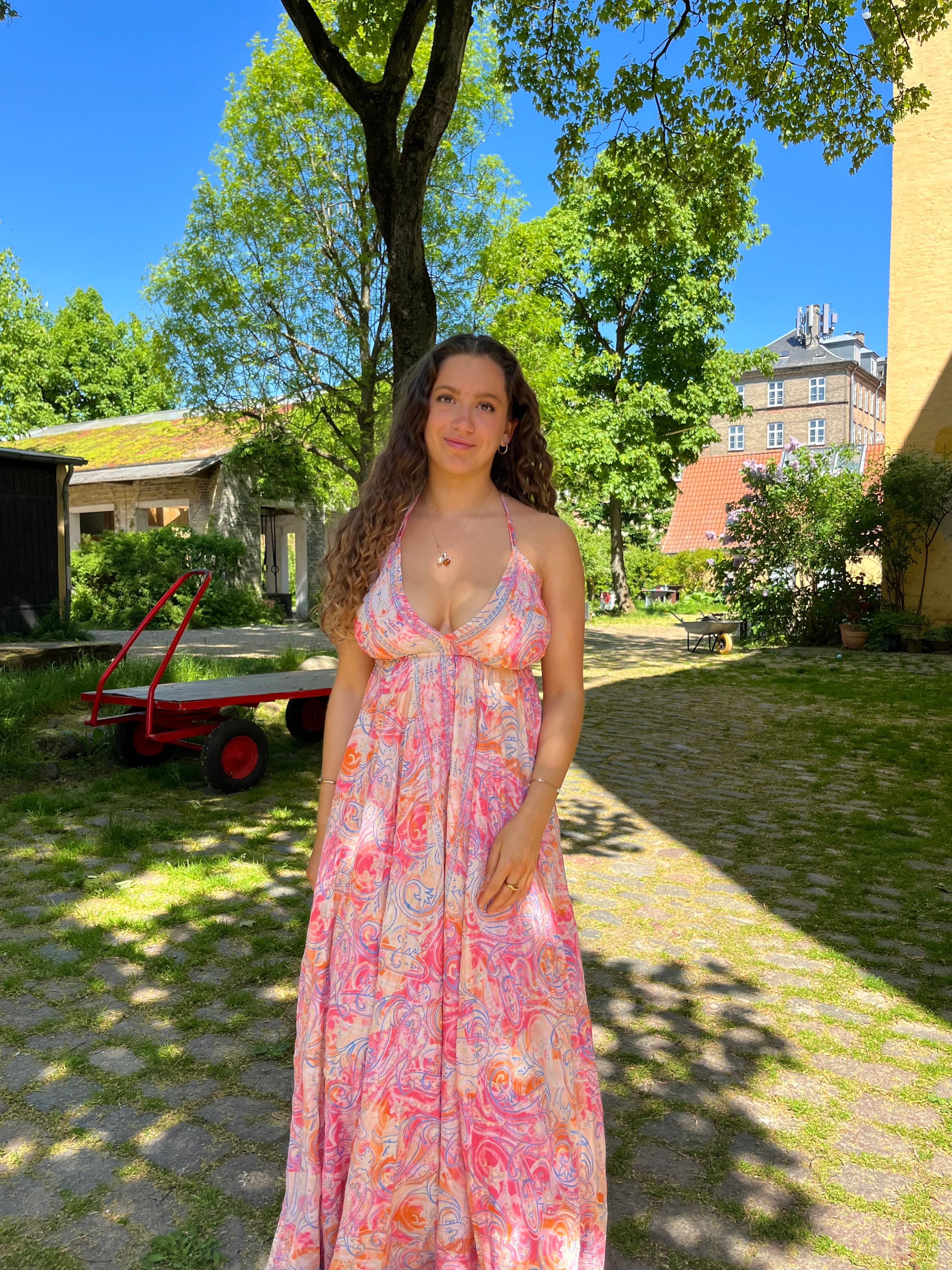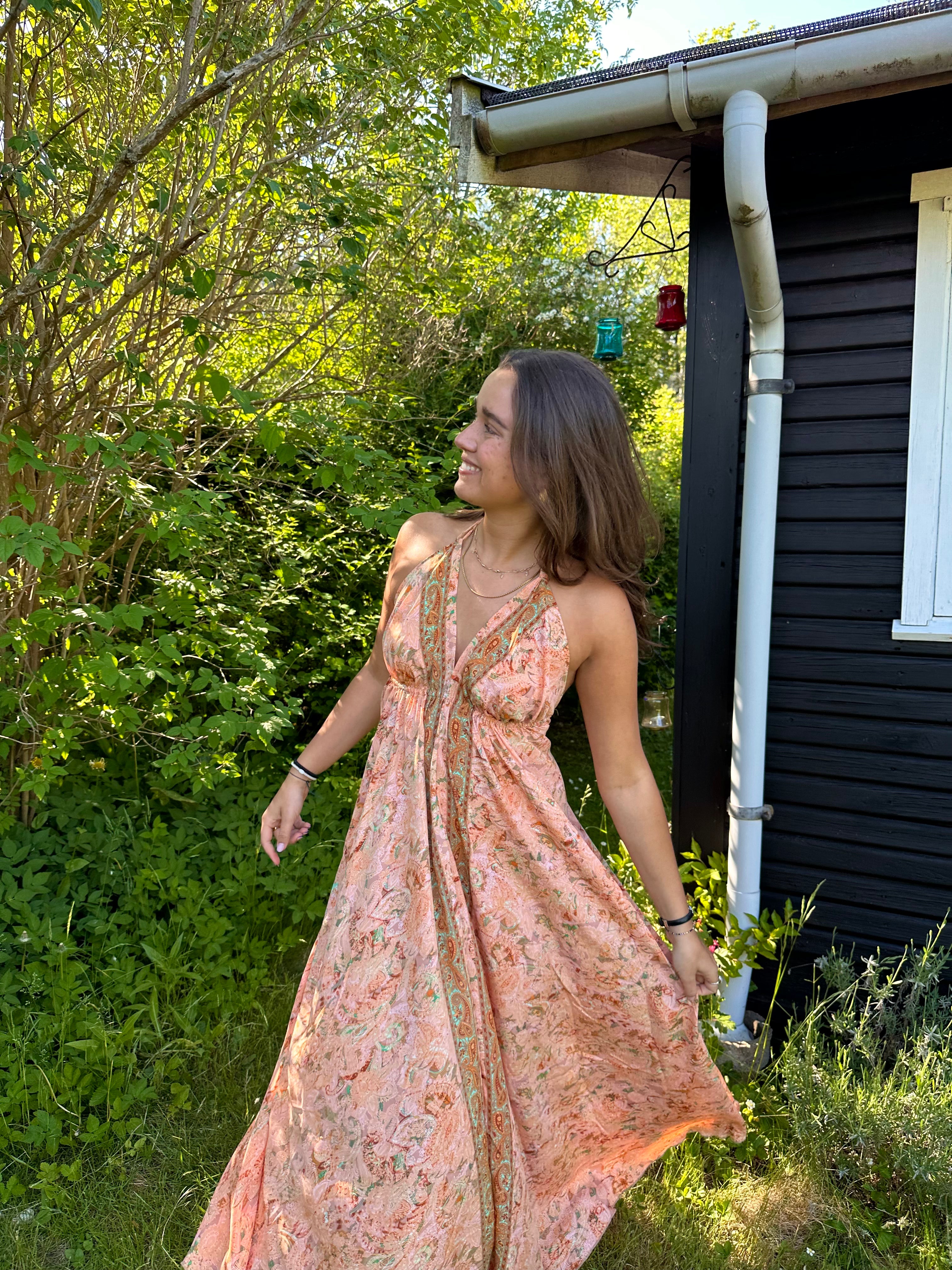 Long Gold Rosa Ibiza Dress - Orange + Pink