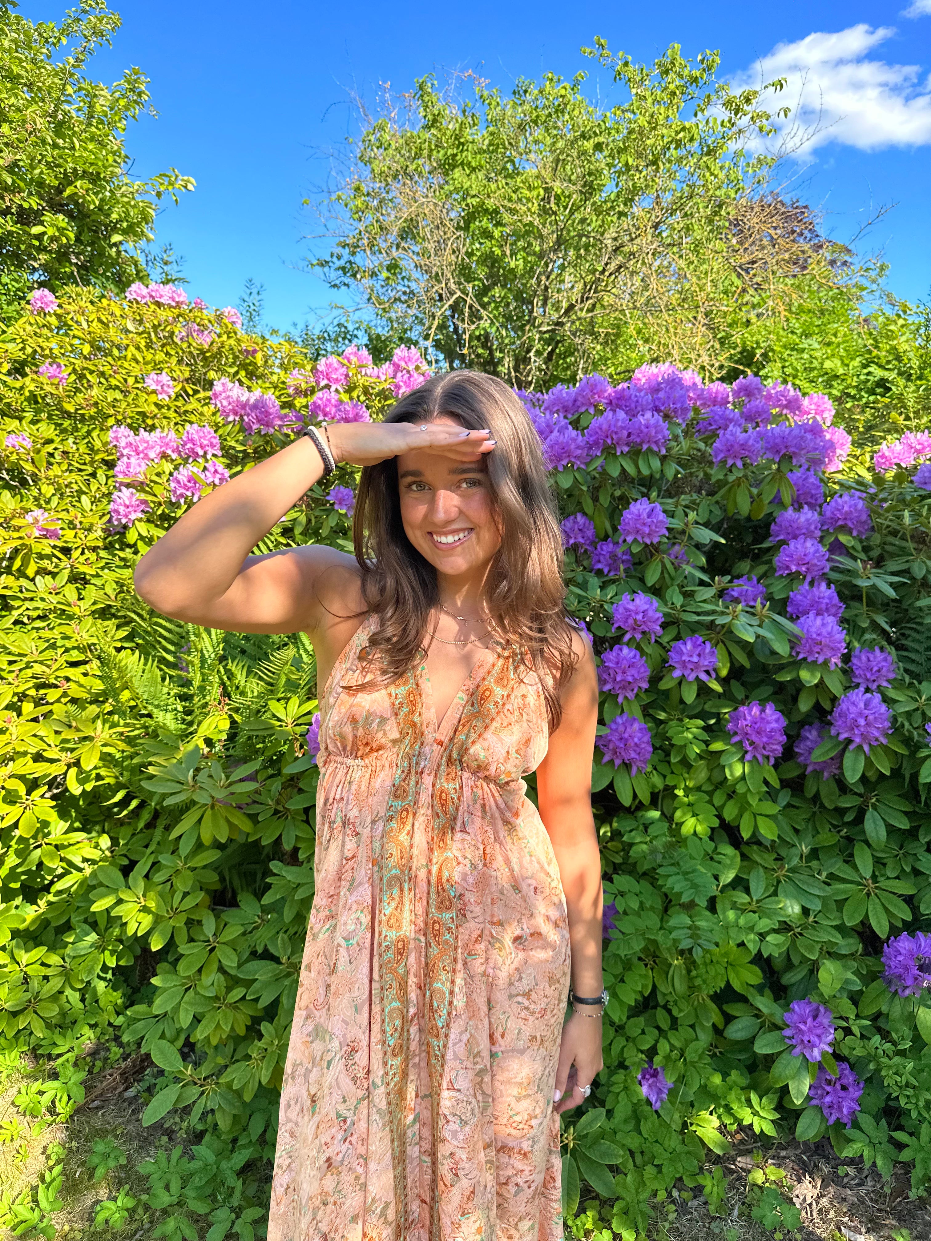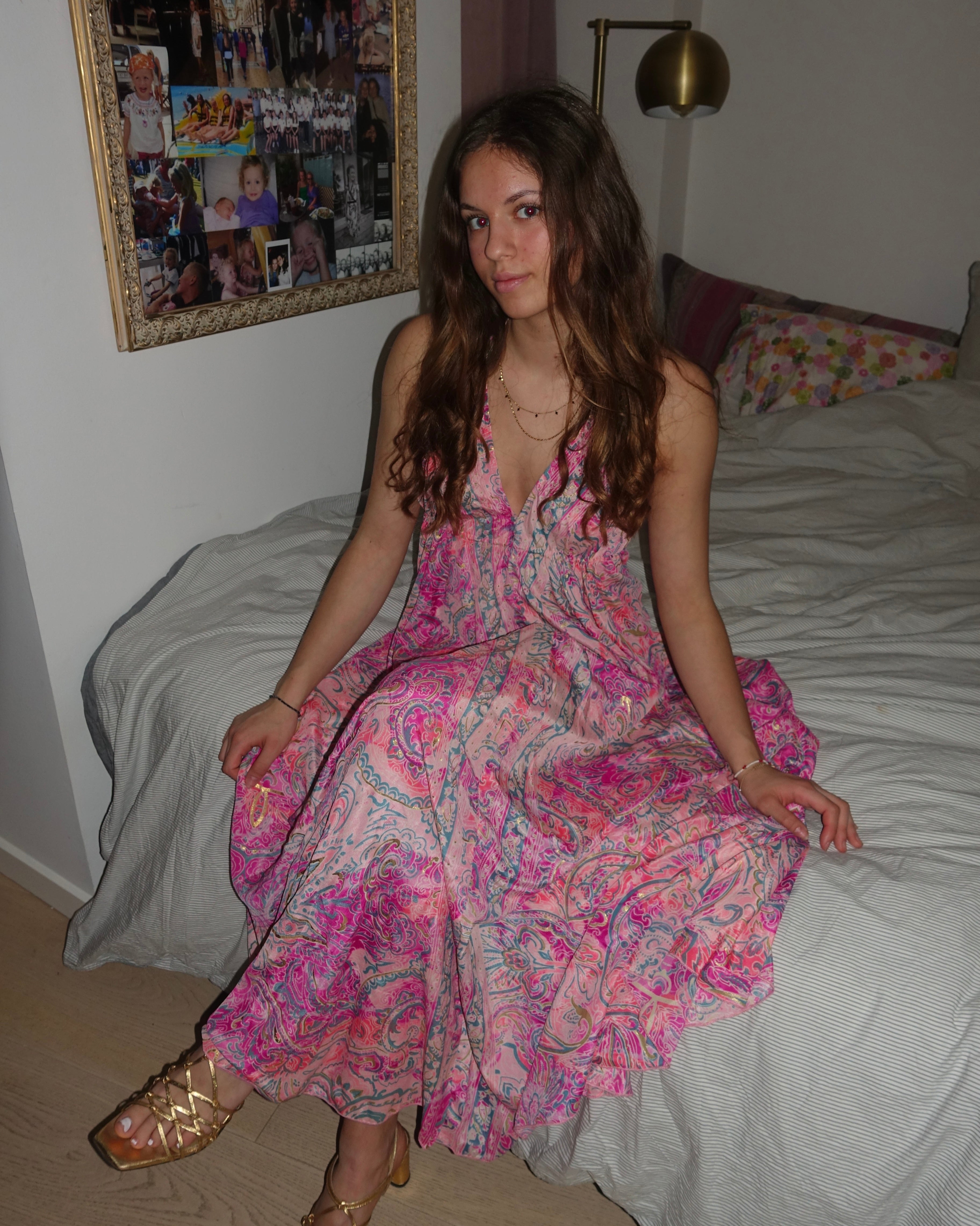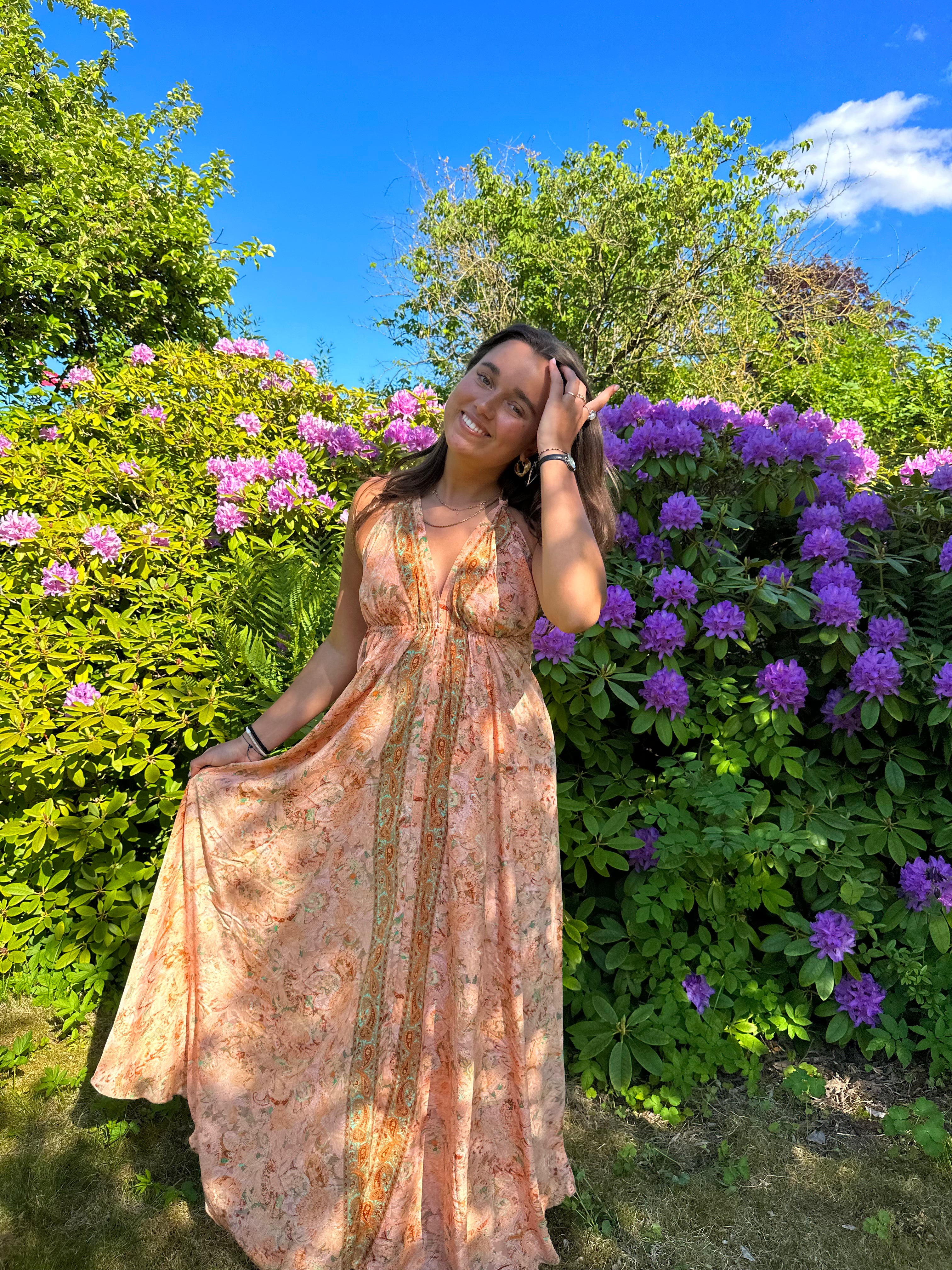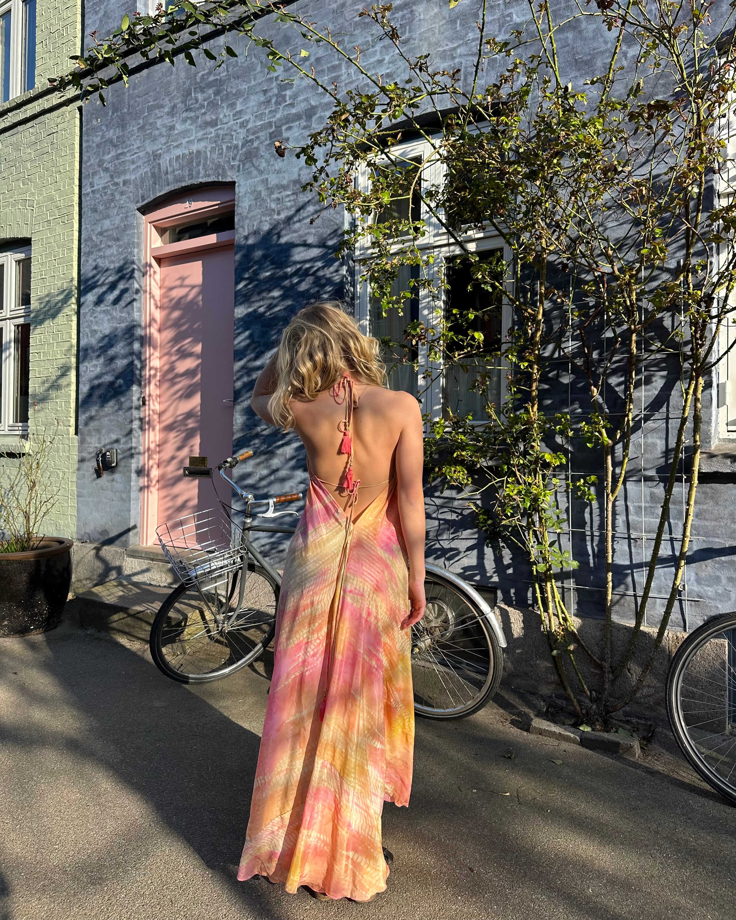 Long Gold Rosa Ibiza Dress - Orange + Pink