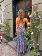 The Long Gold Lillia dress, is super comfortable and adjustable, it has an open back and is attached with a few strings around the neck and back. The material is made of 70% silk and 30% viscose making it super soft and with a beautiful fall.