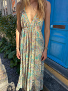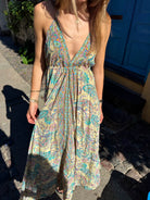The Long Ibiza dress, is super comfortable and adjustable, it has an open back and is attached with a few strings around the neck and back. The material is made of 70% silk and 30% viscose making it super soft and with a beautiful fall.