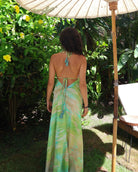 The Long Gold dress, is super comfortable and adjustable, it has an open back and is attached with a few strings around the neck and back. The material is made of 70% silk and 30% viscose making it super soft and with a beautiful fall.