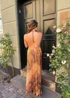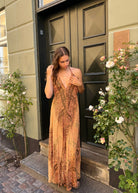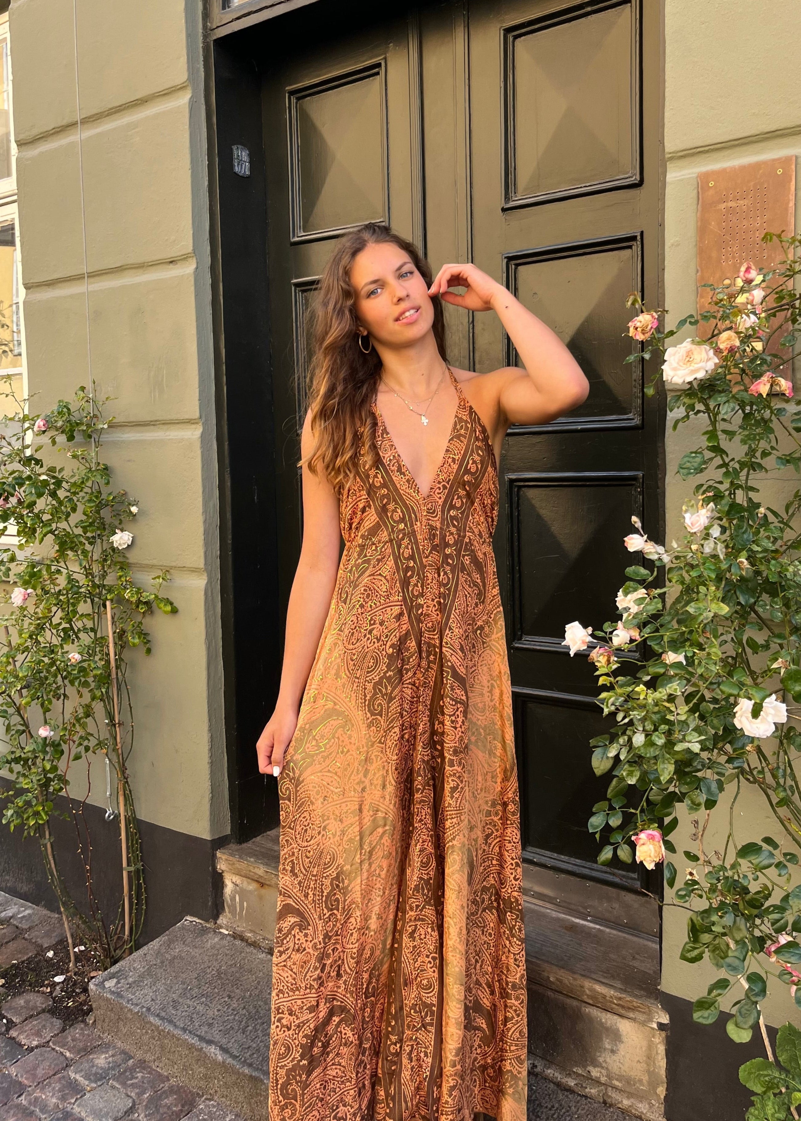 The Long Gold Aisha Ibiza dress, is super comfortable and adjustable, it has an open back and is attached with a few strings around the neck and back. The material is made of 70% silk and 30% viscose making it super soft and with a beautiful fall.