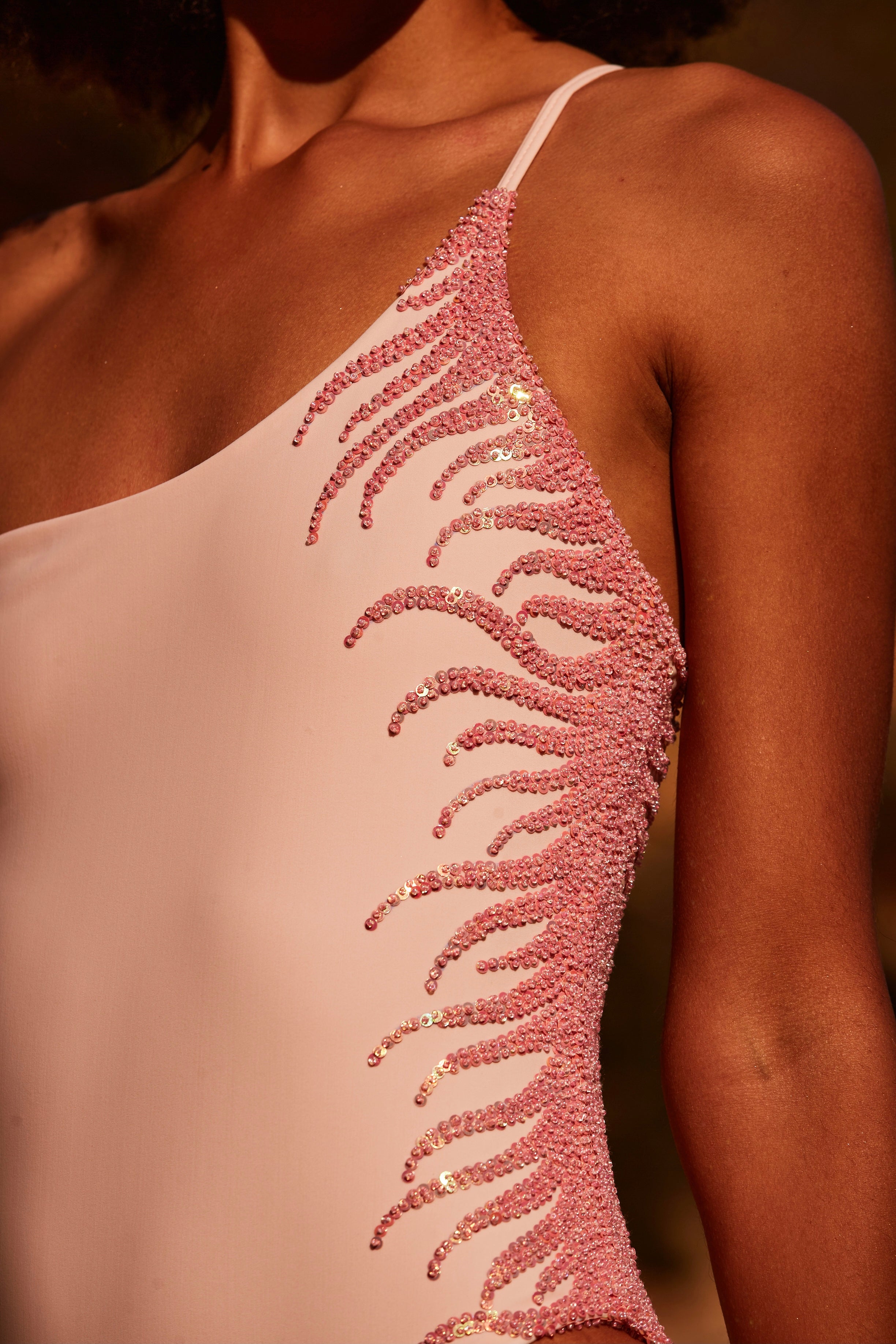 This sophisticated one-shoulder swimsuit offers a new, perfectly on-trend, essential silhouette, with pink sequins.