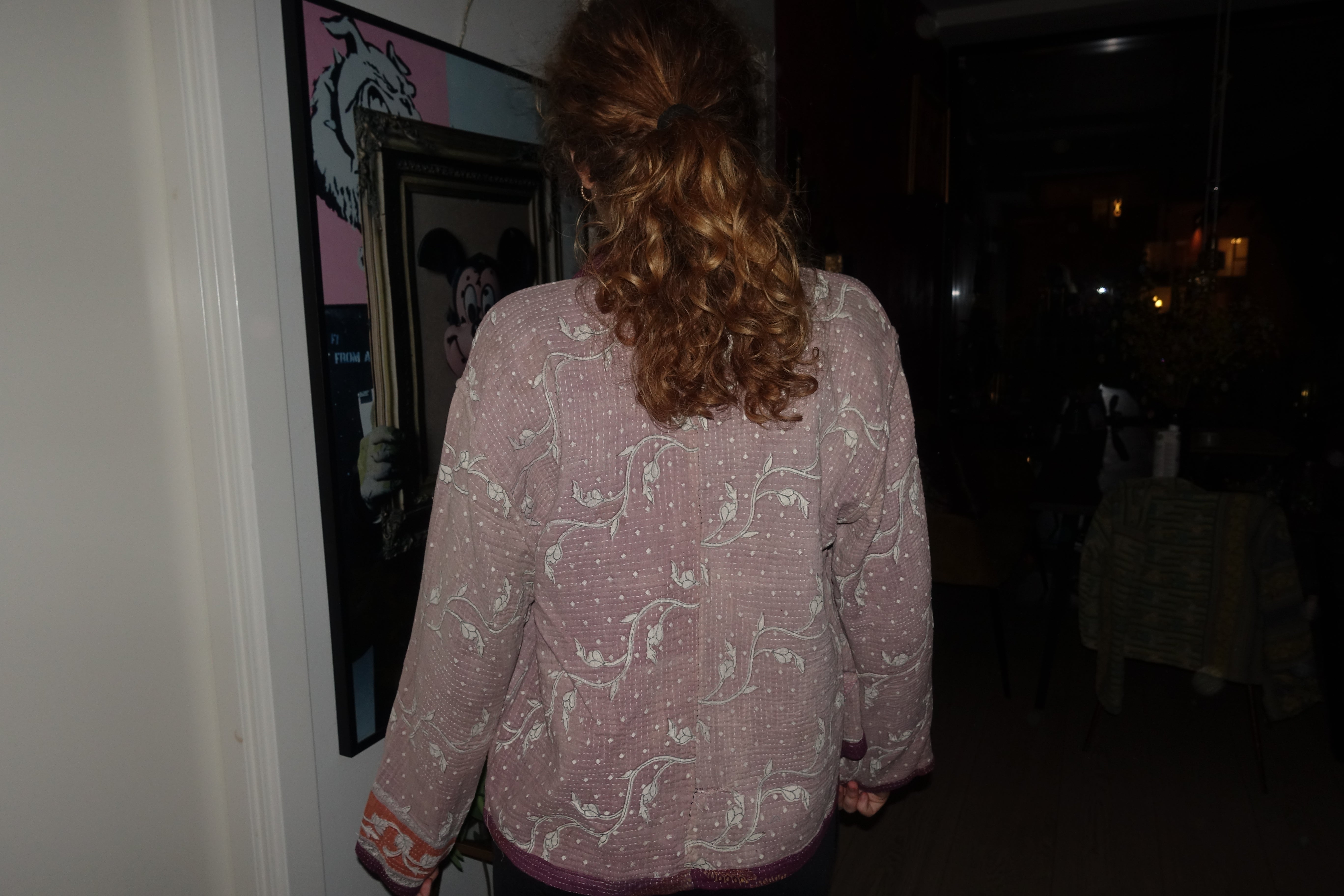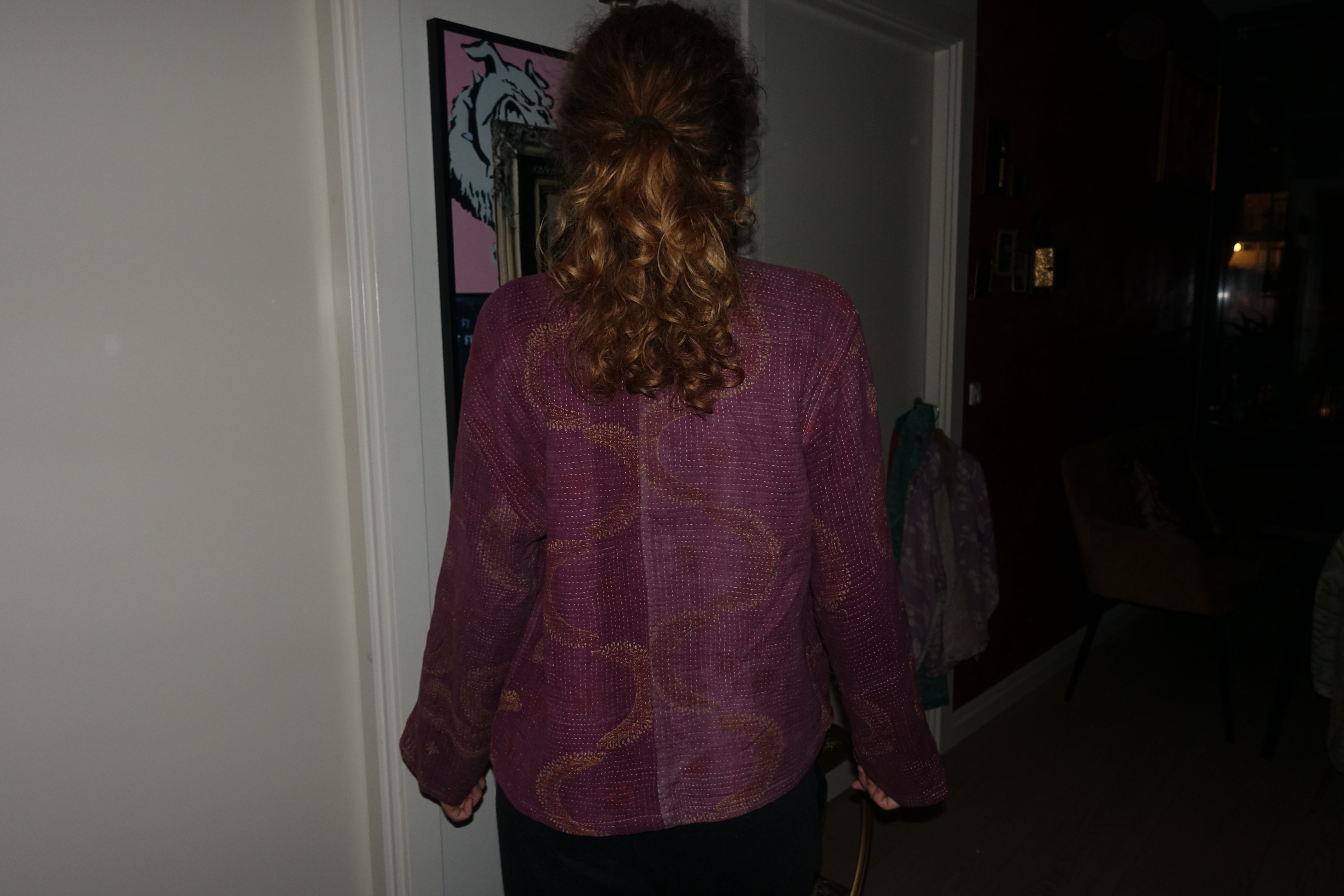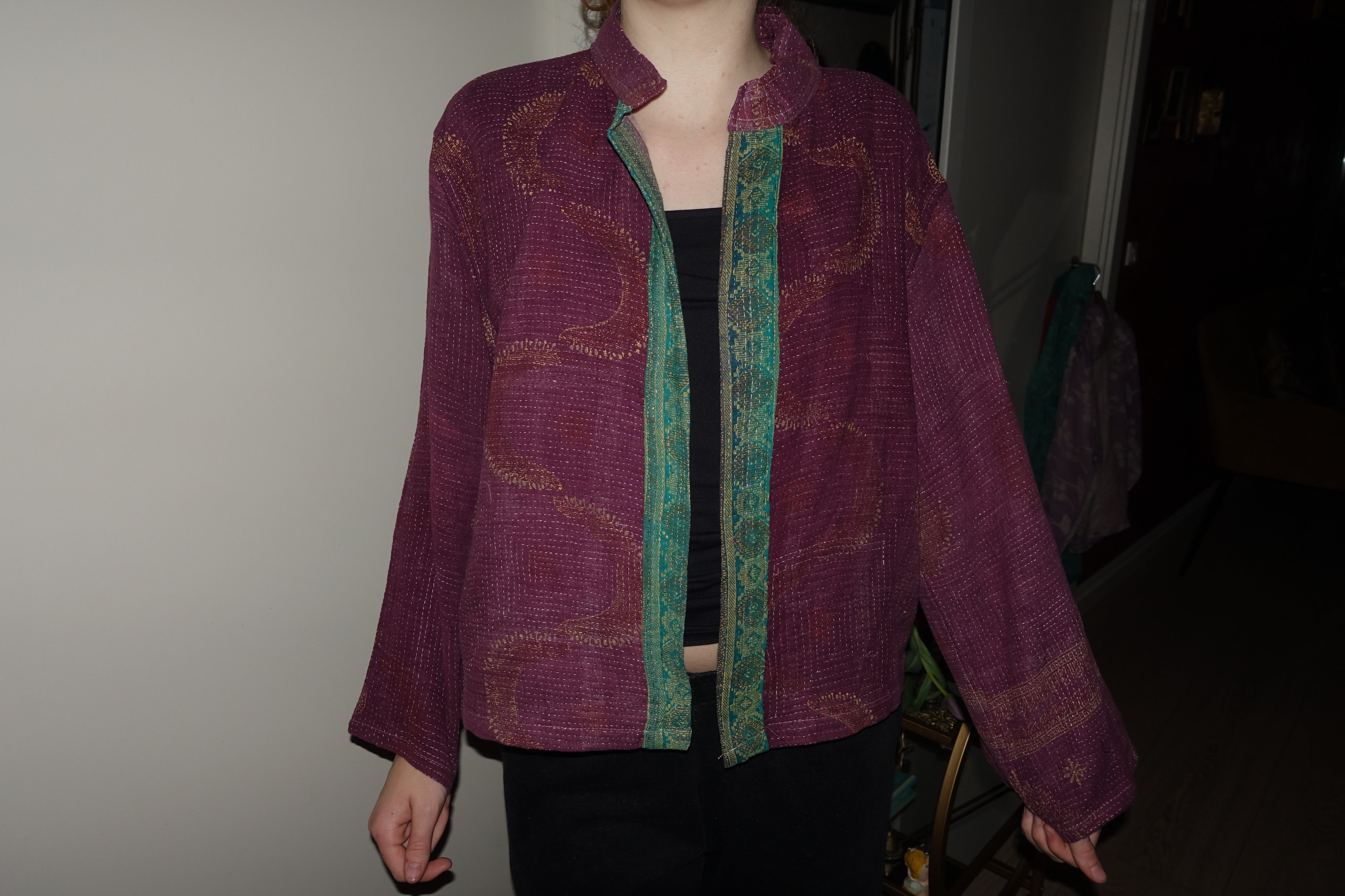 This jacket is sewn in Indian kantha quilt. The material is handmade and recycled, which means that all the jackets are different. The fabric is quilted in several layers. It is handmade in the beautiful kantha style, which is the way the fabric is quilted. The Kantha material on this particular style has a lovely heft. The recycled material may have small defects, such as small holes, loose threads and other traces of use. There may also be unevenness in the handmade quilting, but that is just part of the charm of these upcycled products. The quilting is meant to be loose. If you find that one or more fine threads come loose, it is super easy to attach the thread again with a needle.