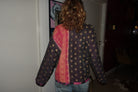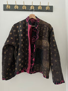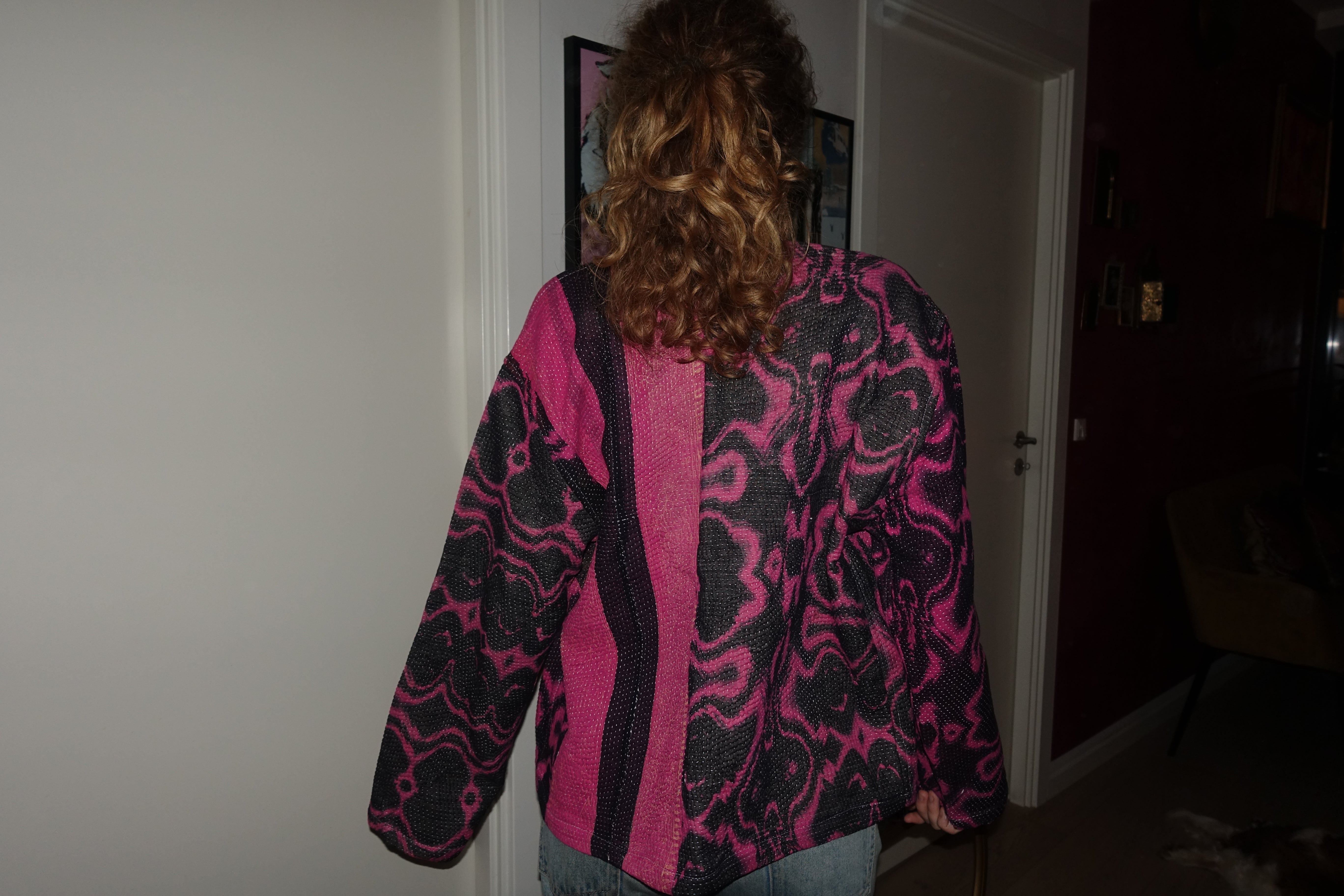 This jacket is sewn in Indian kantha quilt. The material is handmade and recycled, which means that all the bags are different. The fabric is quilted in several layers. It is handmade in the beautiful kantha style, which is the way the fabric is quilted. The Kantha material on this particular style has a lovely heft. The recycled material may have small defects, such as small holes, loose threads and other traces of use. There may also be unevenness in the handmade quilting, but that is just part of the charm of these upcycled products. The quilting is meant to be loose. If you find that one or more fine threads come loose, it is super easy to attach the thread again with a needle.