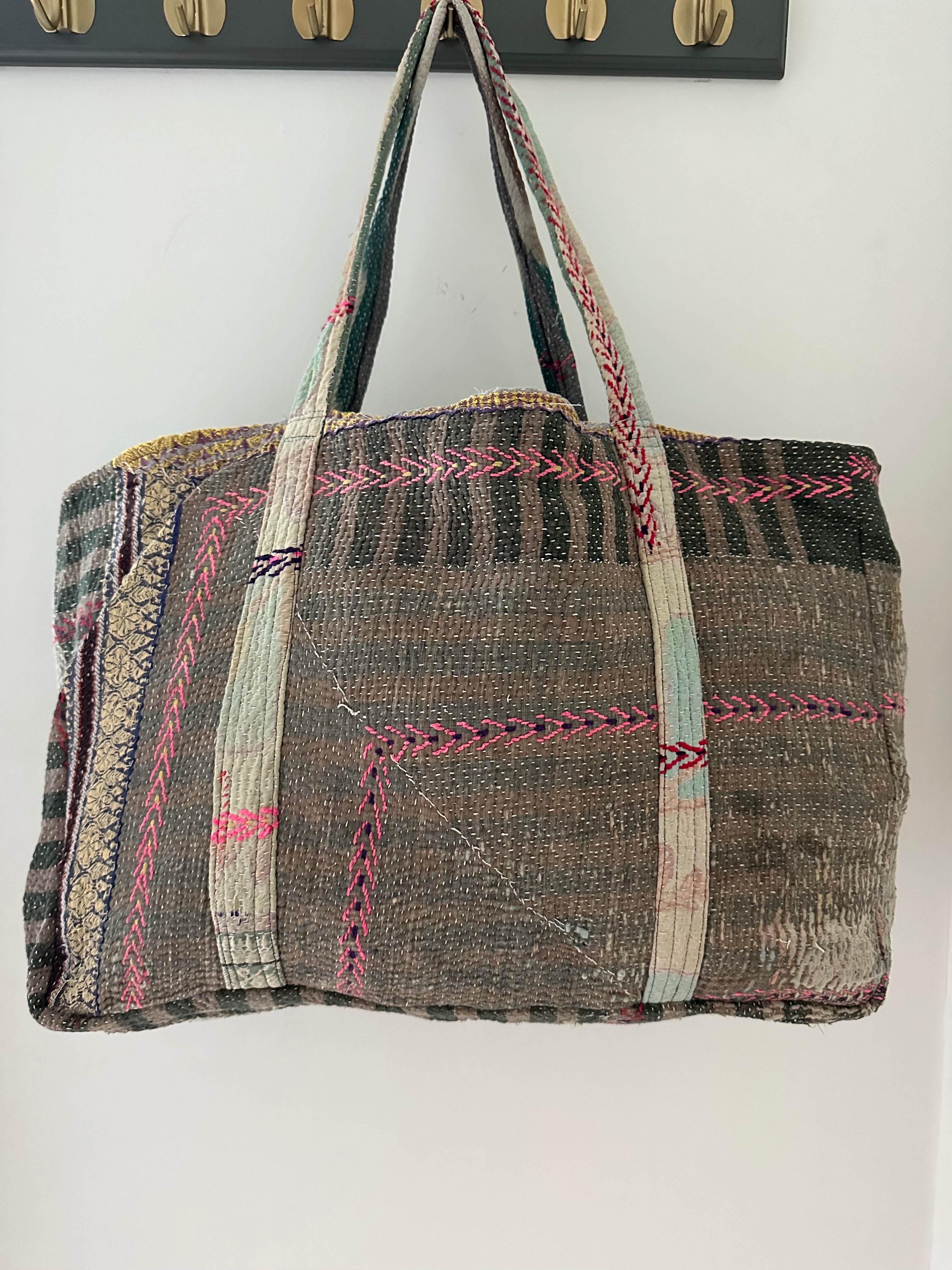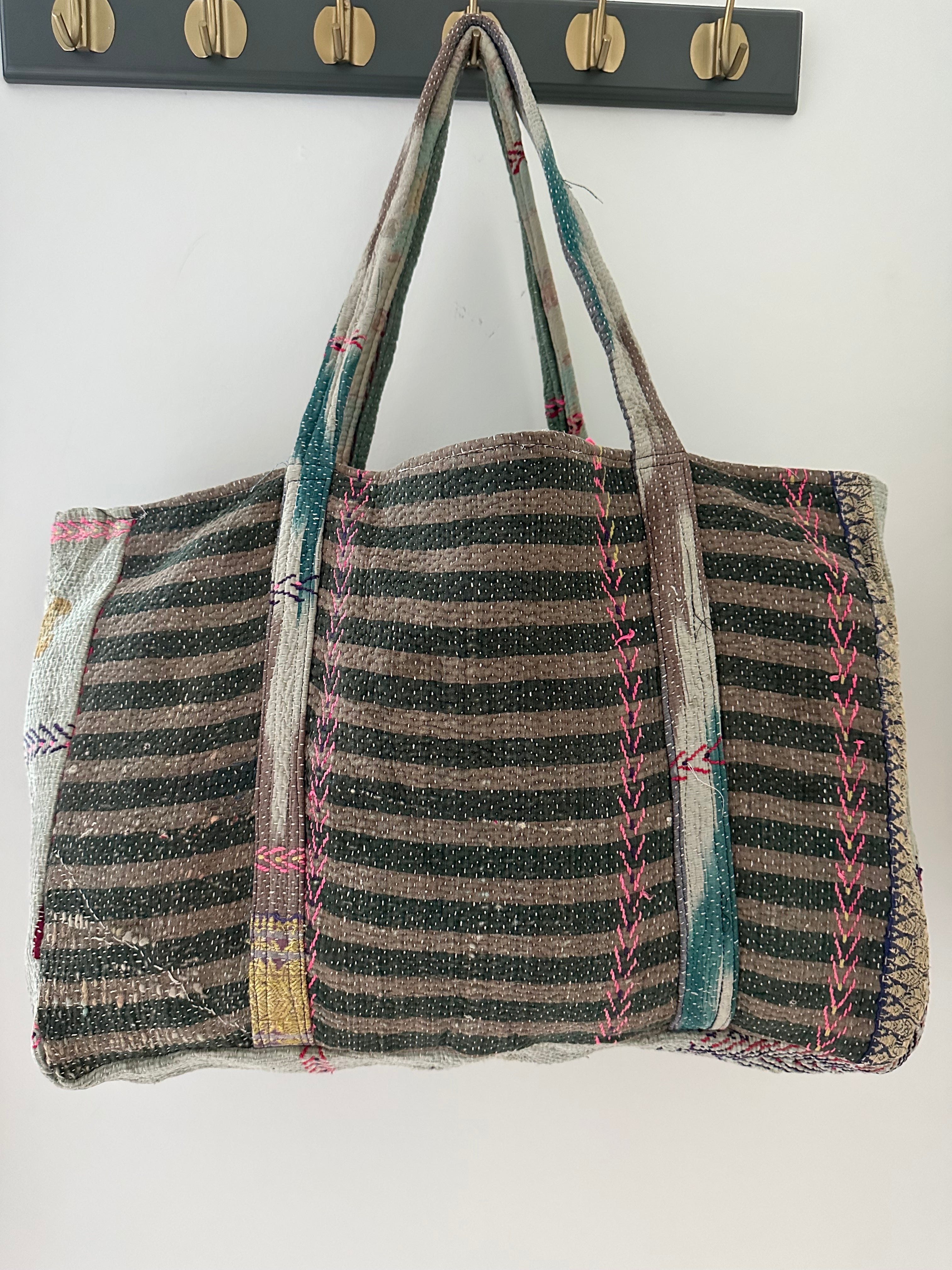 Handcrafted from vibrant, upcycled fabrics using the traditional Indian Kantha stitching technique, this one-of-a-kind tote combines style, sustainability, and practicality.