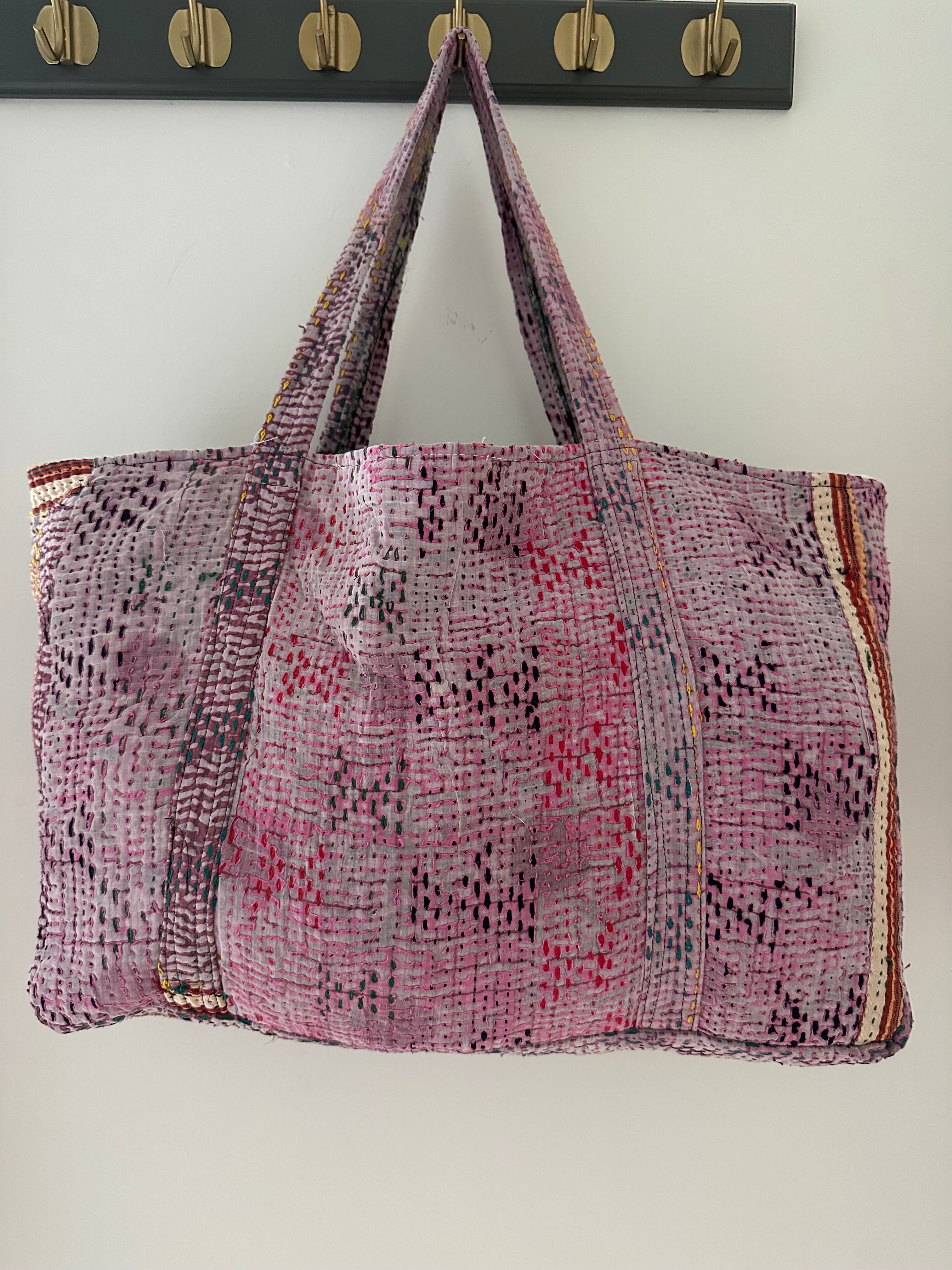 Handcrafted from vibrant, upcycled fabrics using the traditional Indian Kantha stitching technique, this one-of-a-kind tote combines style, sustainability, and practicality.