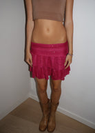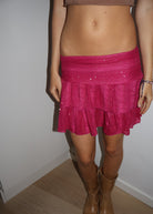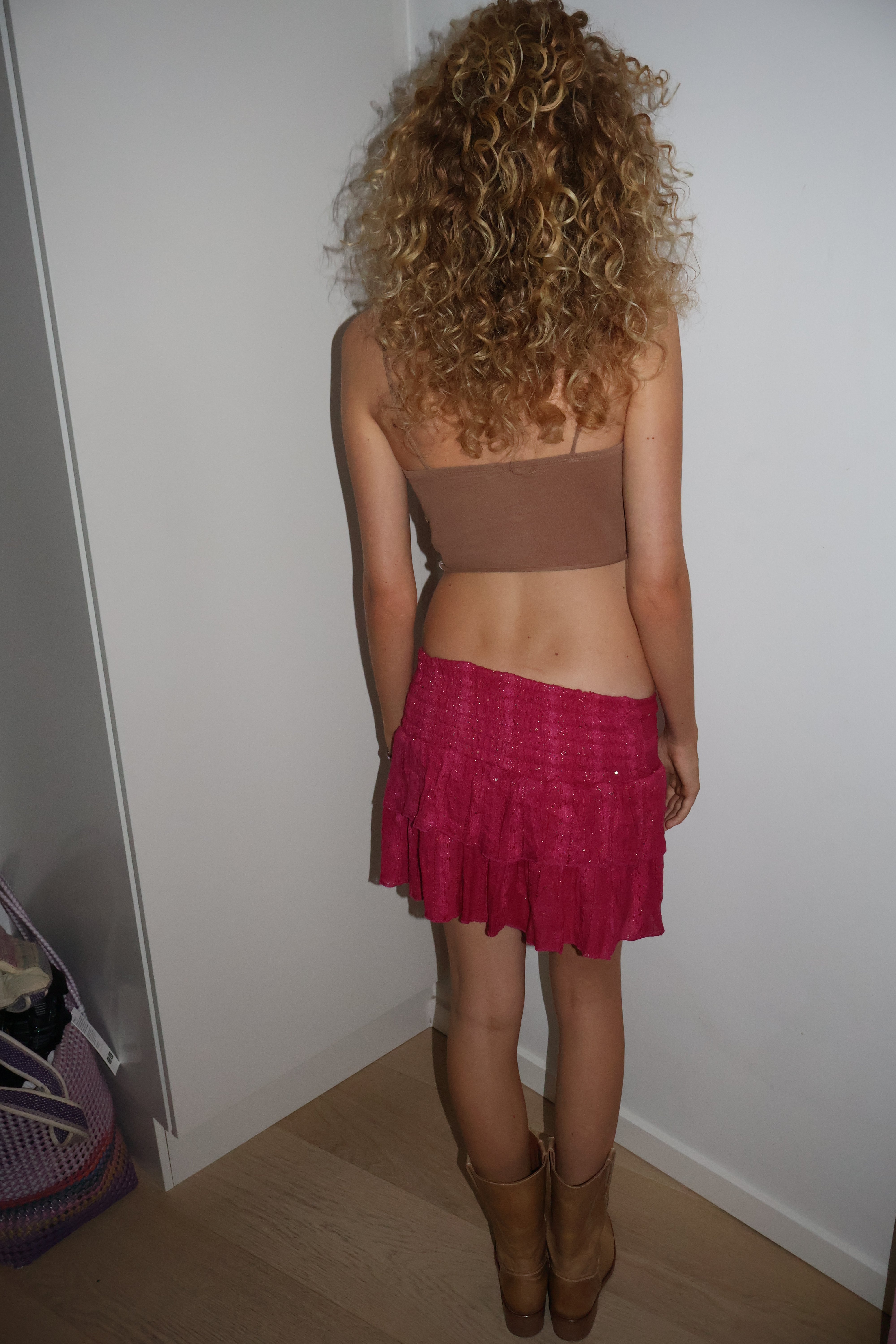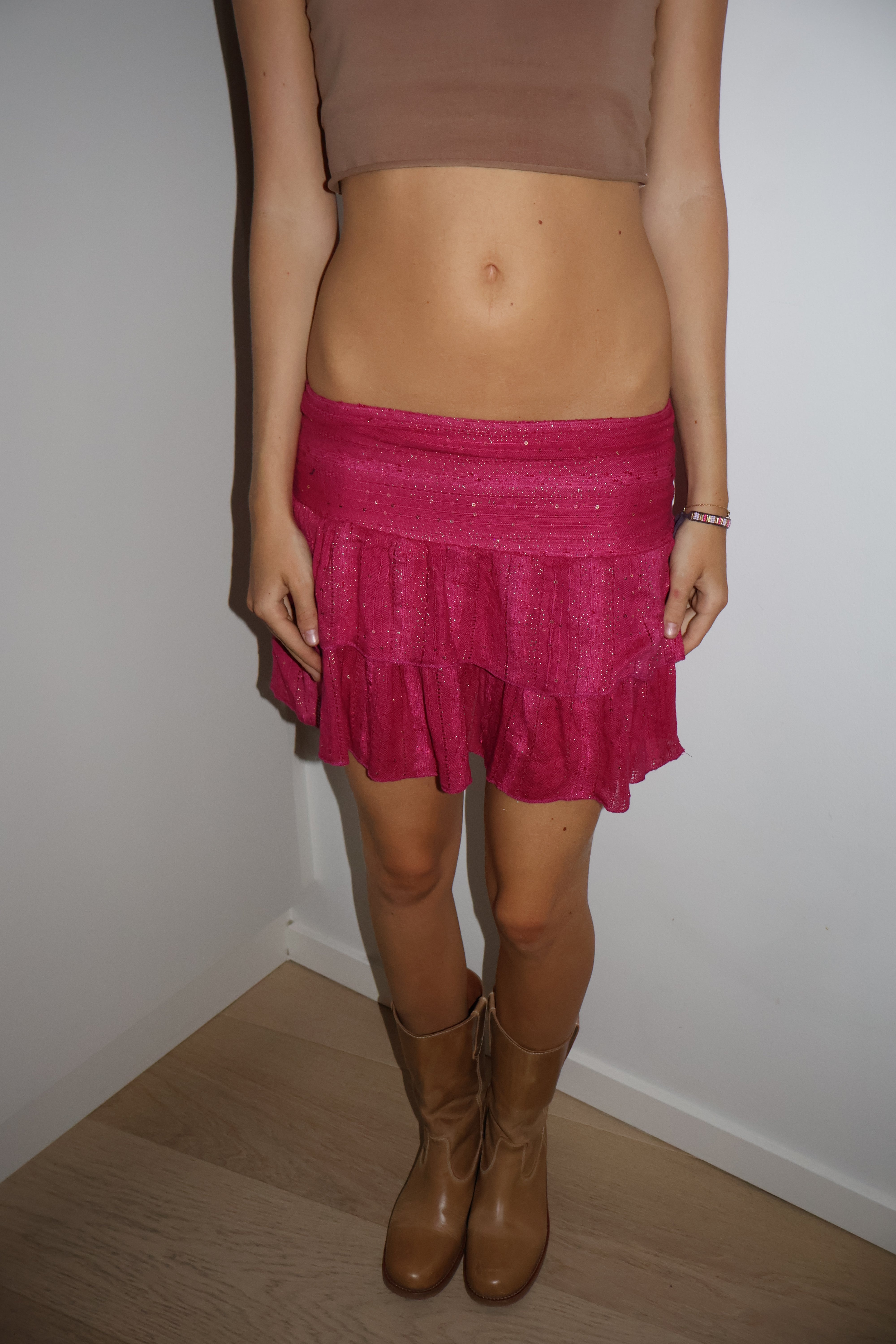 Turn heads in this flirty, tiered mini skirt with subtle gold sparkles that shimmer with every move. Designed with a soft, stretchy waistband, it fits sizes XS to M comfortably. Perfect for summer nights, beach days, or festivals.