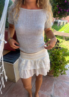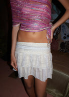 Turn heads in this flirty, tiered mini skirt with subtle gold sparkles that shimmer with every move. Designed with a soft, stretchy waistband, it fits sizes XS to M comfortably. Perfect for summer nights, beach days, or festivals.