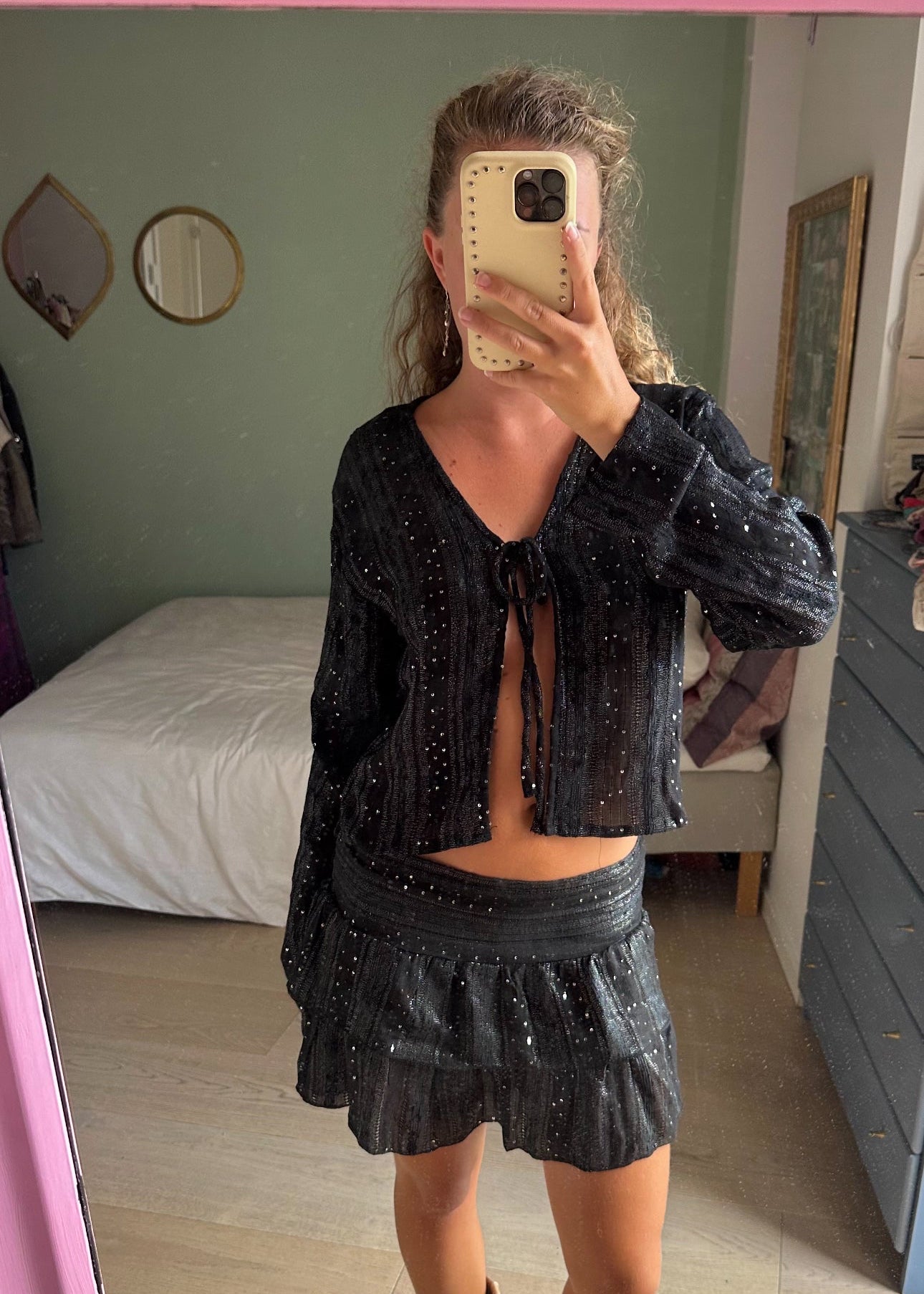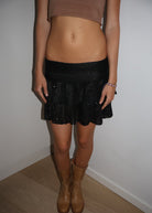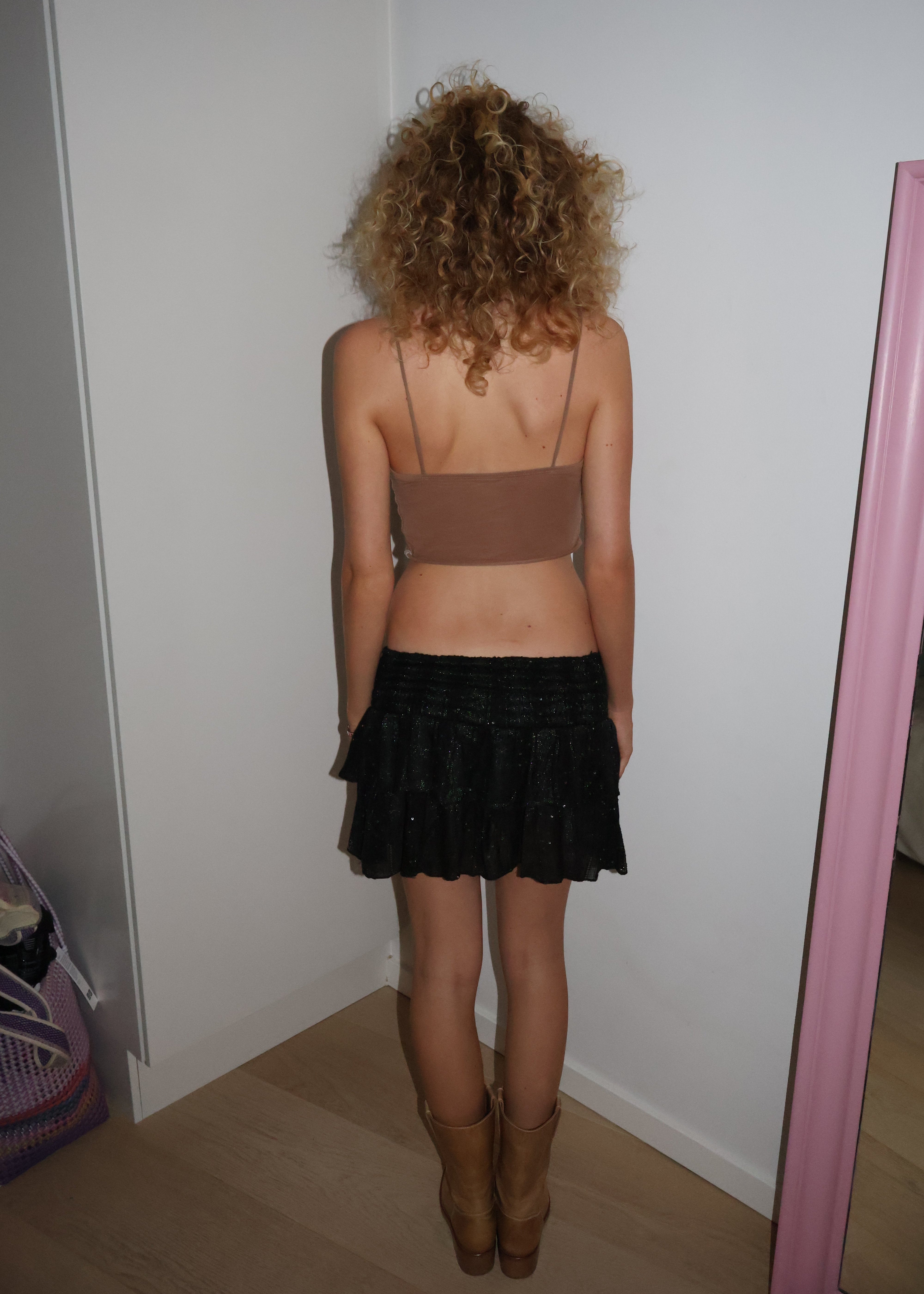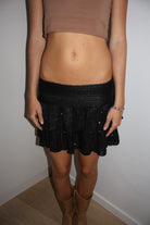 Turn heads in this flirty, tiered mini skirt with subtle gold sparkles that shimmer with every move. Designed with a soft, stretchy waistband, it fits sizes XS to M comfortably. Perfect for summer nights, beach days, or festivals.