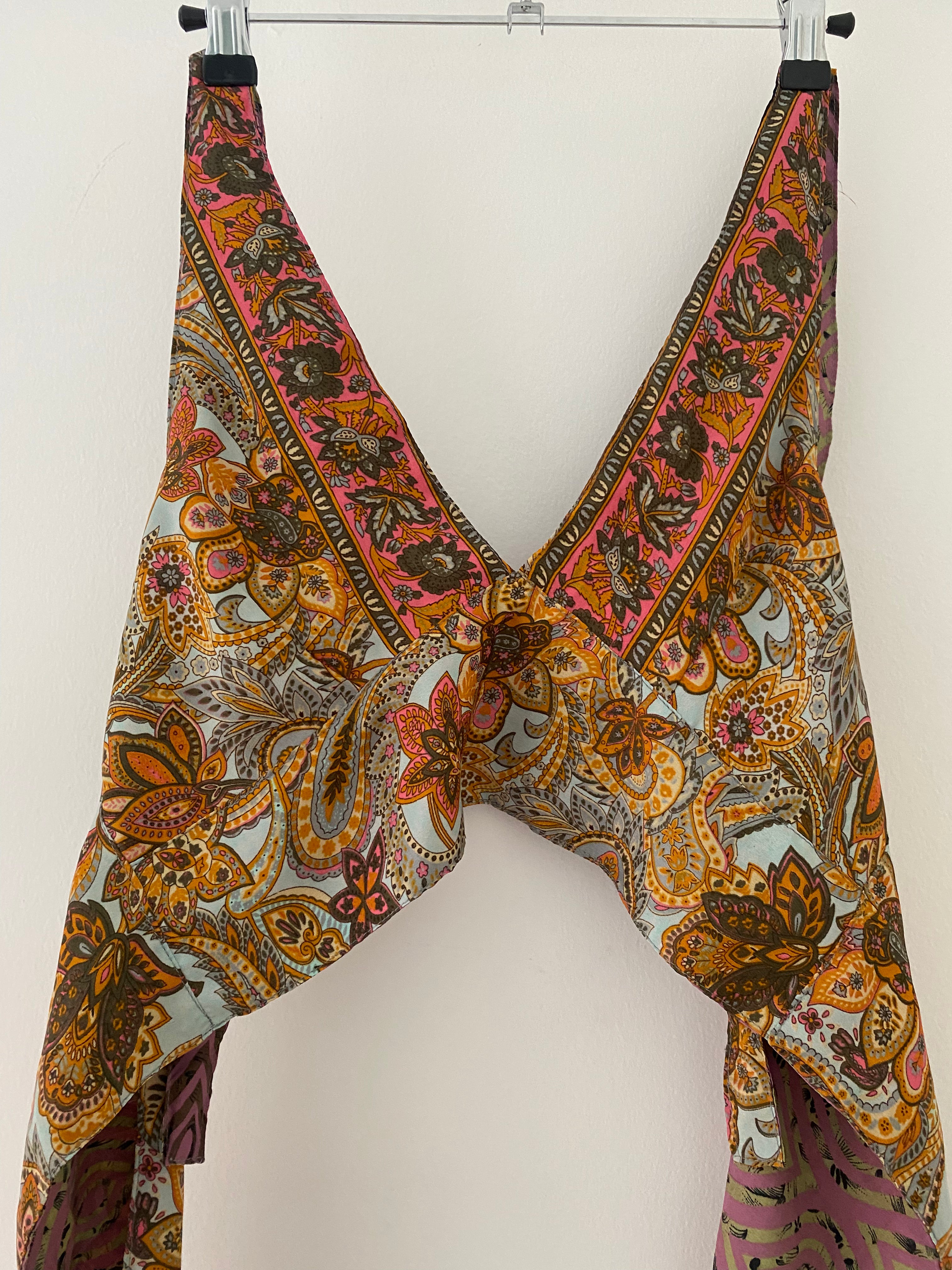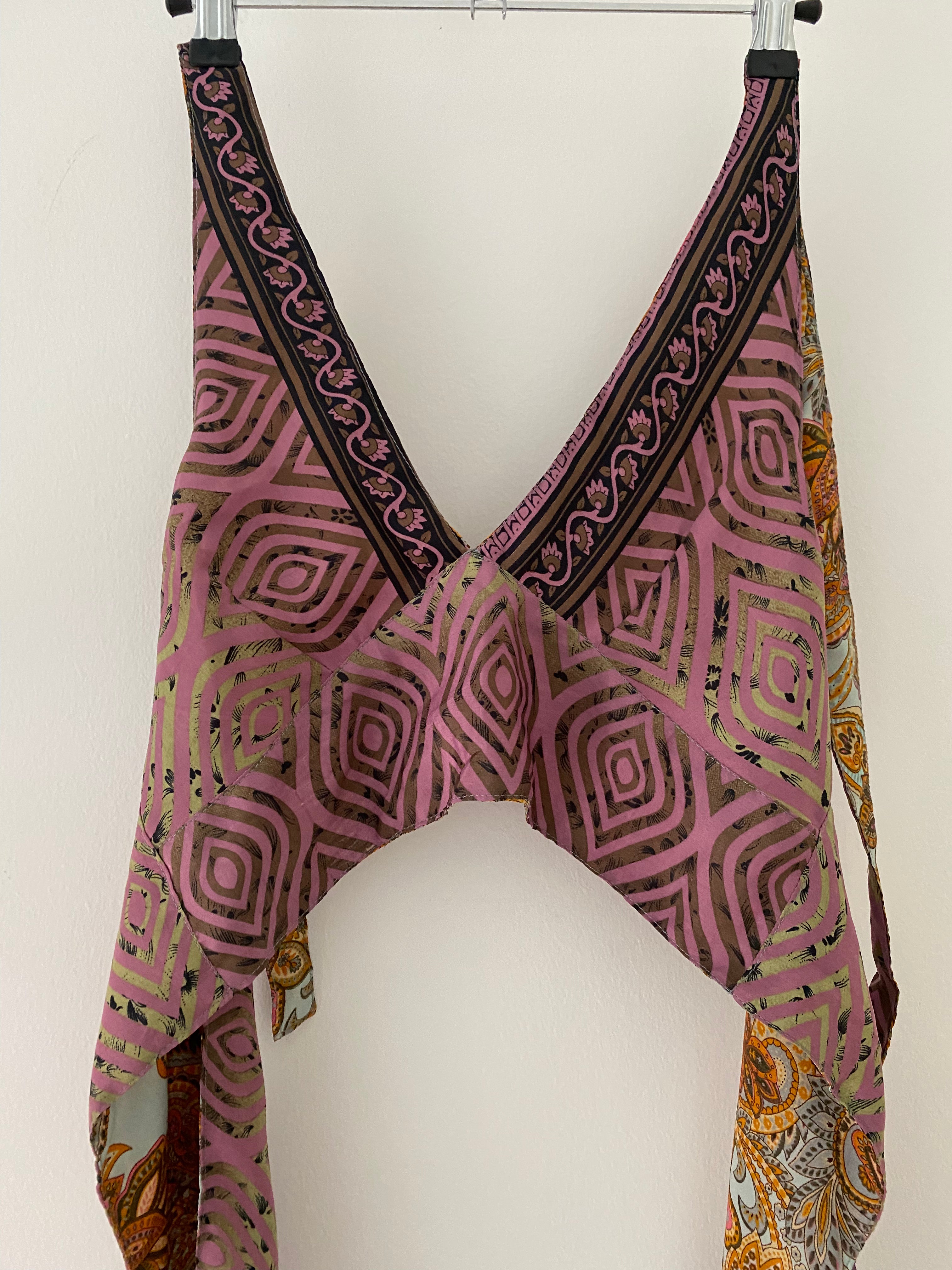This Vintage Silk Reversible Top is the perfect blend of style and versatility. The one-size-fits-all design makes it a versatile piece that can be worn by anyone, while the reversible design allows for two distinct looks in one. Made of high-quality vintage silk, this top is soft, smooth, and comfortable against the skin.