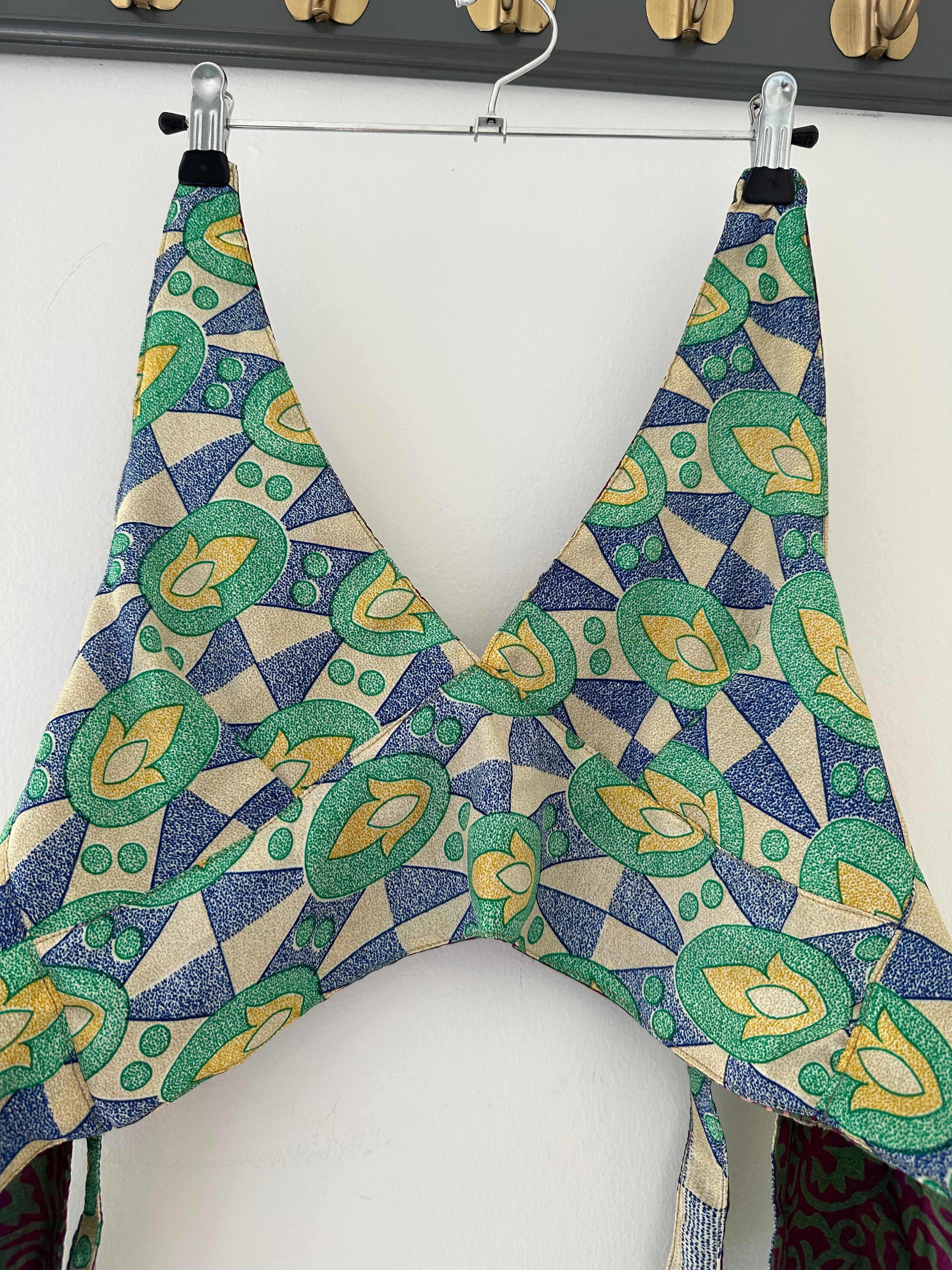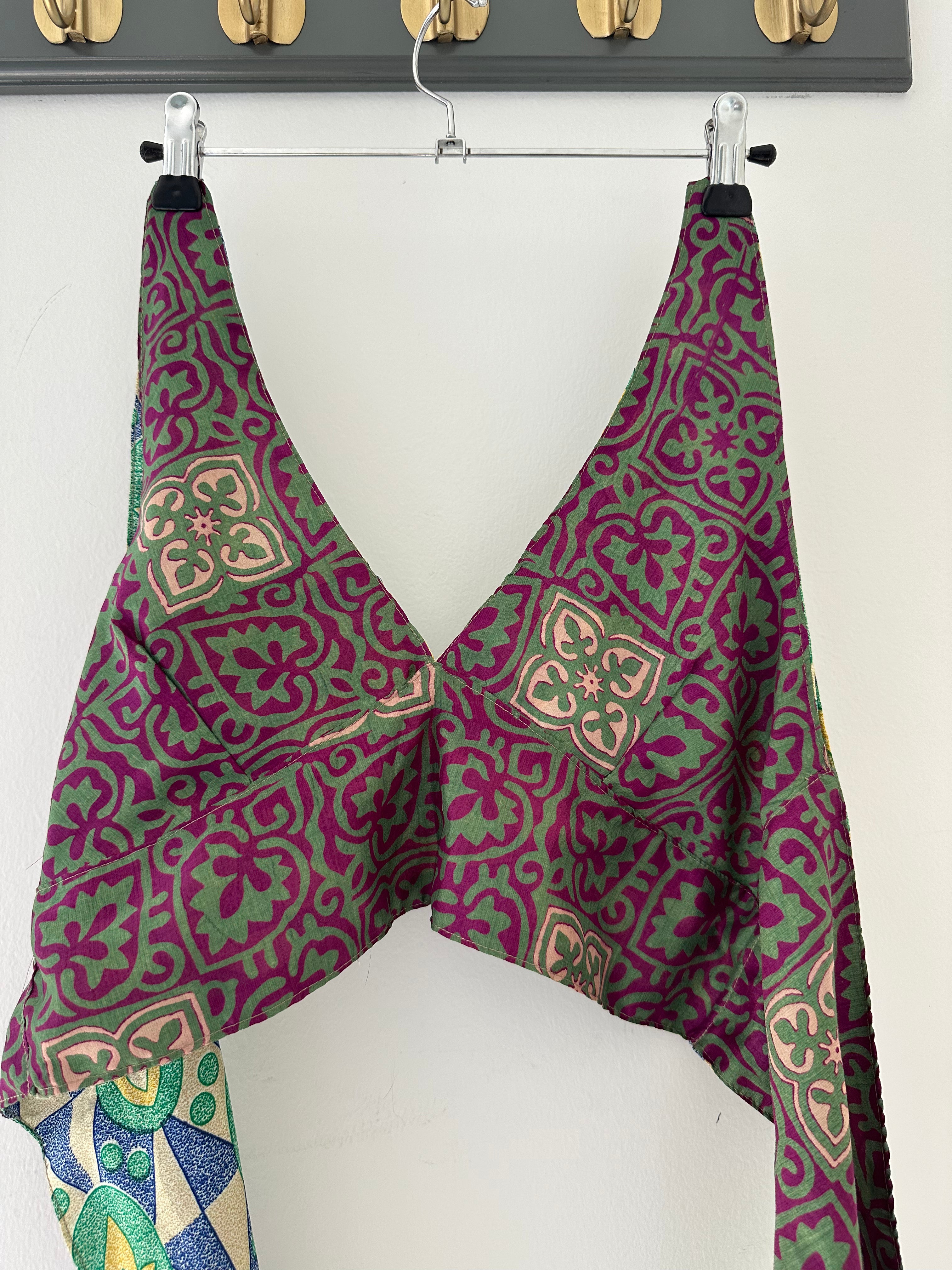 This Vintage Silk Reversible Top is the perfect blend of style and versatility. The one-size-fits-all design makes it a versatile piece that can be worn by anyone, while the reversible design allows for two distinct looks in one. Made of high-quality vintage silk, this top is soft, smooth, and comfortable against the skin.