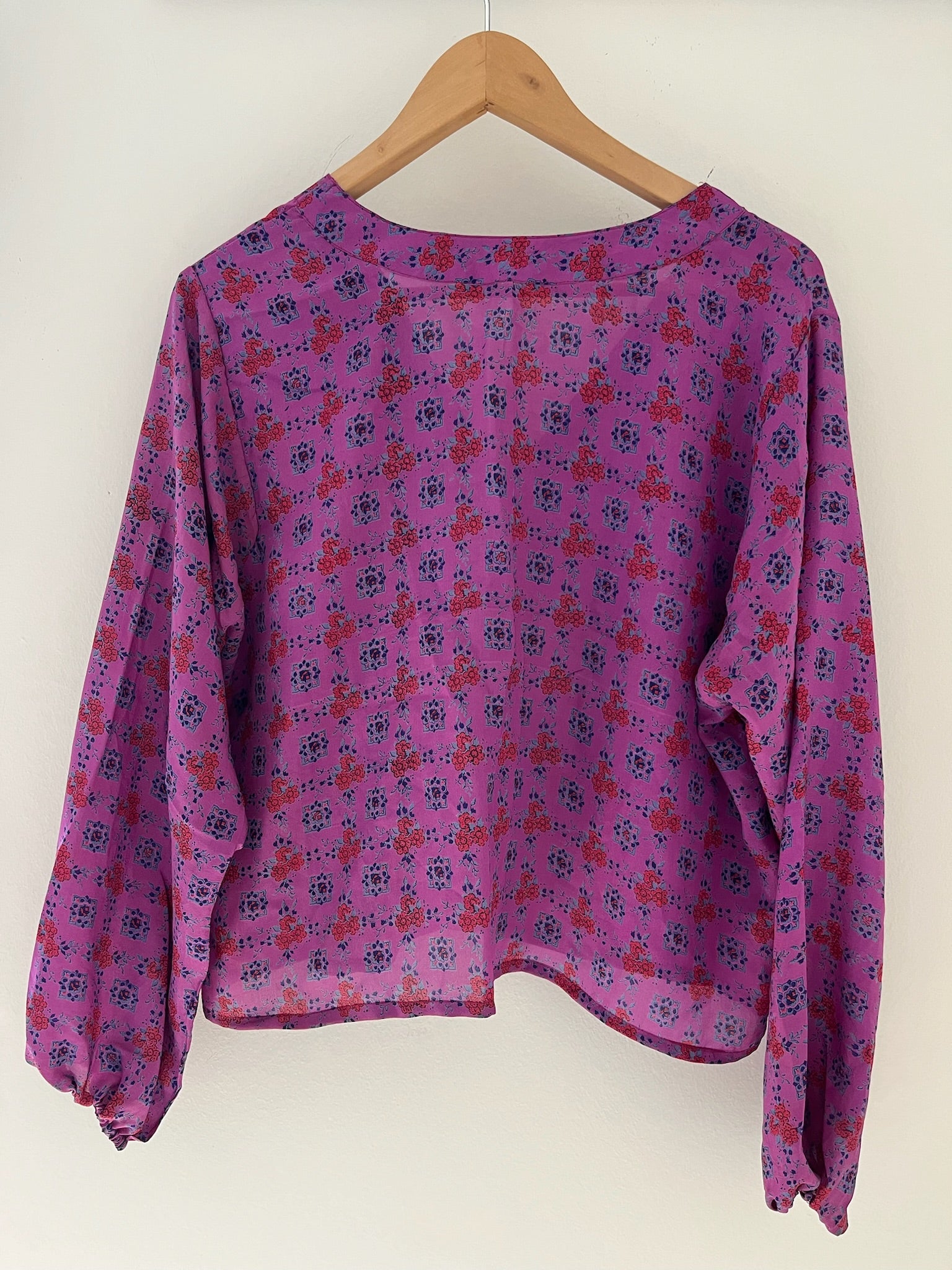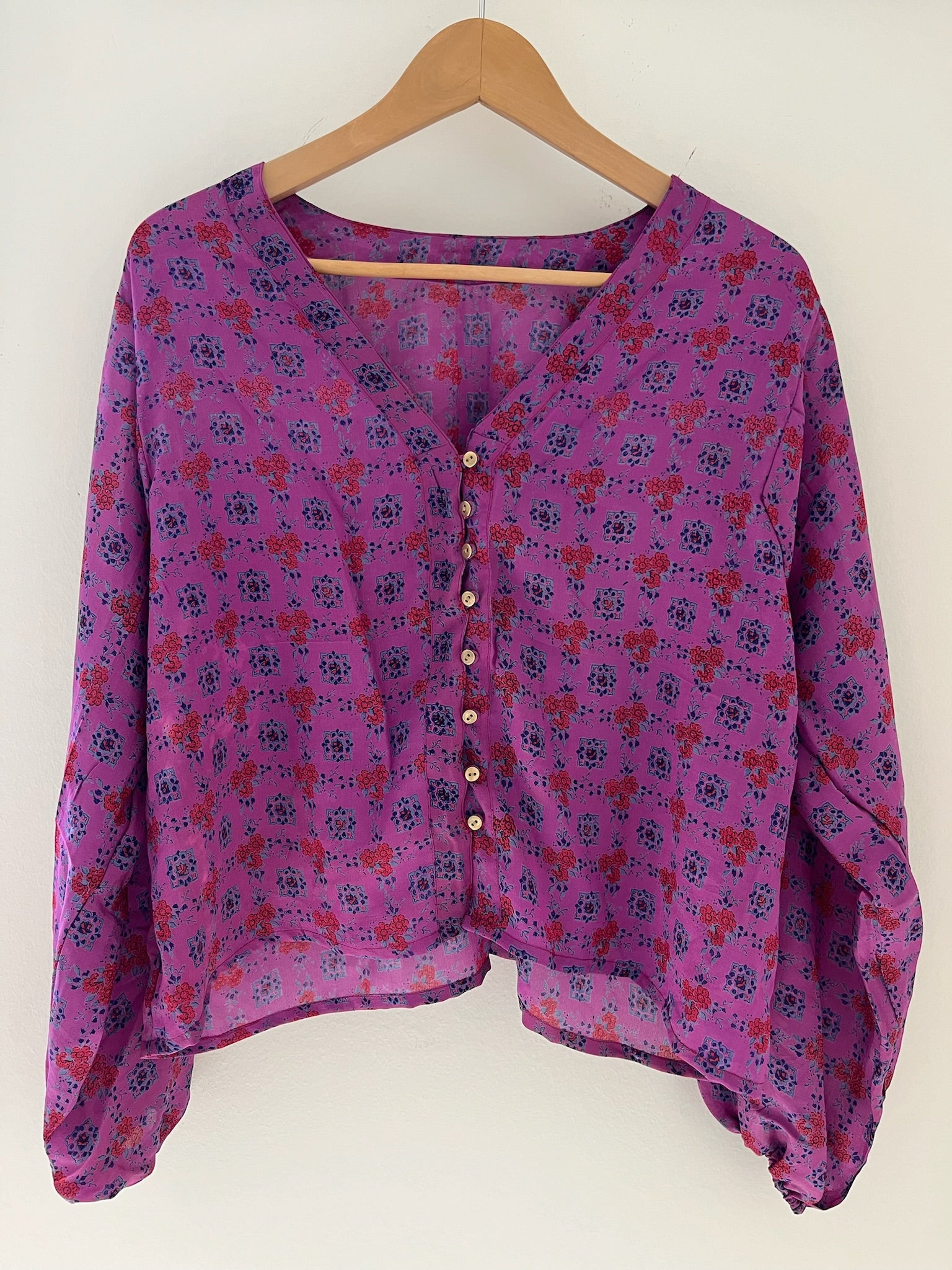 This vibrant silk shirt is crafted from a patchwork of vintage Indian saris - there is only one of each design. Artfully tailored with a relaxed collar, long sleeves, and 100% brass buttons, it exudes bohemian flair. The cropped 55cm length pairs perfectly with high or low-waisted bottoms. Lightweight 100% silk makes it an eco-friendly layer for any occasion. Each sari tells a story through its unique colours and patterns woven over decades by skilled artisans. Handpicked by the designer,  Liva Larsen, each shirt is a sustainable treasure overflowing with rich Indian textile heritage. Don't miss your chance to own this coveted artisan piece. It's the perfect layering piece for transitional seasons.
