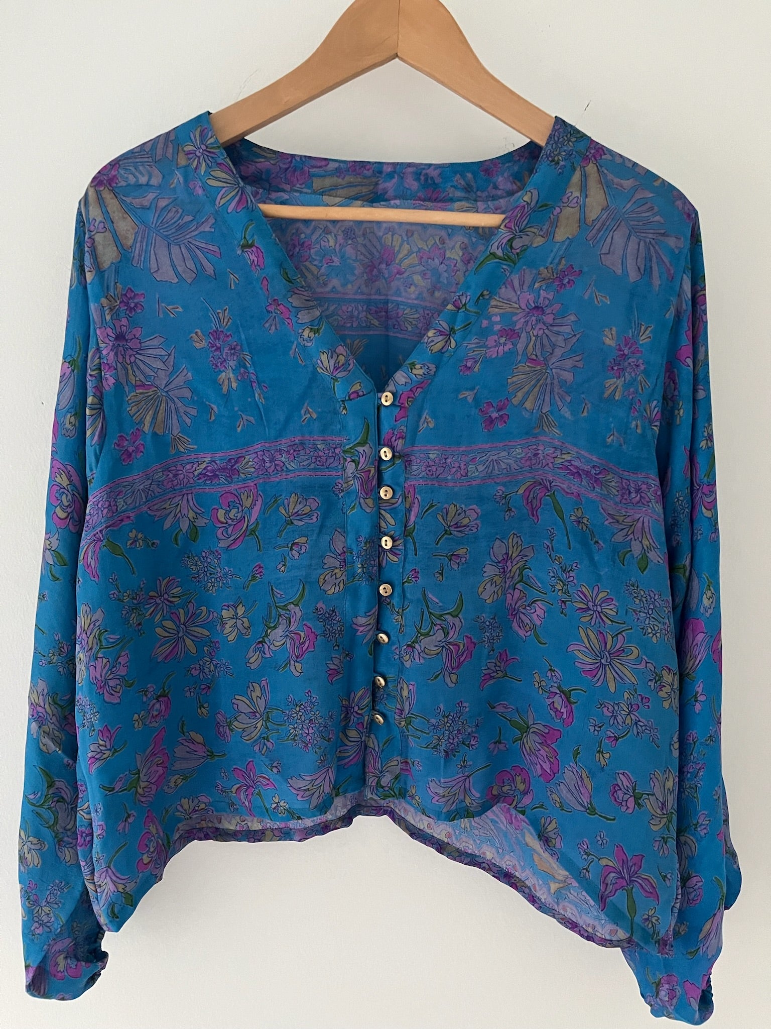 This vibrant silk shirt is crafted from a patchwork of vintage Indian saris - there is only one of each design. Artfully tailored with a relaxed collar, long sleeves, and 100% brass buttons, it exudes bohemian flair. The cropped 55cm length pairs perfectly with high or low-waisted bottoms. Lightweight 100% silk makes it an eco-friendly layer for any occasion. Each sari tells a story through its unique colours and patterns woven over decades by skilled artisans. Handpicked by the designer,  Liva Larsen, each shirt is a sustainable treasure overflowing with rich Indian textile heritage. Don't miss your chance to own this coveted artisan piece. It's the perfect layering piece for transitional seasons.