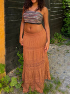 The Copper Maxi Skirt is a bohemian dream come to life. Crafted from breathable 100% cotton deadstock fabric, this one-size skirt (fits sizes 32-40) combines comfort, style, and sustainability. Its warm terracotta hue, intricate lace detailing, and tiered design make it the perfect choice for adding a natural, effortless vibe to your wardrobe.