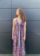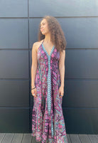 The Long Frill Viola dress is a stunning purple garment that combines both comfort and adjustability. It features an open back design and is attached with a few strings around the neck and back, allowing for a customized fit. The dress is crafted from a luxurious blend of 70% silk and 30% viscose, which ensures not only comfort but also a beautiful drape.
