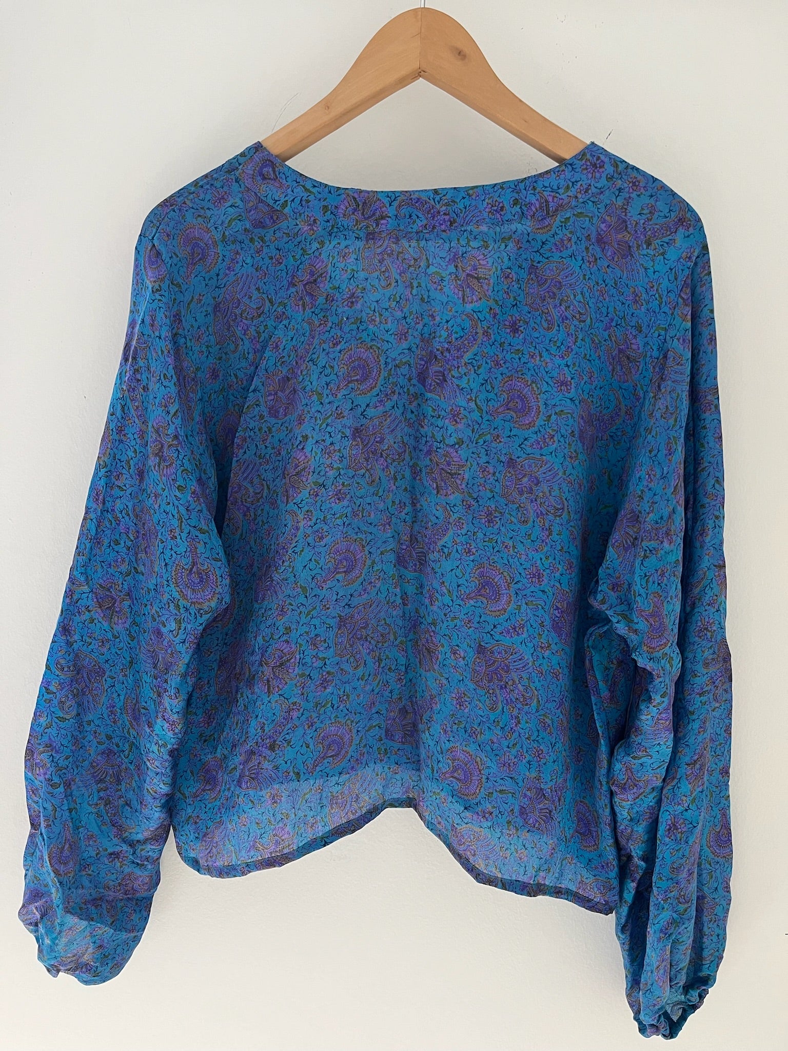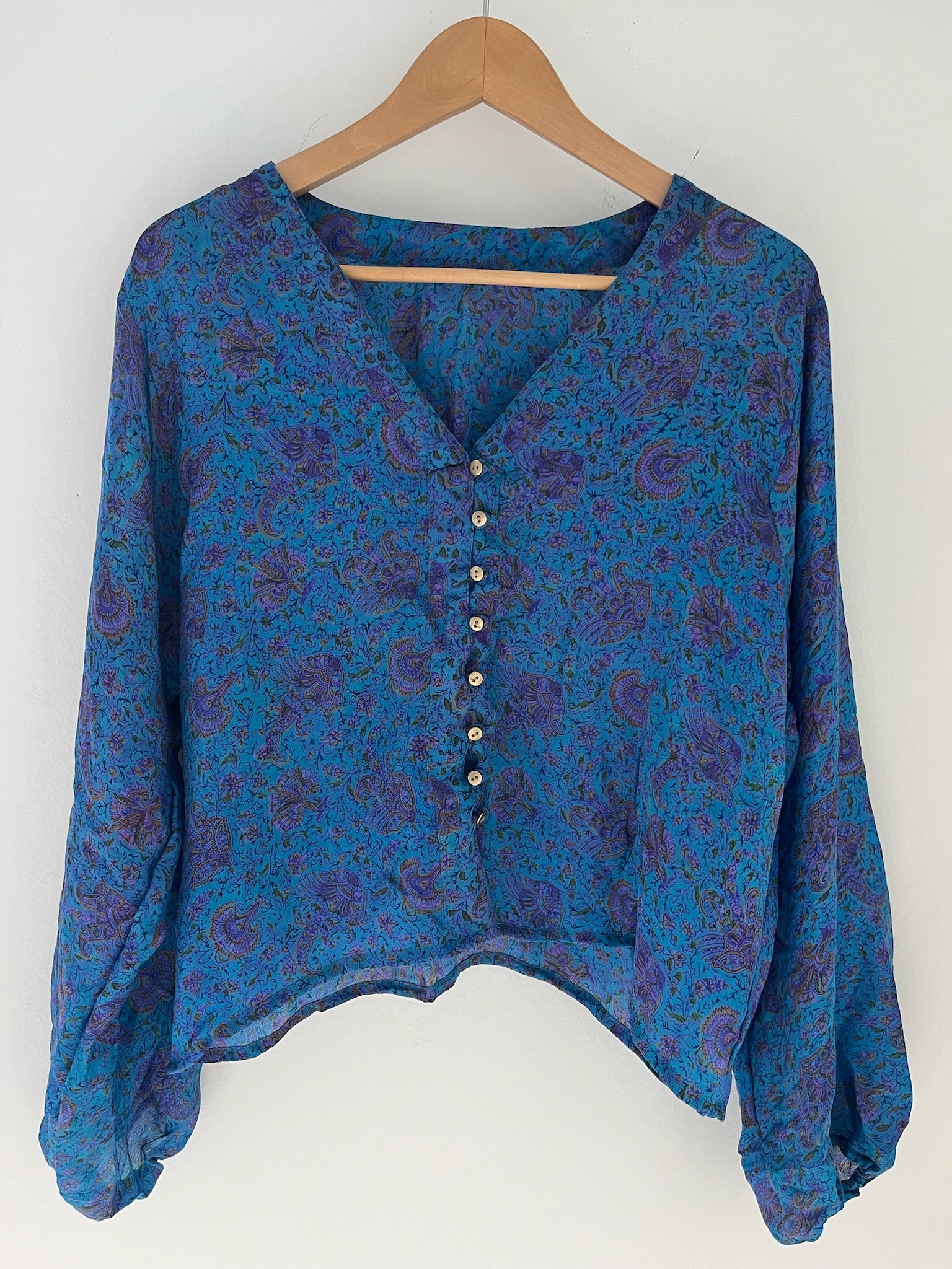 This vibrant silk shirt is crafted from a patchwork of vintage Indian saris - there is only one of each design. Artfully tailored with a relaxed collar, long sleeves, and 100% brass buttons, it exudes bohemian flair. The cropped 55cm length pairs perfectly with high or low-waisted bottoms. Lightweight 100% silk makes it an eco-friendly layer for any occasion. Each sari tells a story through its unique colours and patterns woven over decades by skilled artisans. Handpicked by the designer,  Liva Larsen, each shirt is a sustainable treasure overflowing with rich Indian textile heritage. Don't miss your chance to own this coveted artisan piece. It's the perfect layering piece for transitional seasons.