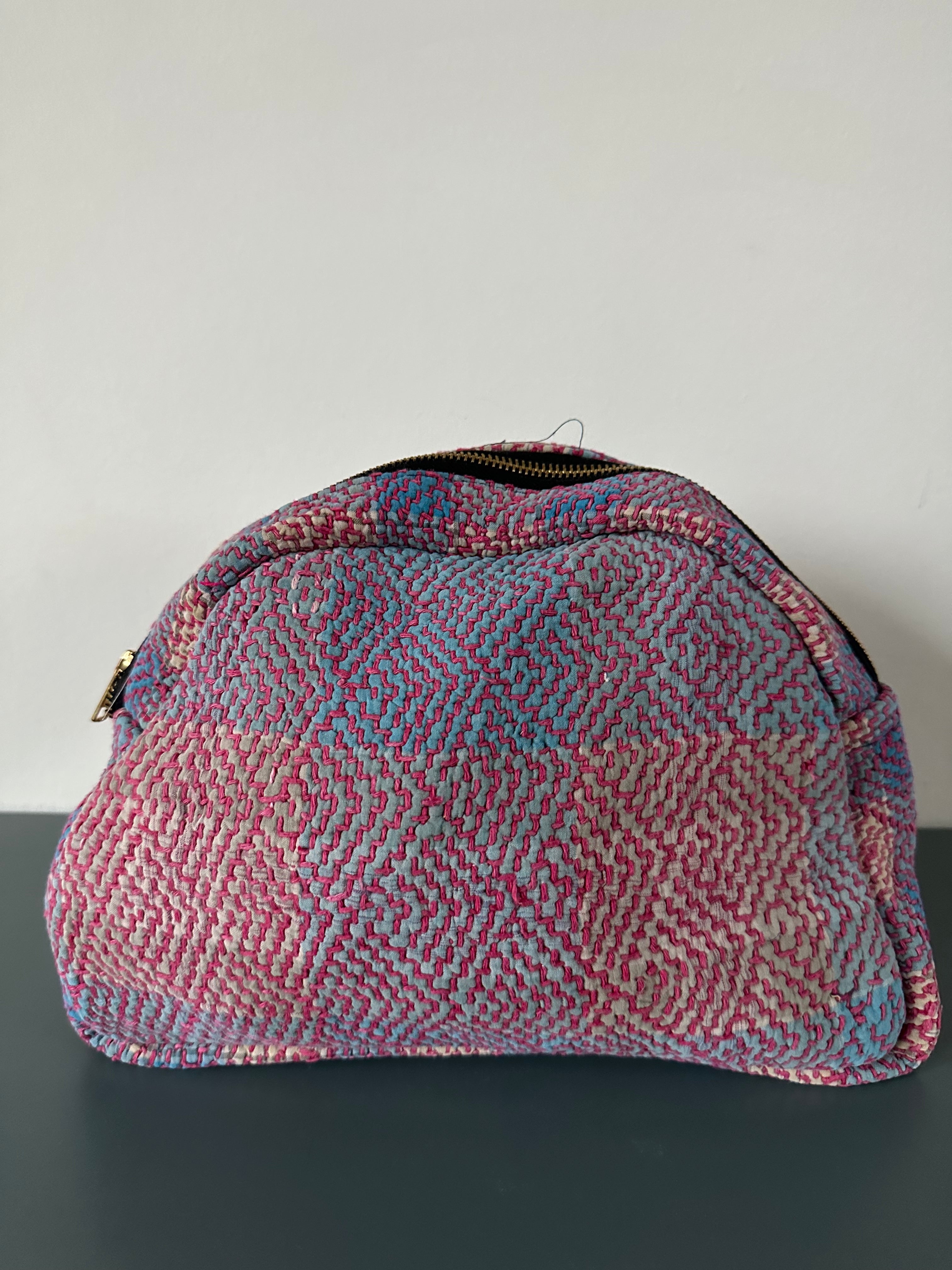 One-of-a-kind upcycled makeup or toiletry bag made from authentic vintage Indian Kantha blankets. Each piece is handmade and completely unique, with a colourful patchwork design and clutch-style shape.