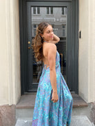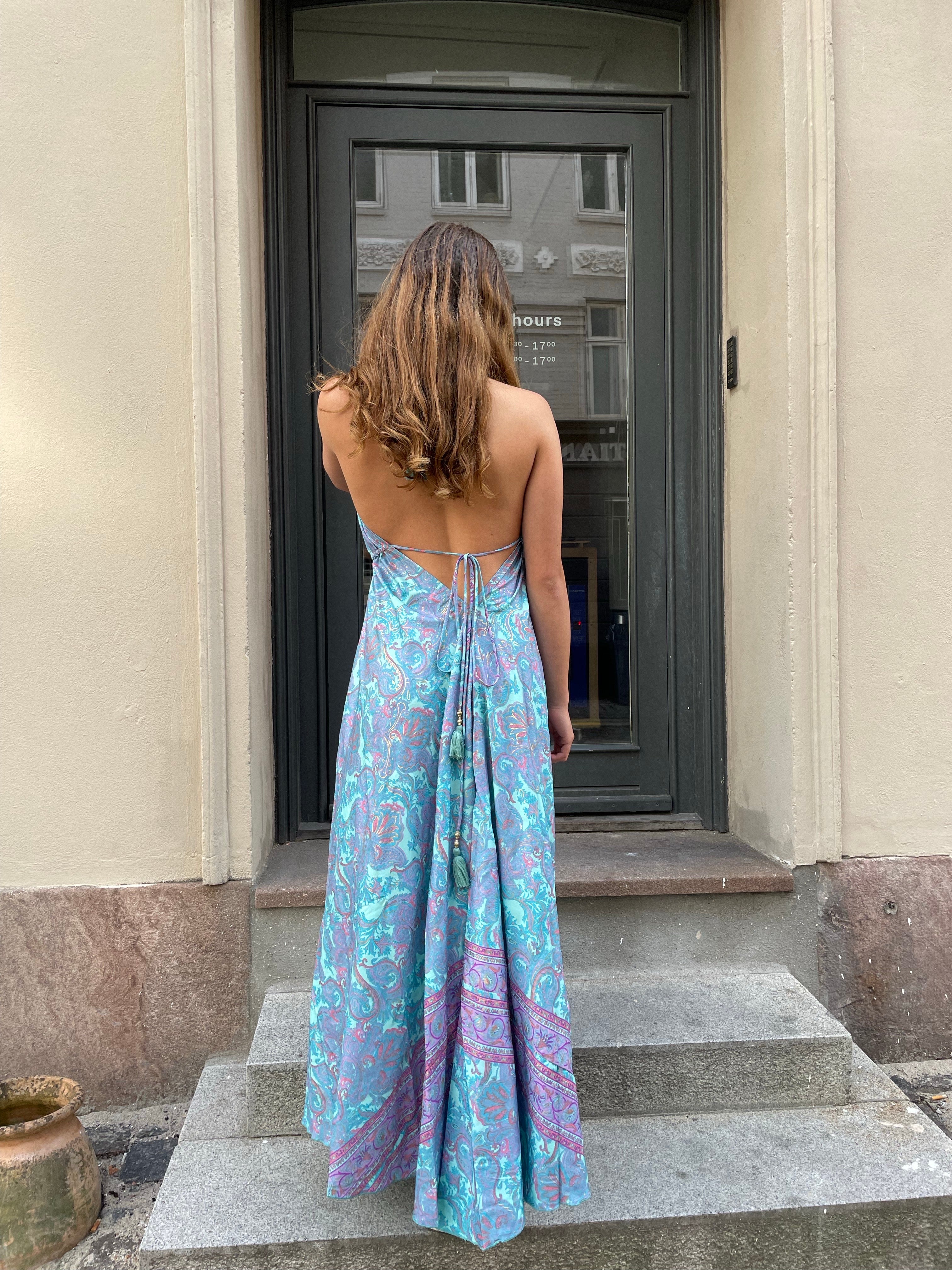 The Long Gold Alma Ibiza dress, is super comfortable and adjustable, it has an open back and is attached with a few strings around the neck and back. The material is made of 70% silk and 30% viscose making it super soft and with a beautiful fall.